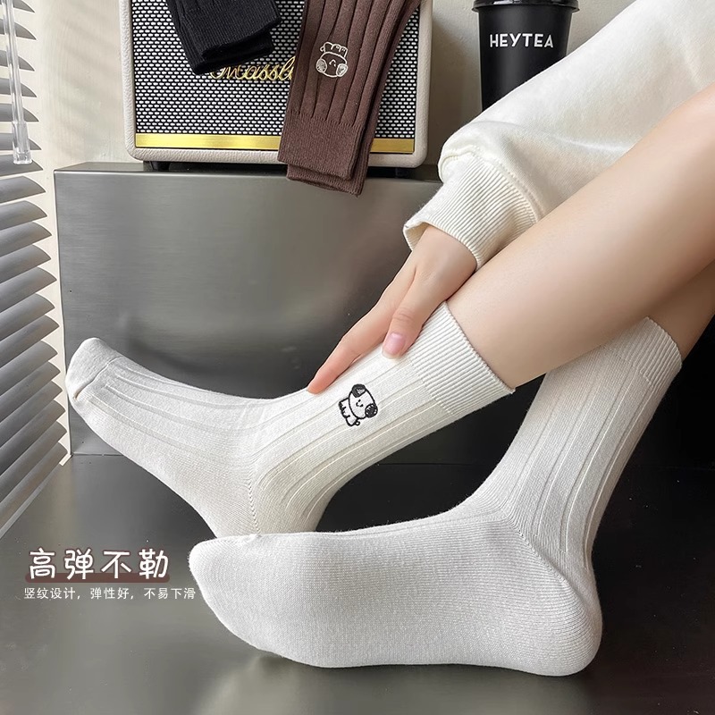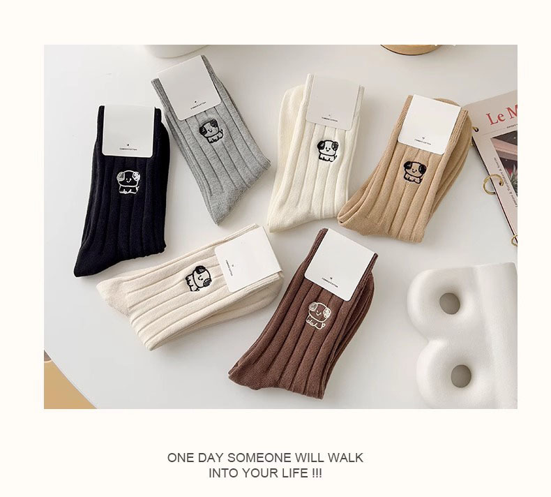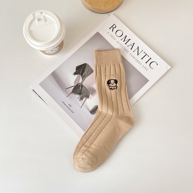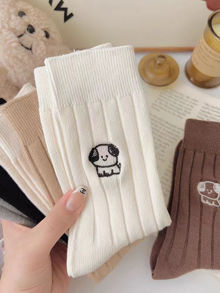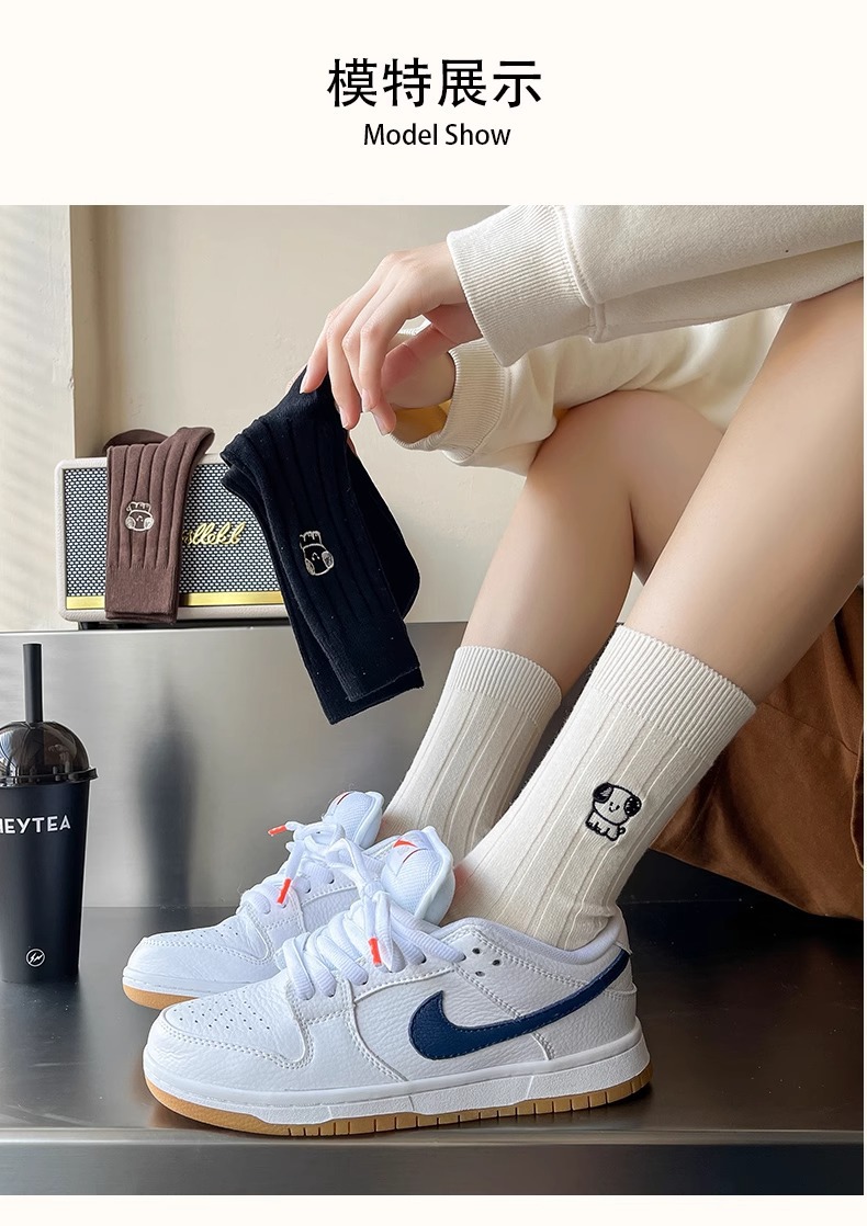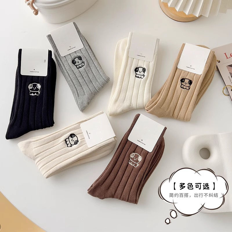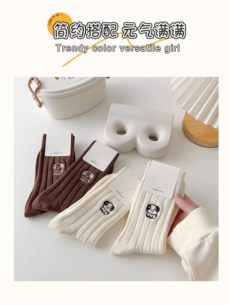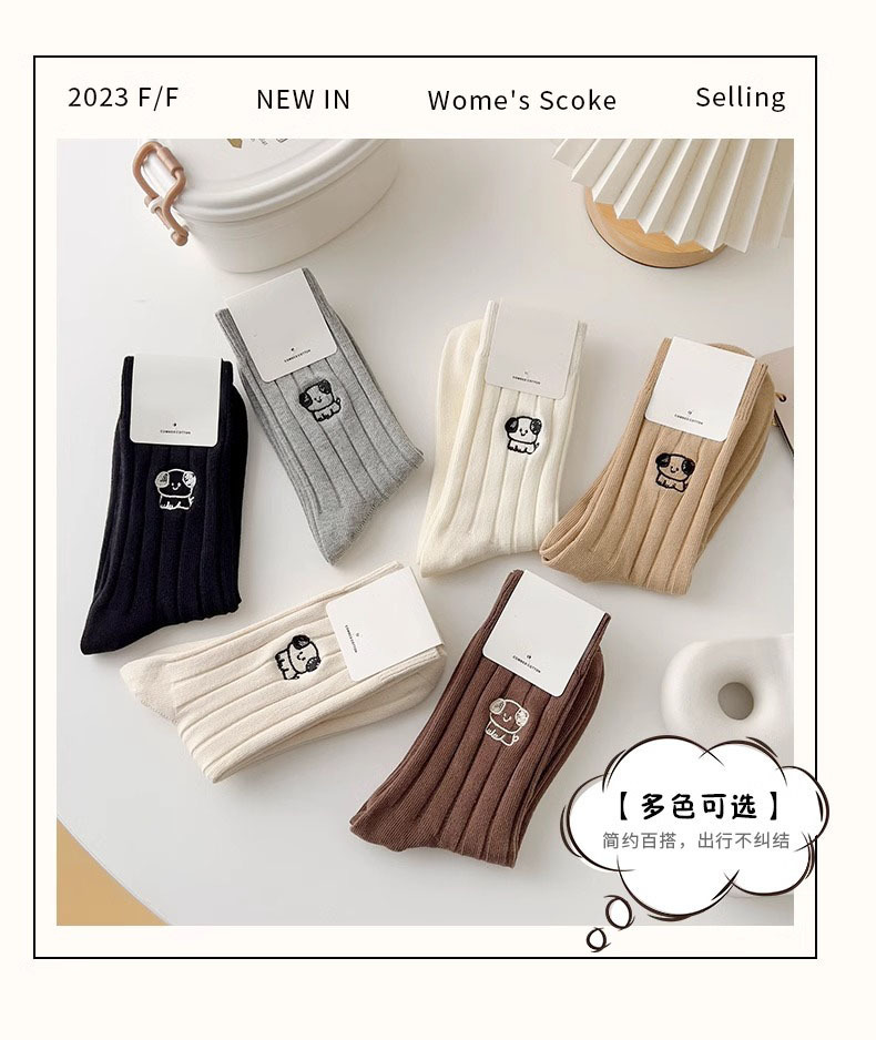 2024秋冬季双针休闲刺绣小狗中筒袜ins潮女生堆堆日系棉袜吸汗