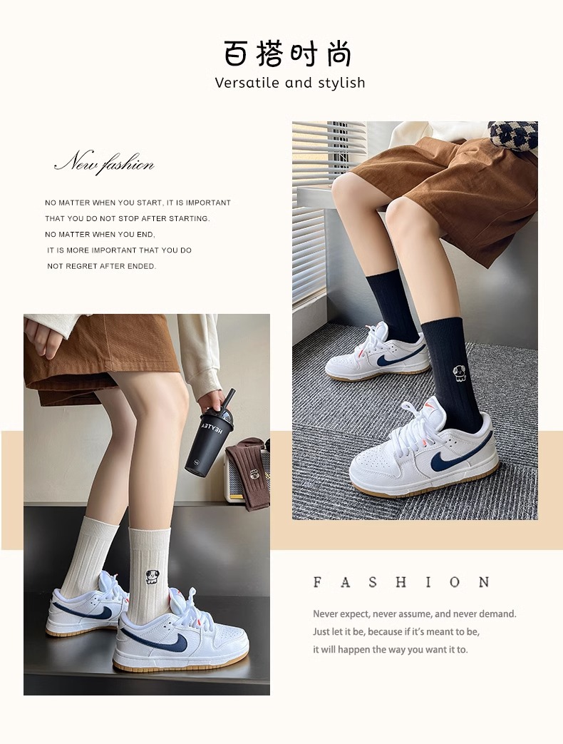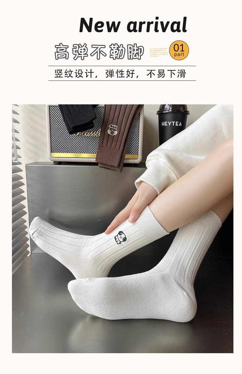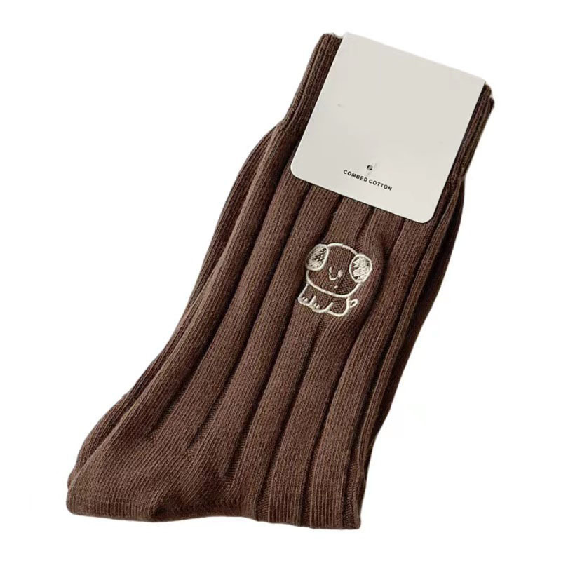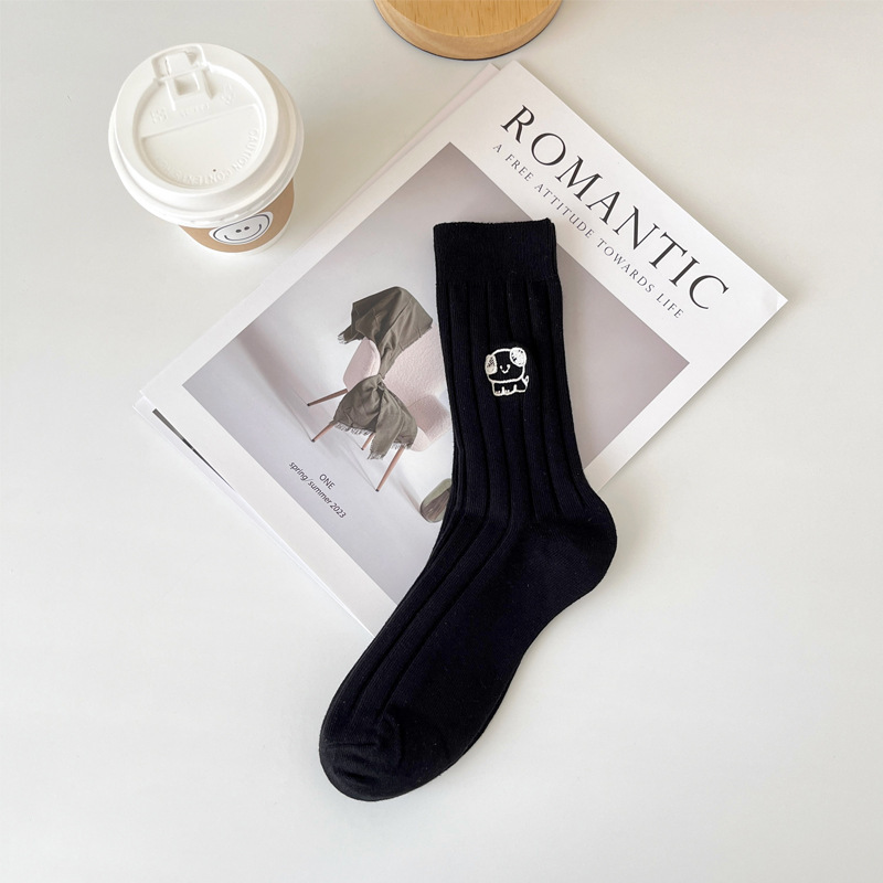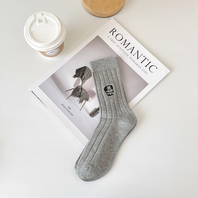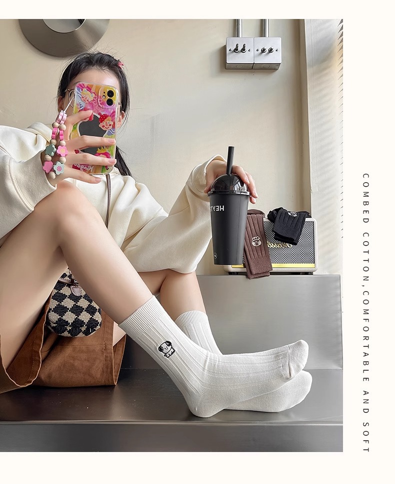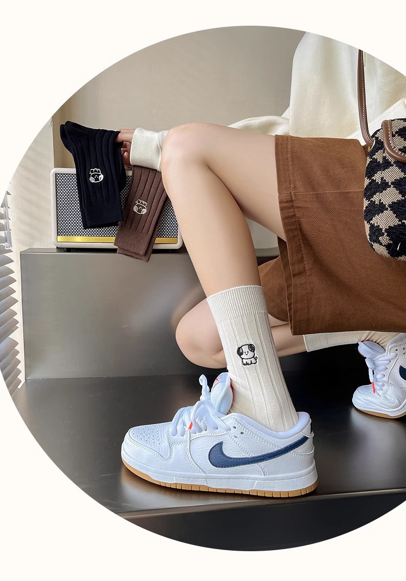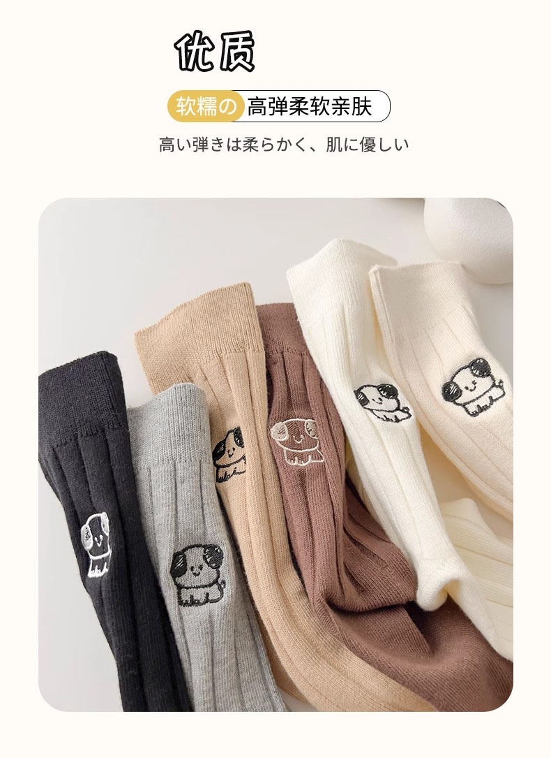 2024秋冬季双针休闲刺绣小狗中筒袜ins潮女生堆堆日系棉袜吸汗