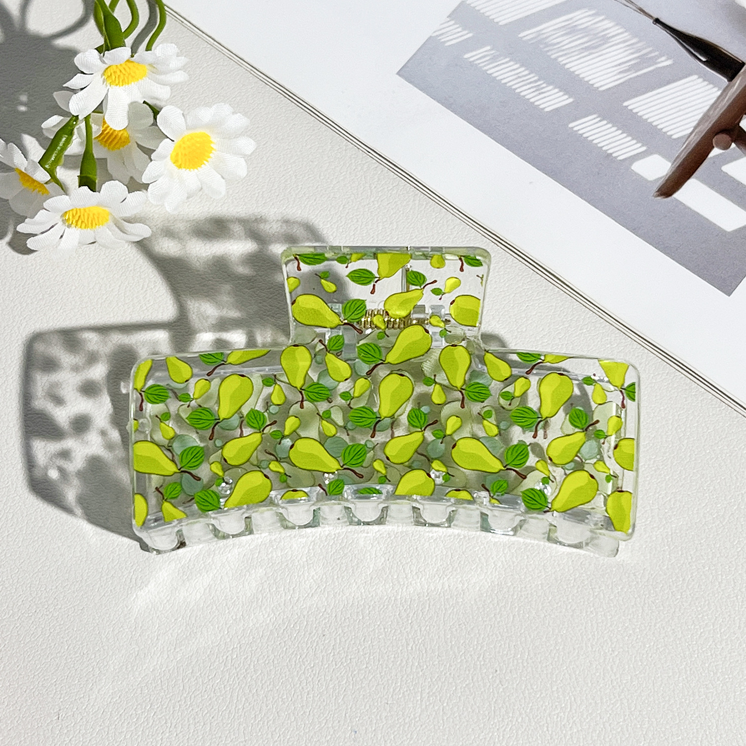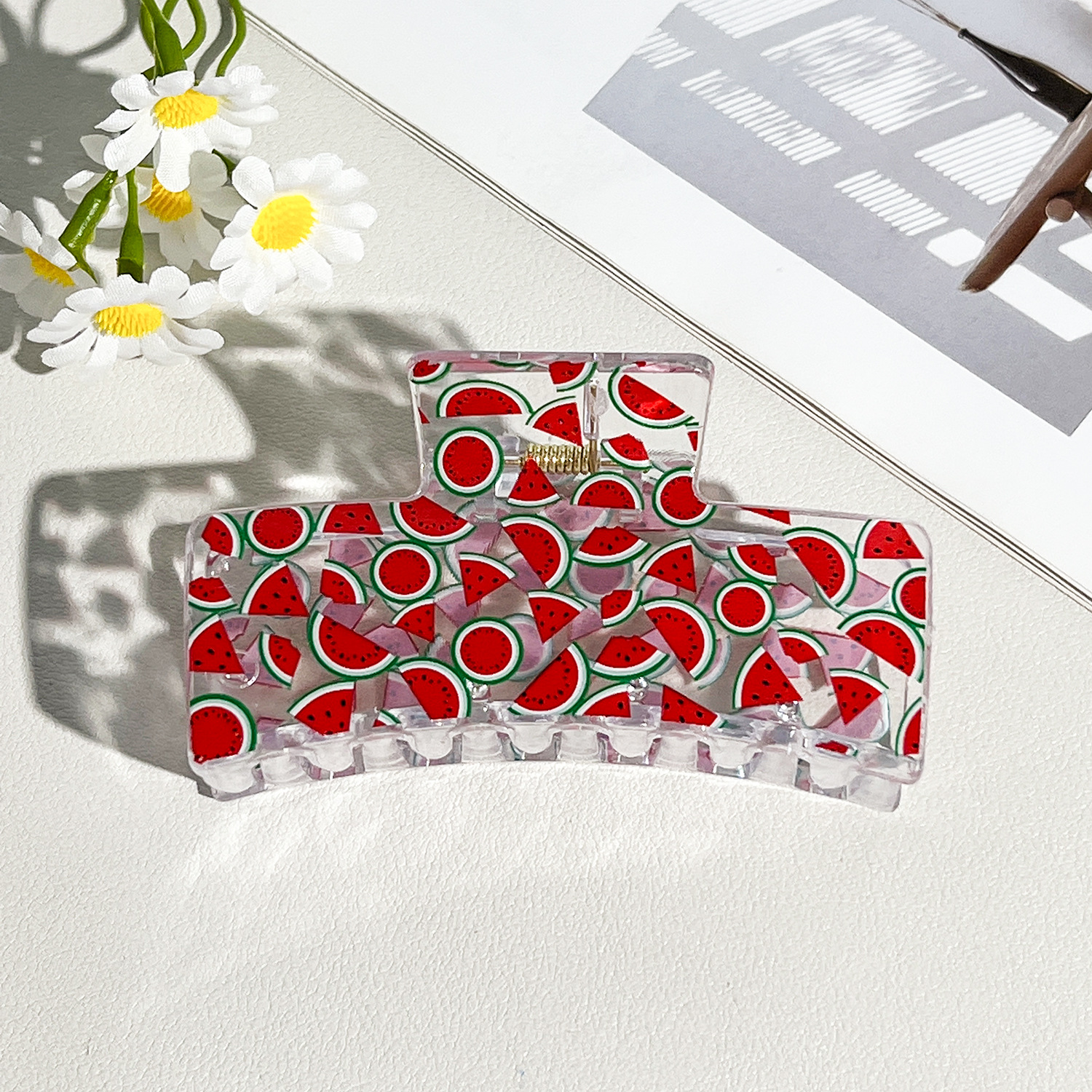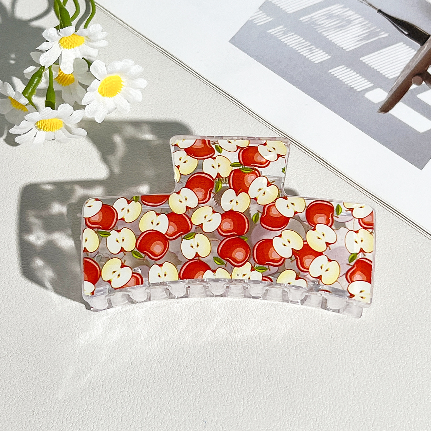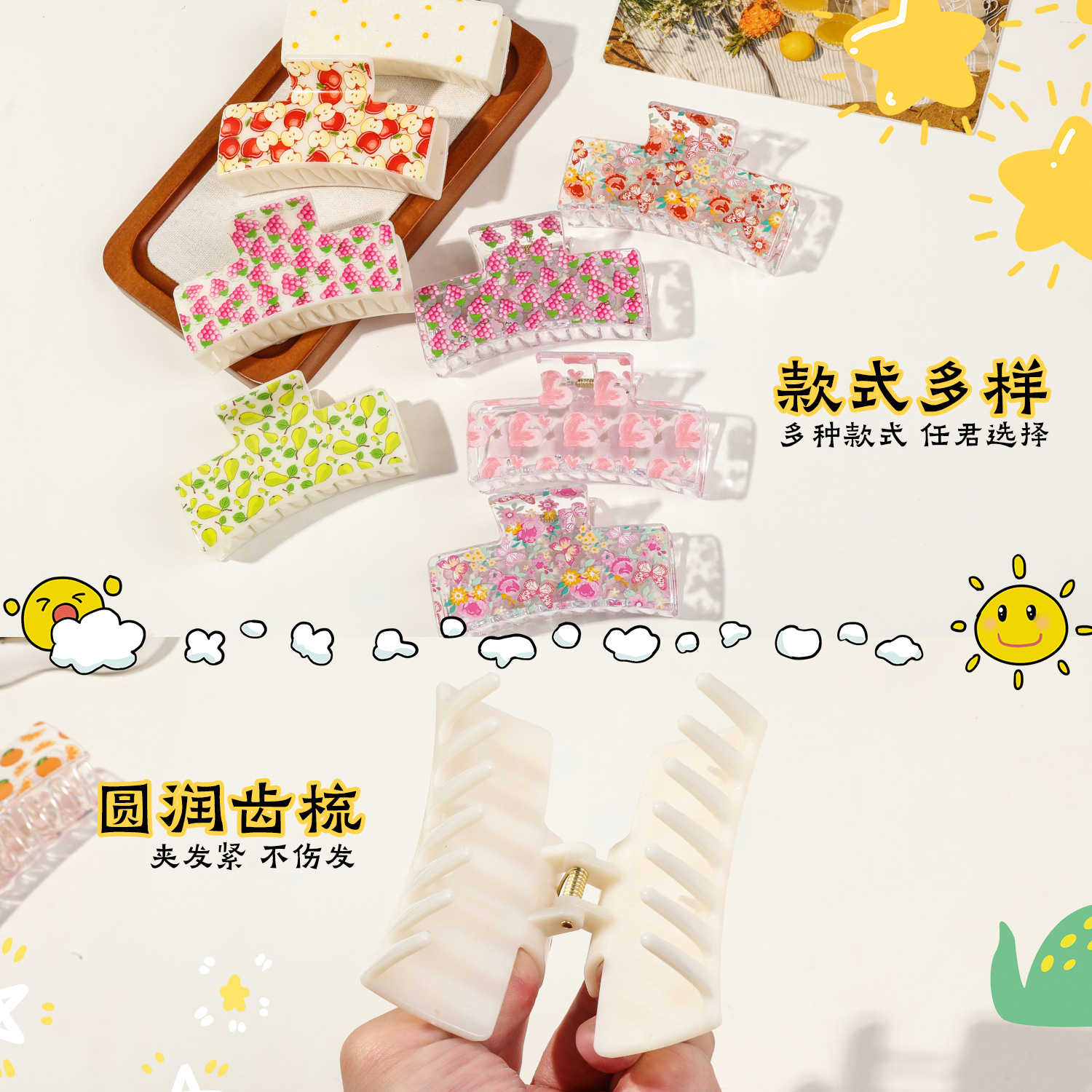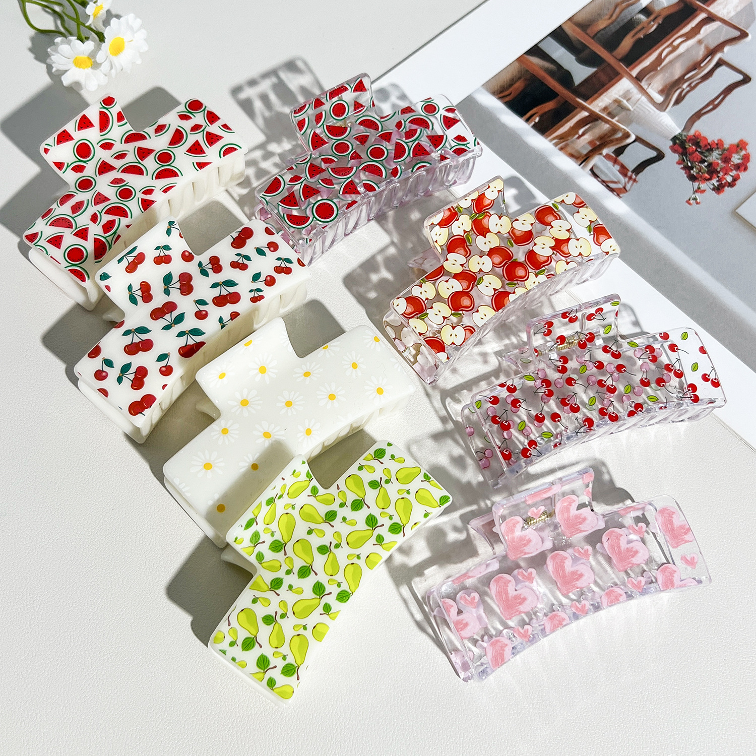 新款热转印花ps塑料水果抓夹时尚清新爪夹女士鲨鱼夹