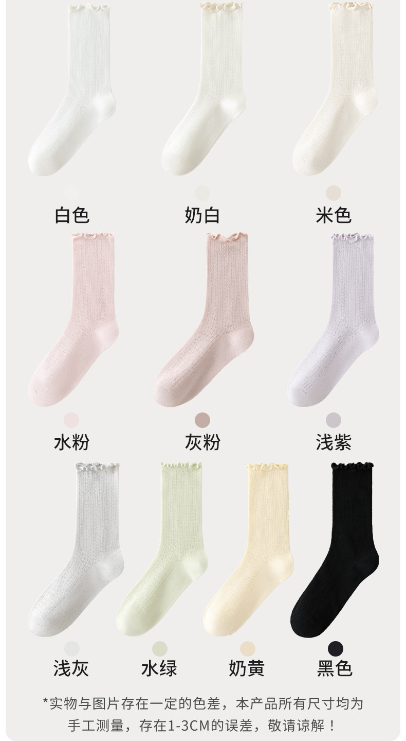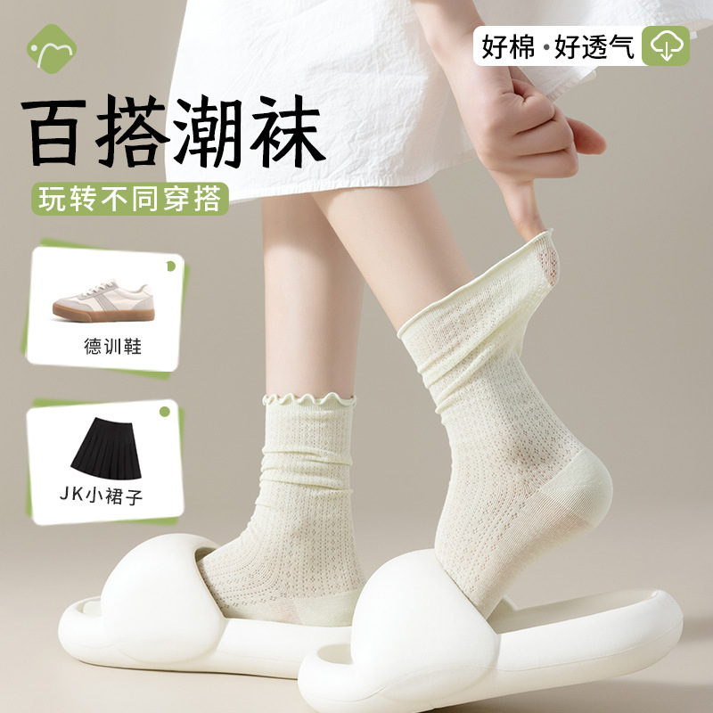 堆堆袜子女中筒春夏季薄款网眼纯色棉袜月子袜夏天木耳花边冰冰袜