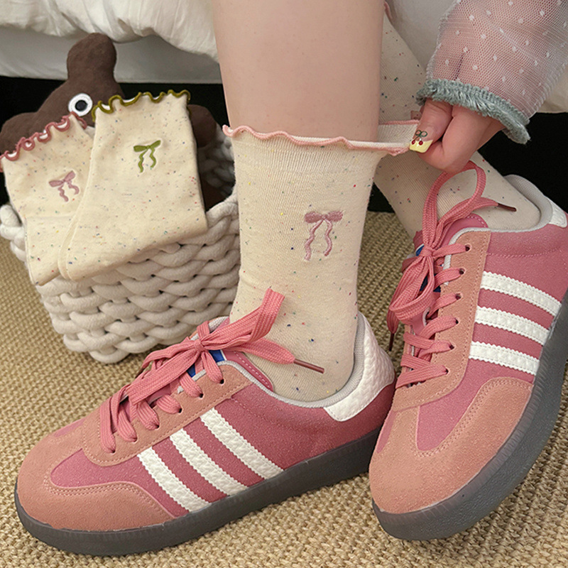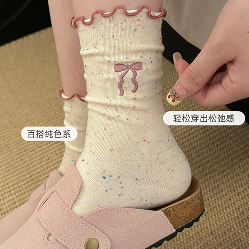 诸暨日系简约蝴蝶结女袜点子纱可爱纯色木耳边堆堆袜中筒袜月子袜