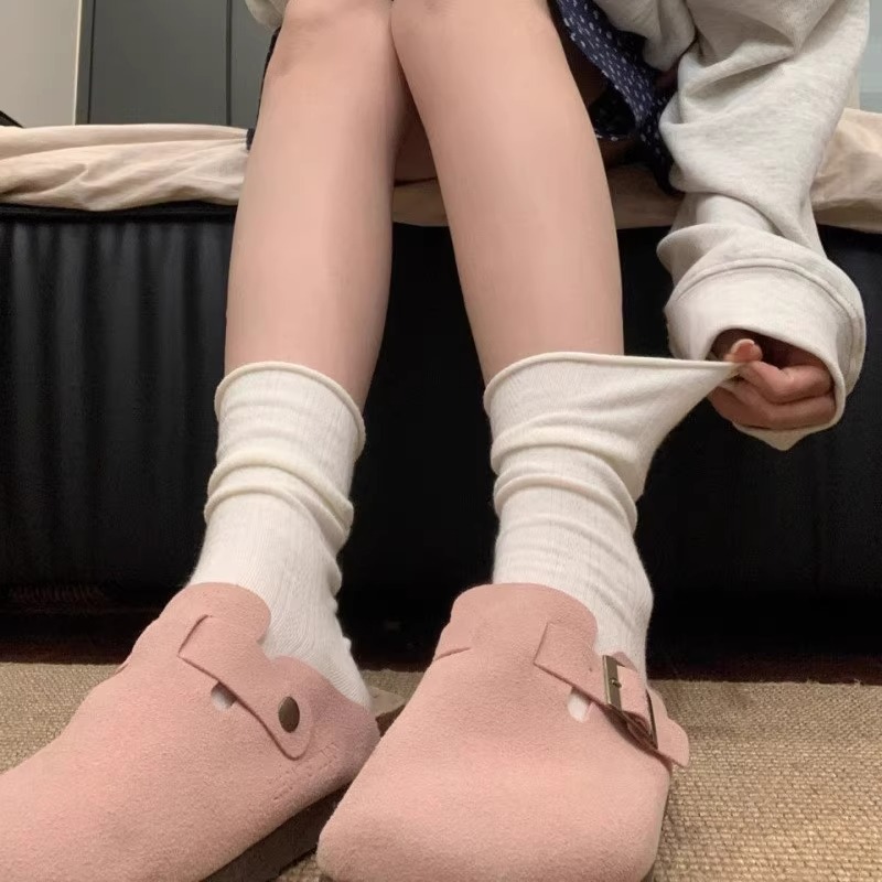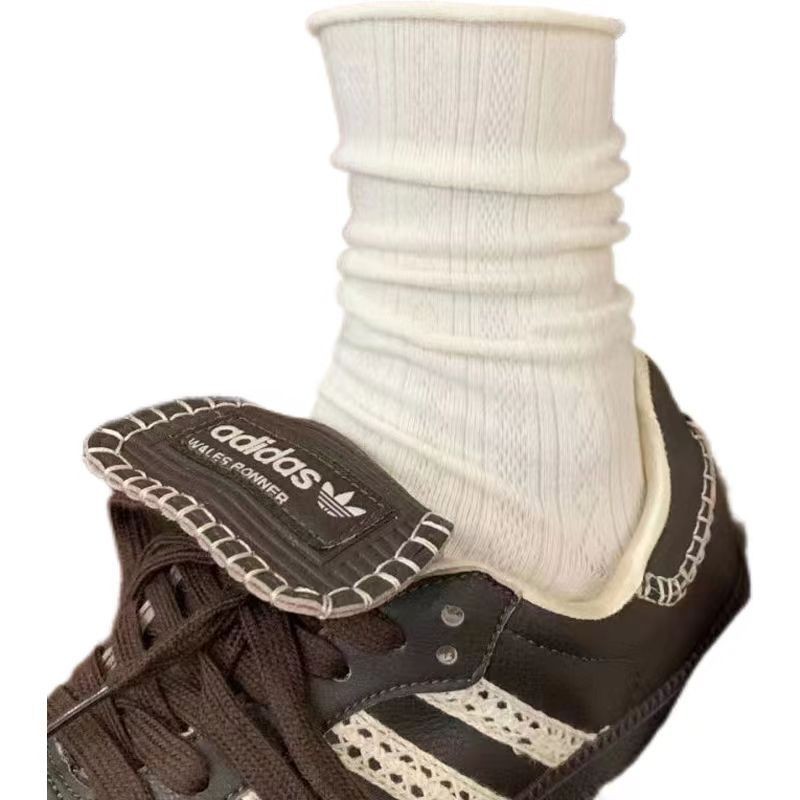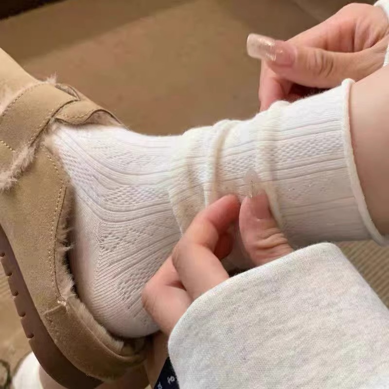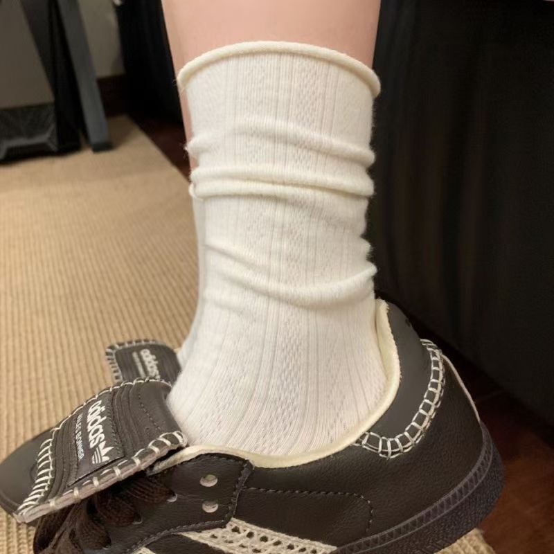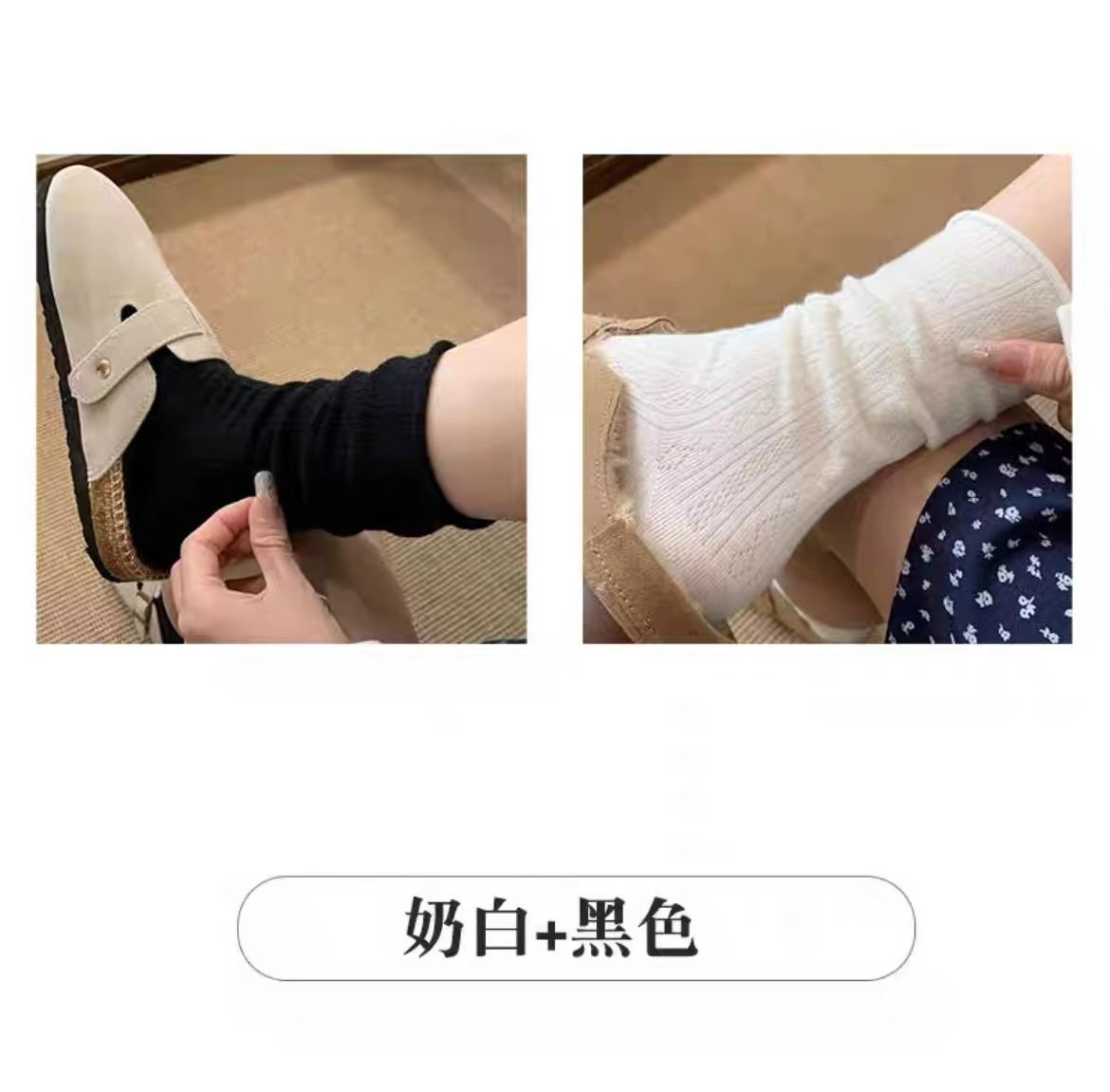袜子女黑白秋季潮复古奶油系卷边暗纹中筒堆堆袜透气日系月子袜