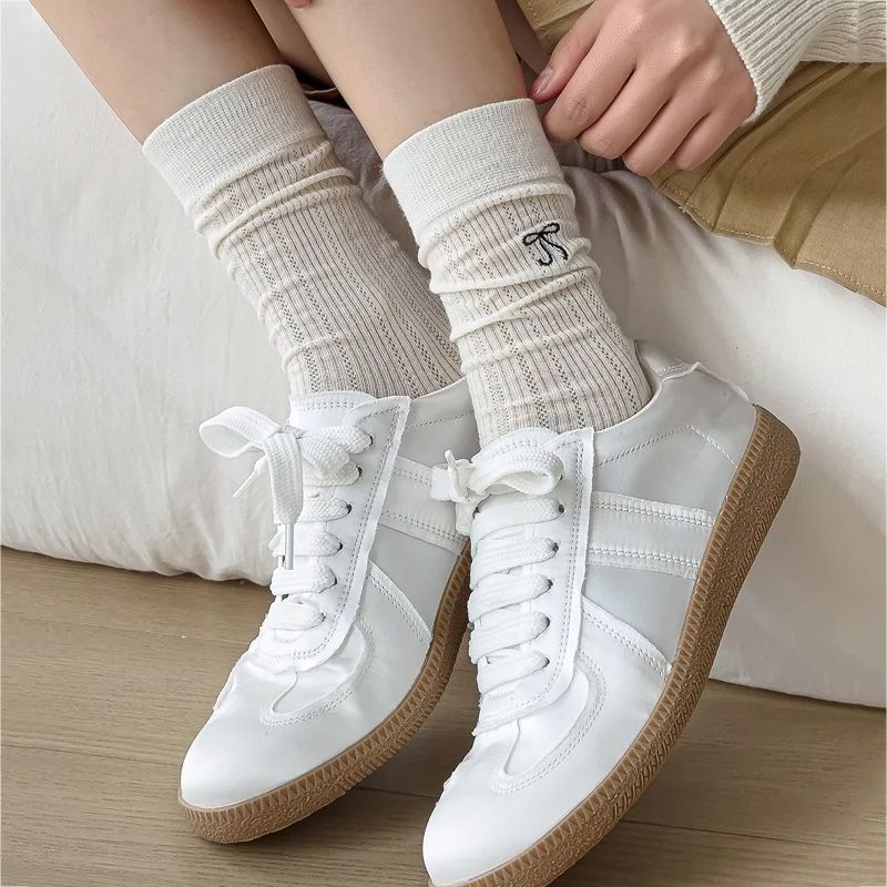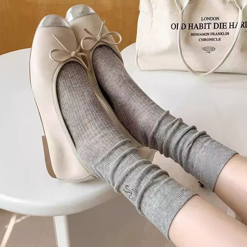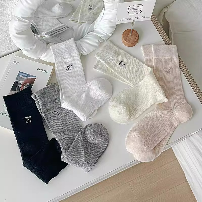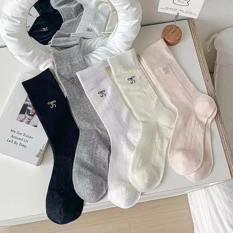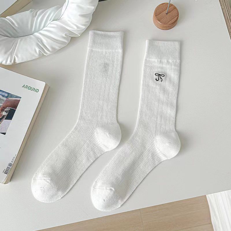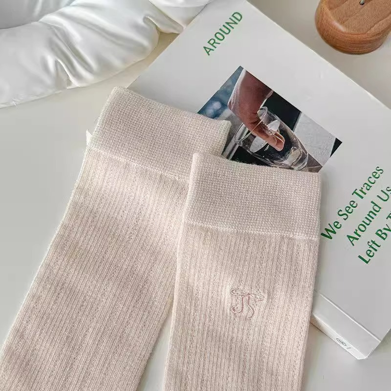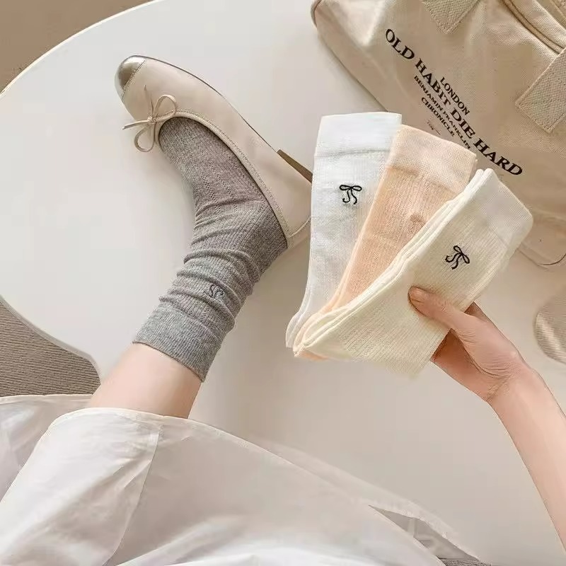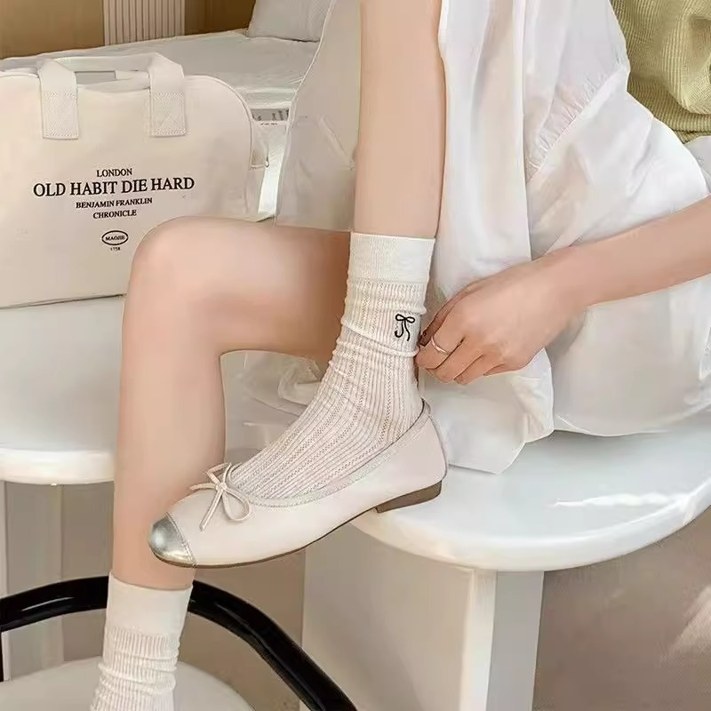 芭蕾风白色袜子女中筒袜夏季薄款蝴蝶结网眼透气长袜女夏天堆堆袜