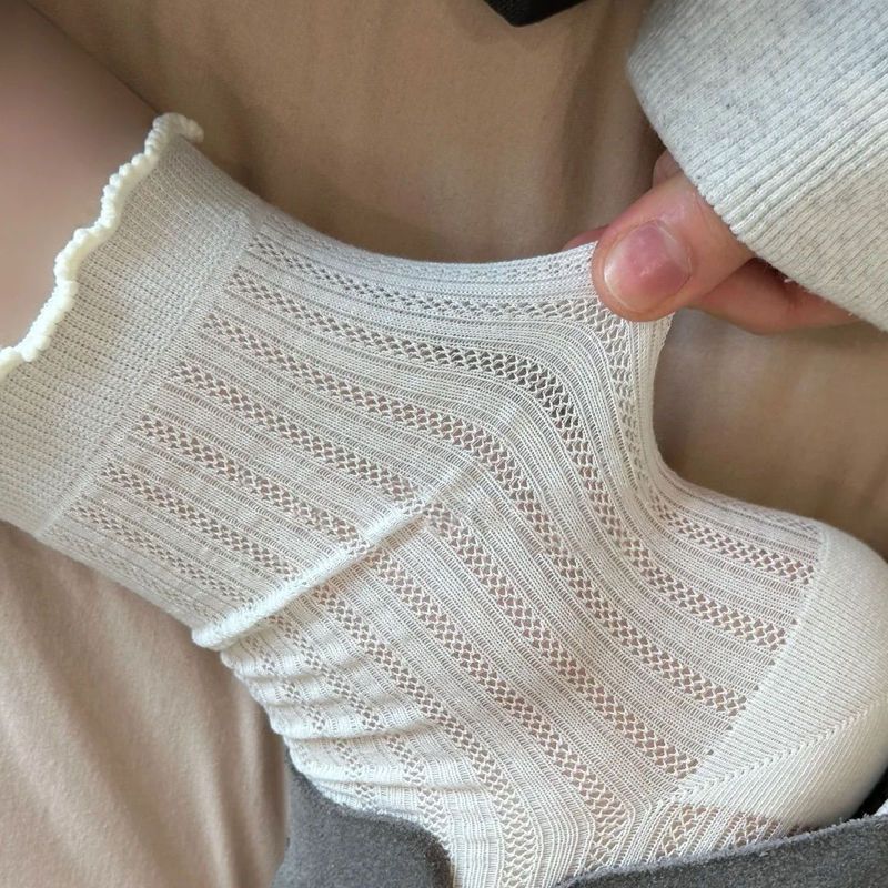 袜子女木耳边纯色网眼镂空中筒袜女ins潮纯棉夏季薄款芭蕾风长袜