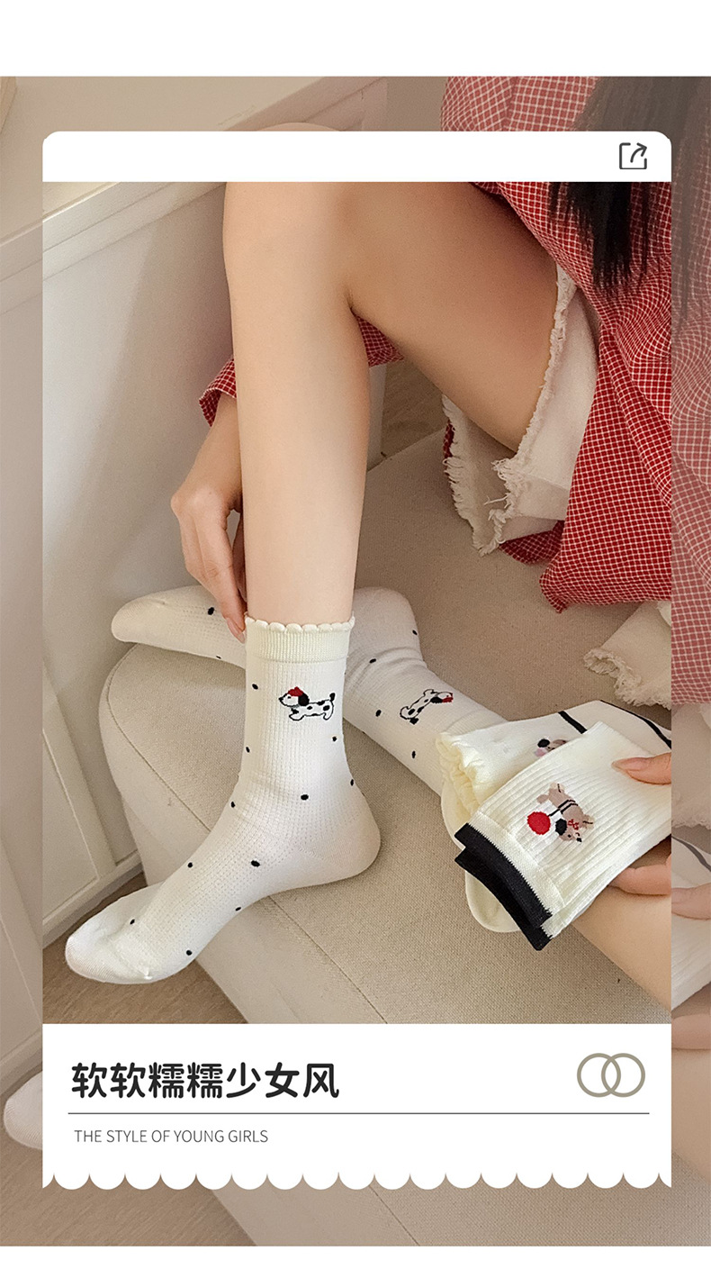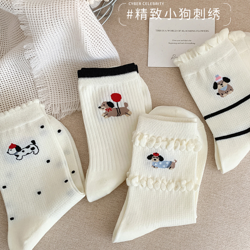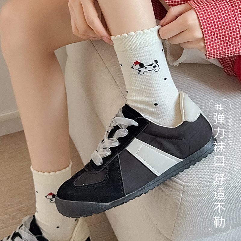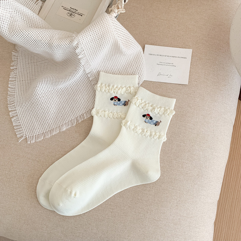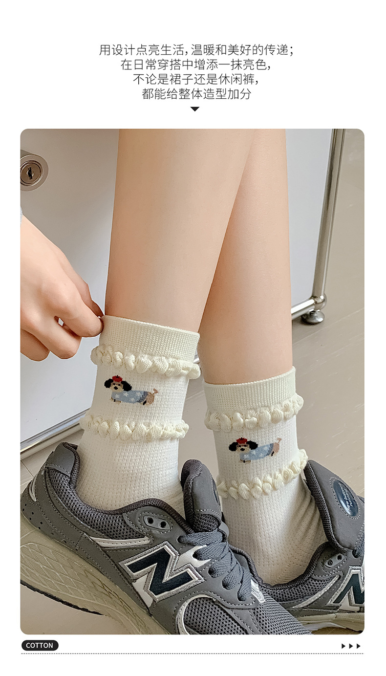 小狗袜子女春秋纯棉薄款中筒ins潮透气可爱花边泡泡口夏天堆堆袜