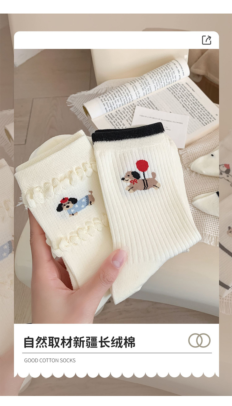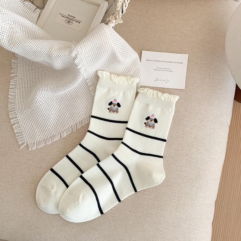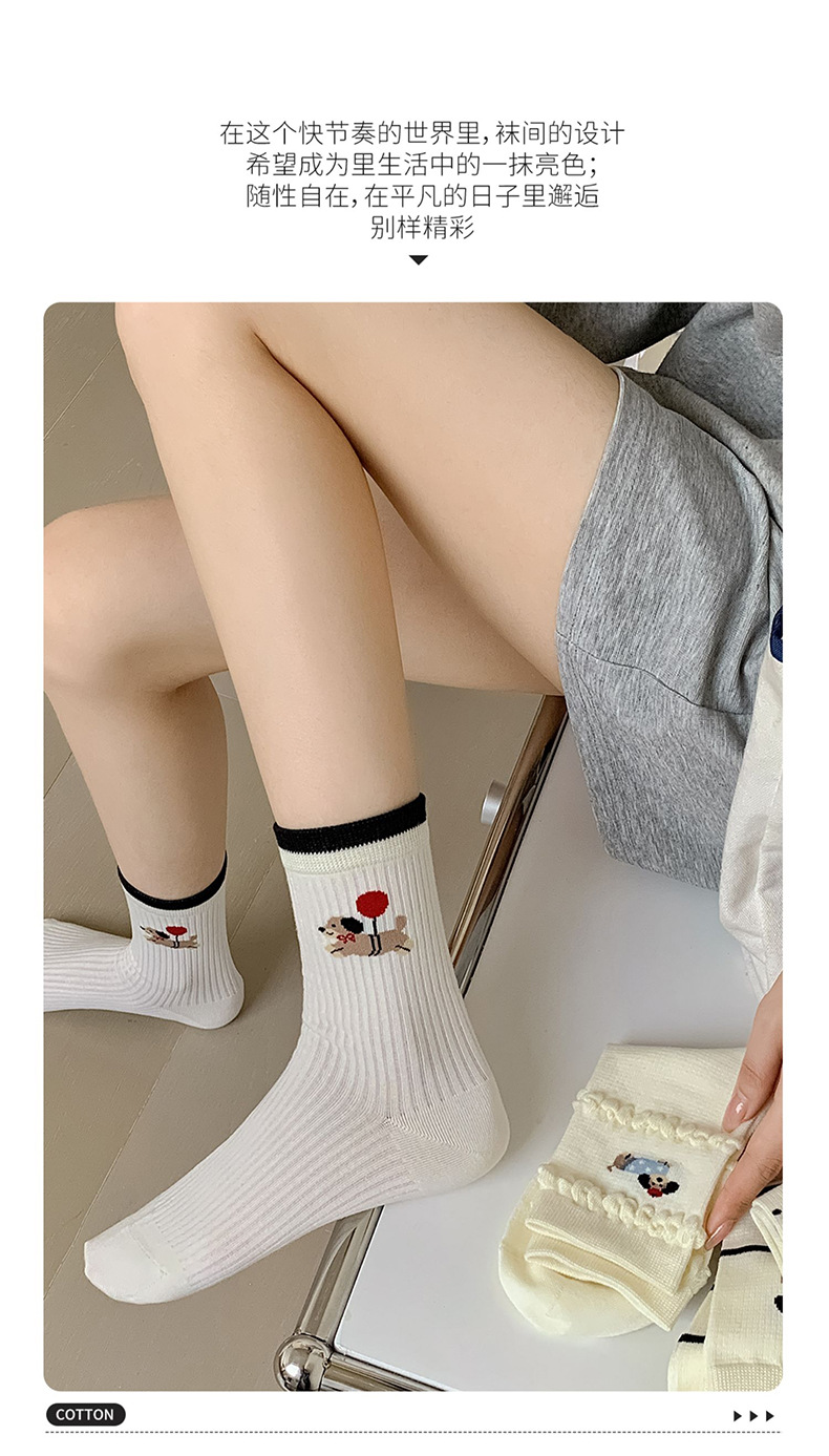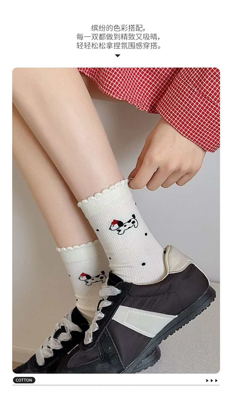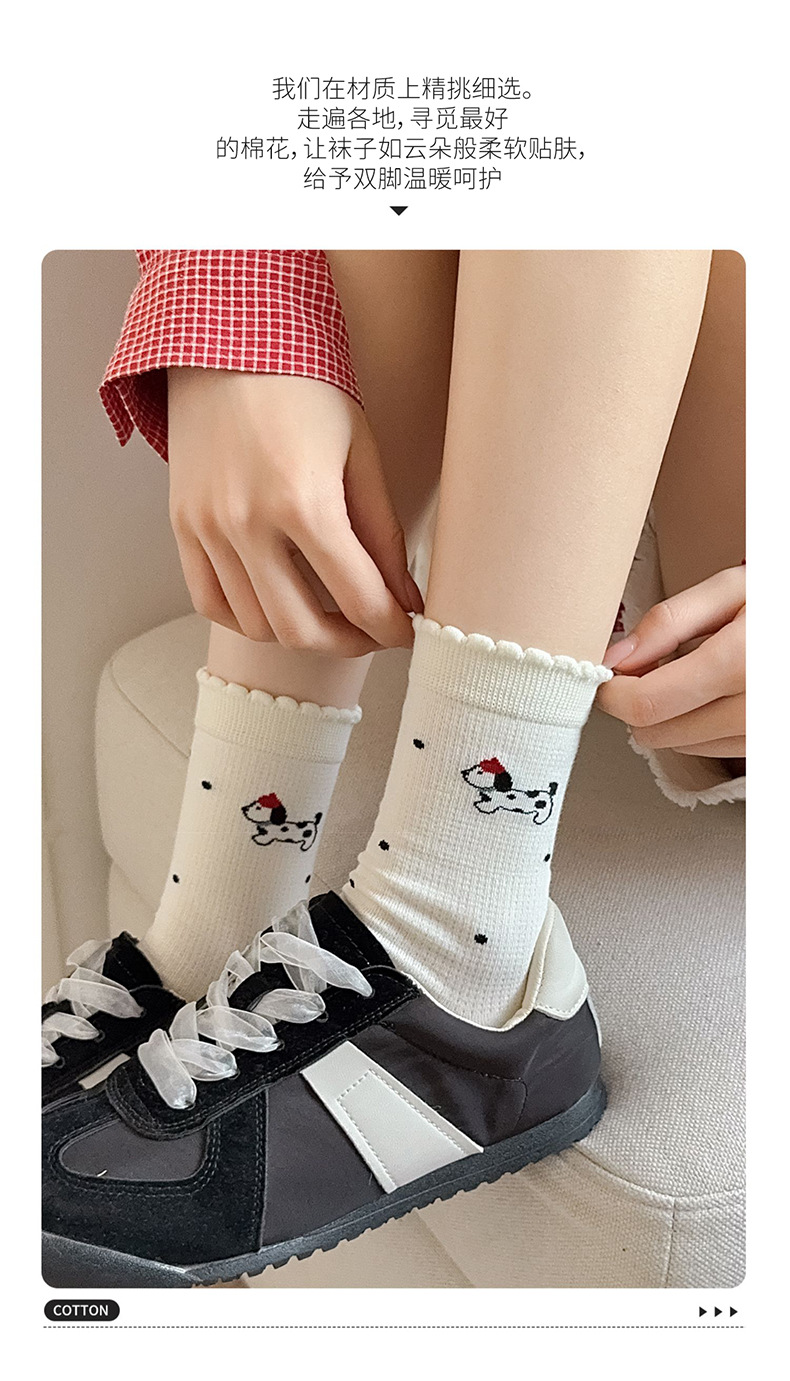 小狗袜子女春秋纯棉薄款中筒ins潮透气可爱花边泡泡口夏天堆堆袜