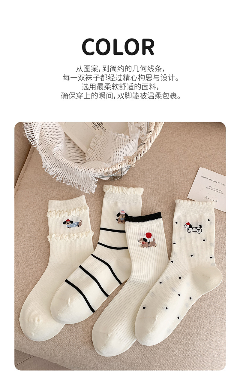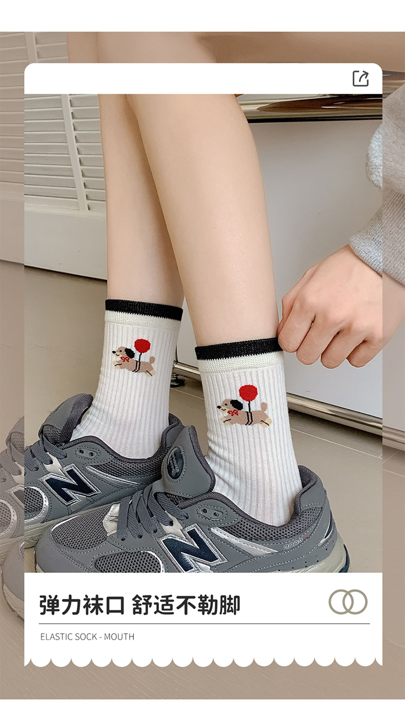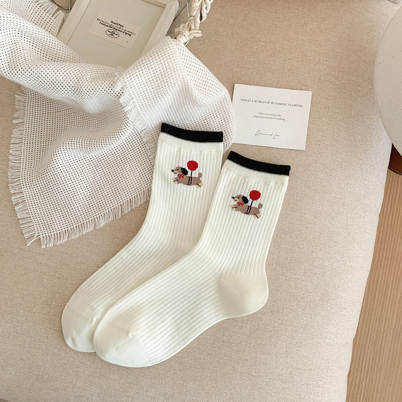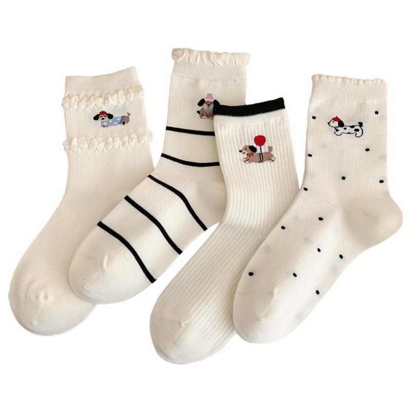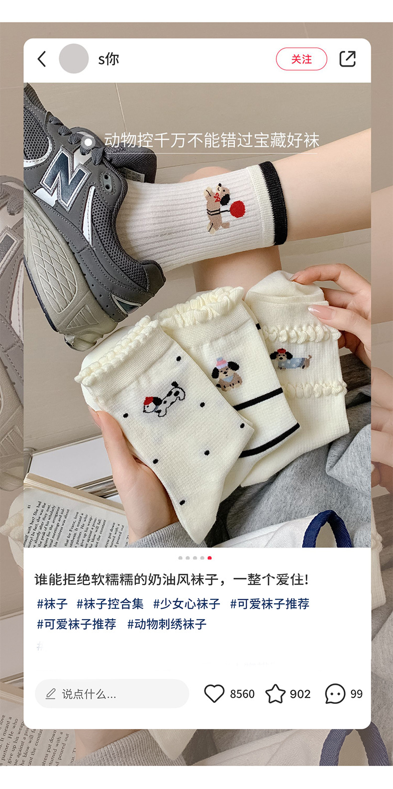 小狗袜子女春秋纯棉薄款中筒ins潮透气可爱花边泡泡口夏天堆堆袜