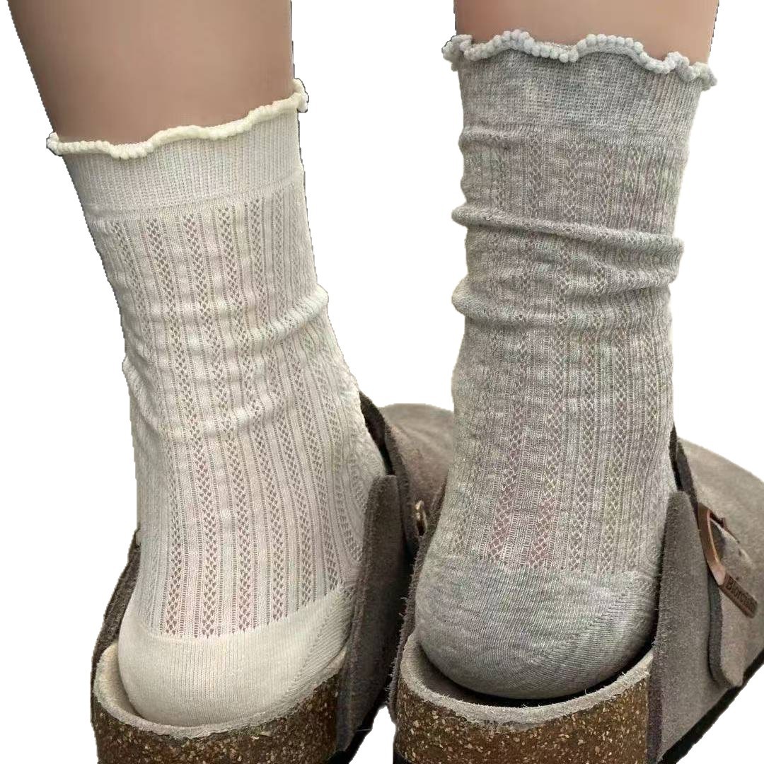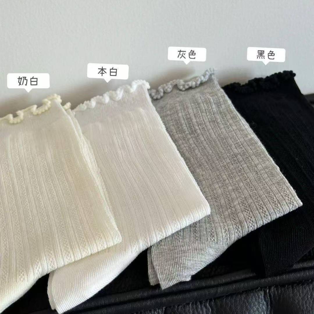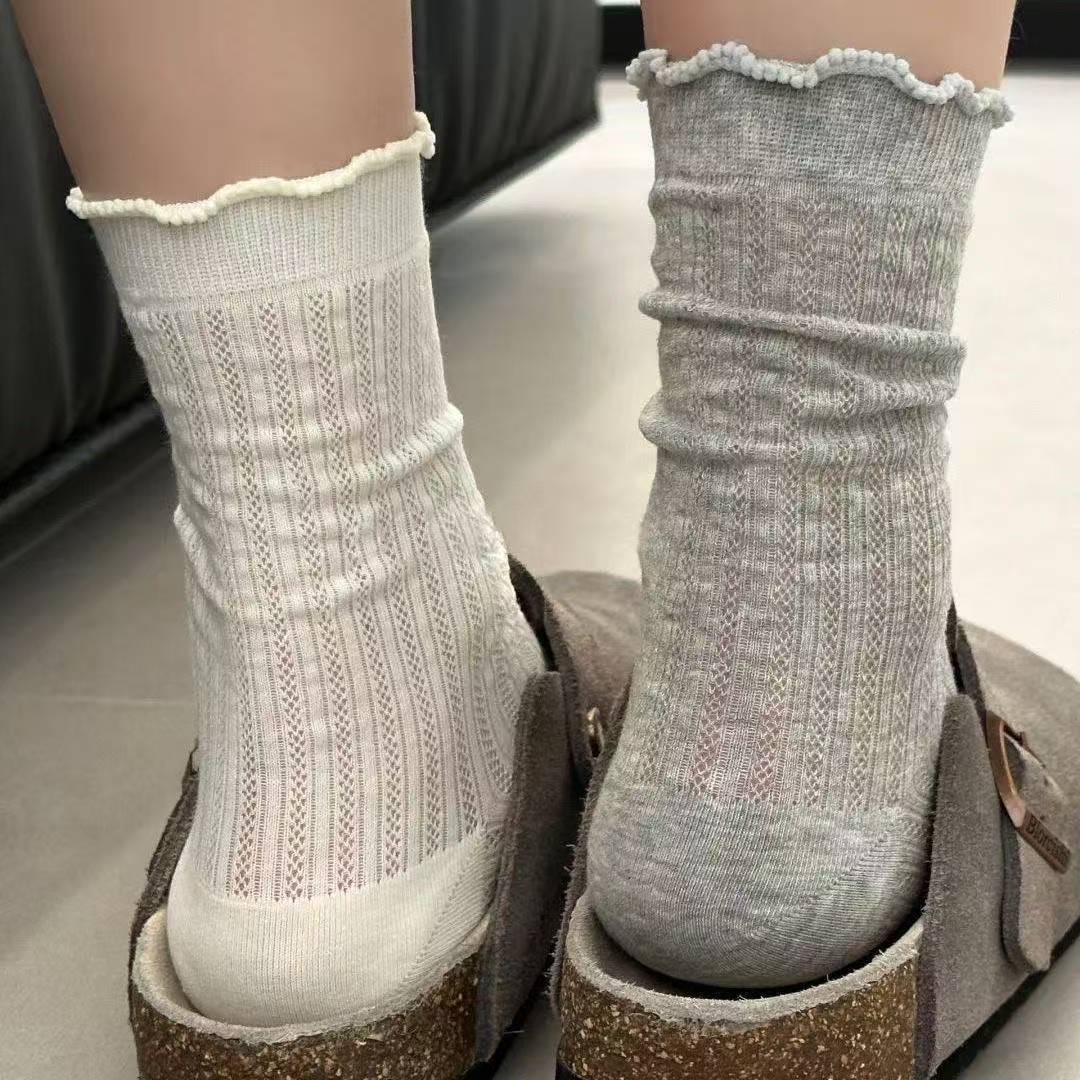 韩版 ins时尚纯色镂空网眼中筒袜春夏日系薄款简约少女花边堆堆袜