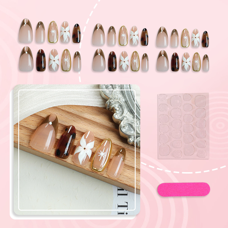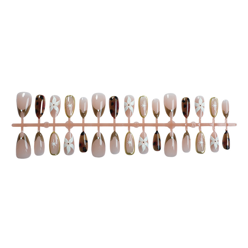 30片跨境热销高级法式杏仁穿戴甲彩绘豹纹3d立体花朵鎏金美甲甲片