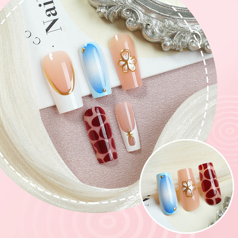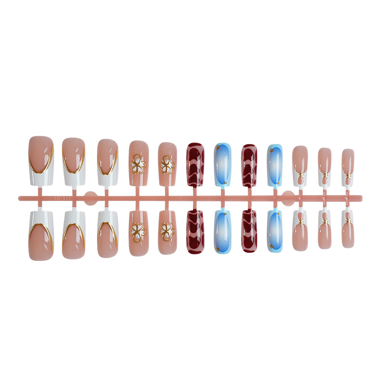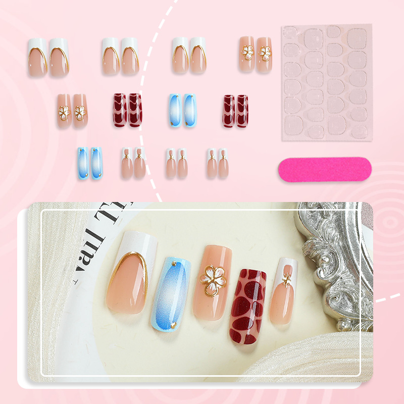 24片跨境白色法式3D花朵中水管穿戴甲鎏金花边高级感豹纹美甲甲片