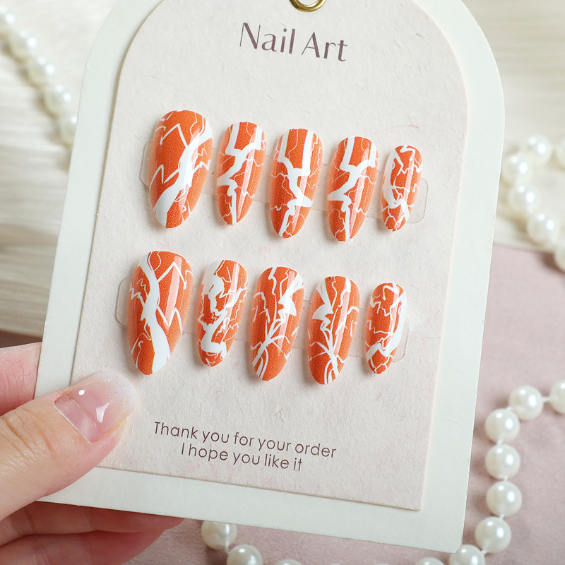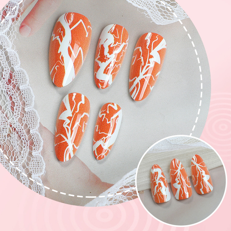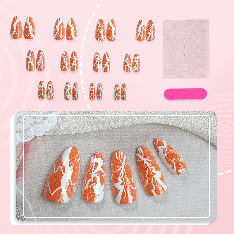 24片跨境精品杏仁穿戴甲高级感彩绘橙色闪电裂痕美甲甲片预制批发