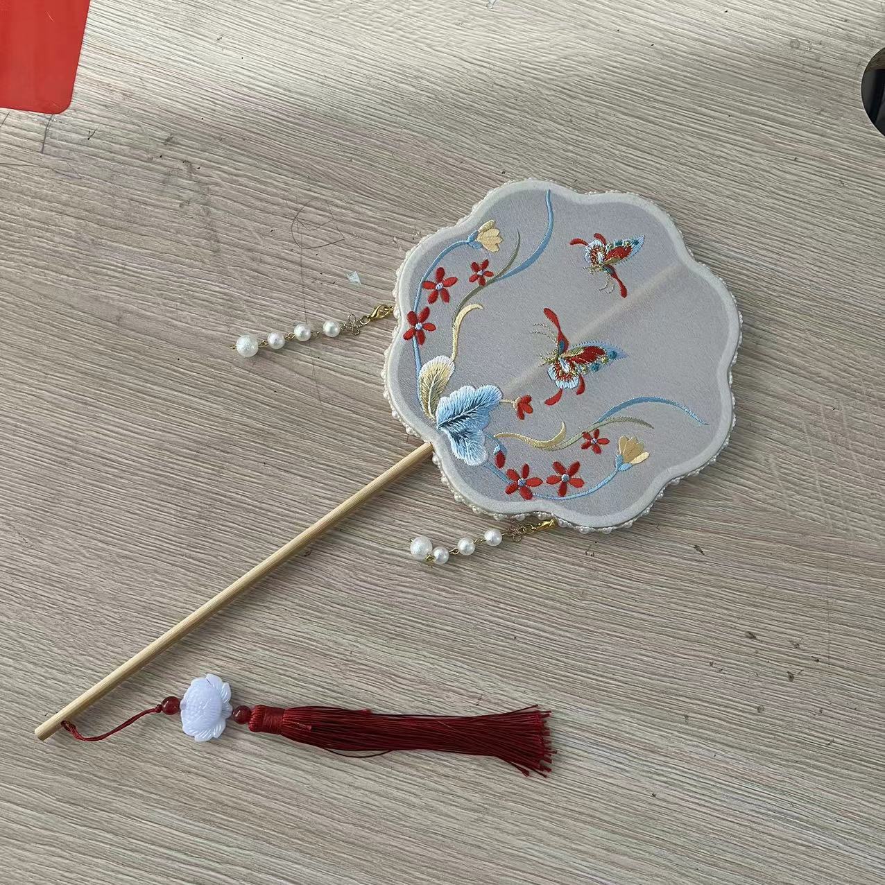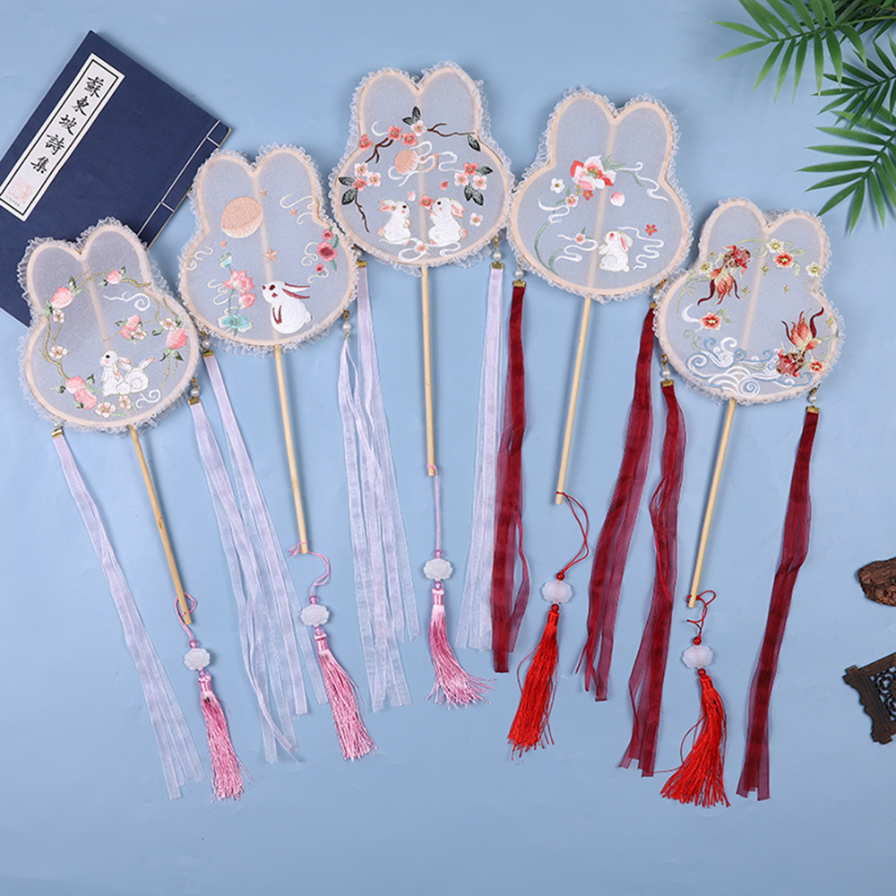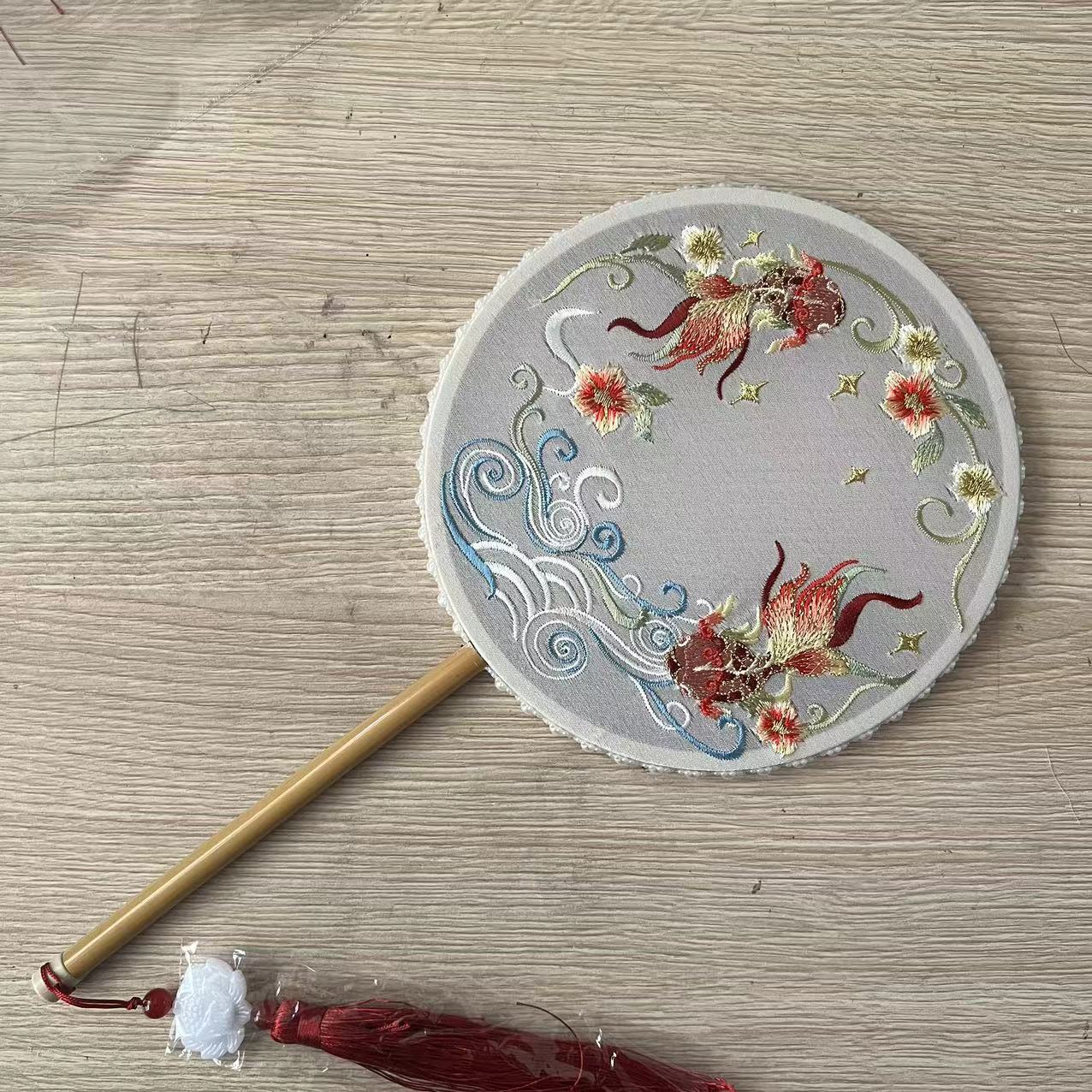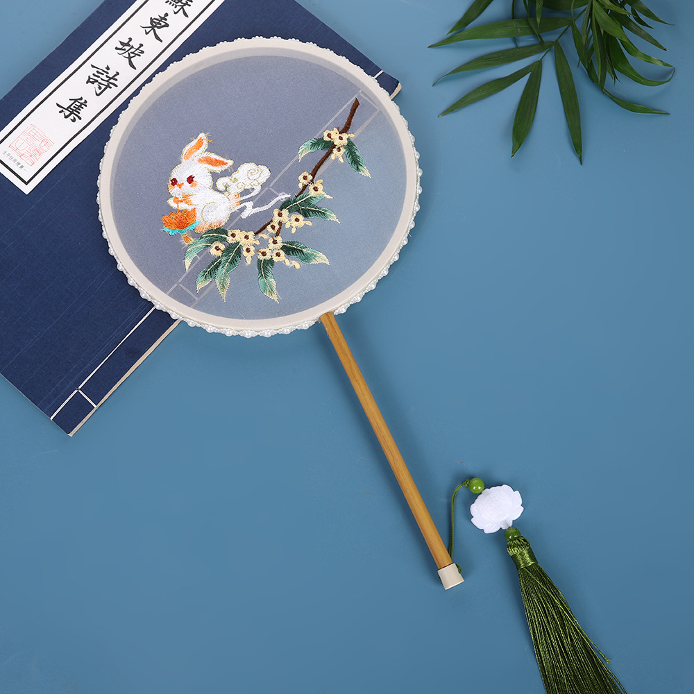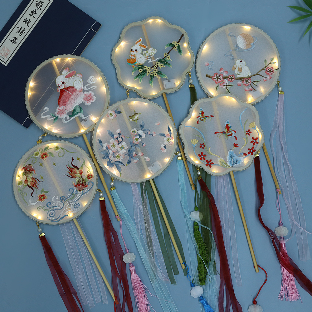 厂家 苏州刺绣团扇绣花玉兔锦鲤圆扇汉服复古带灯扇子竹长柄儿童