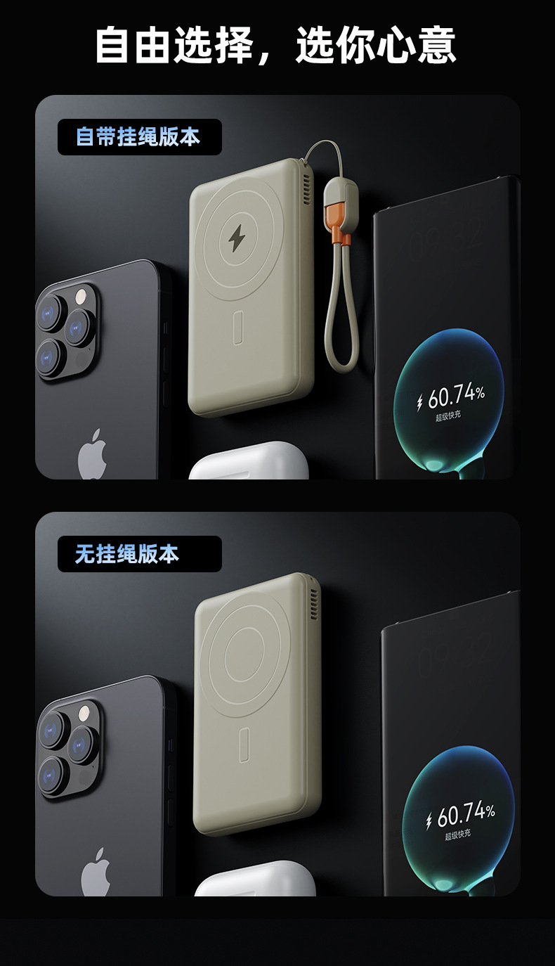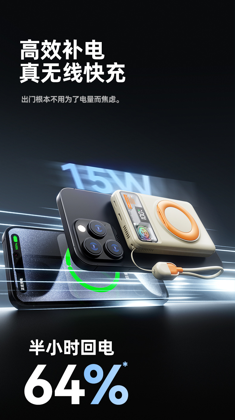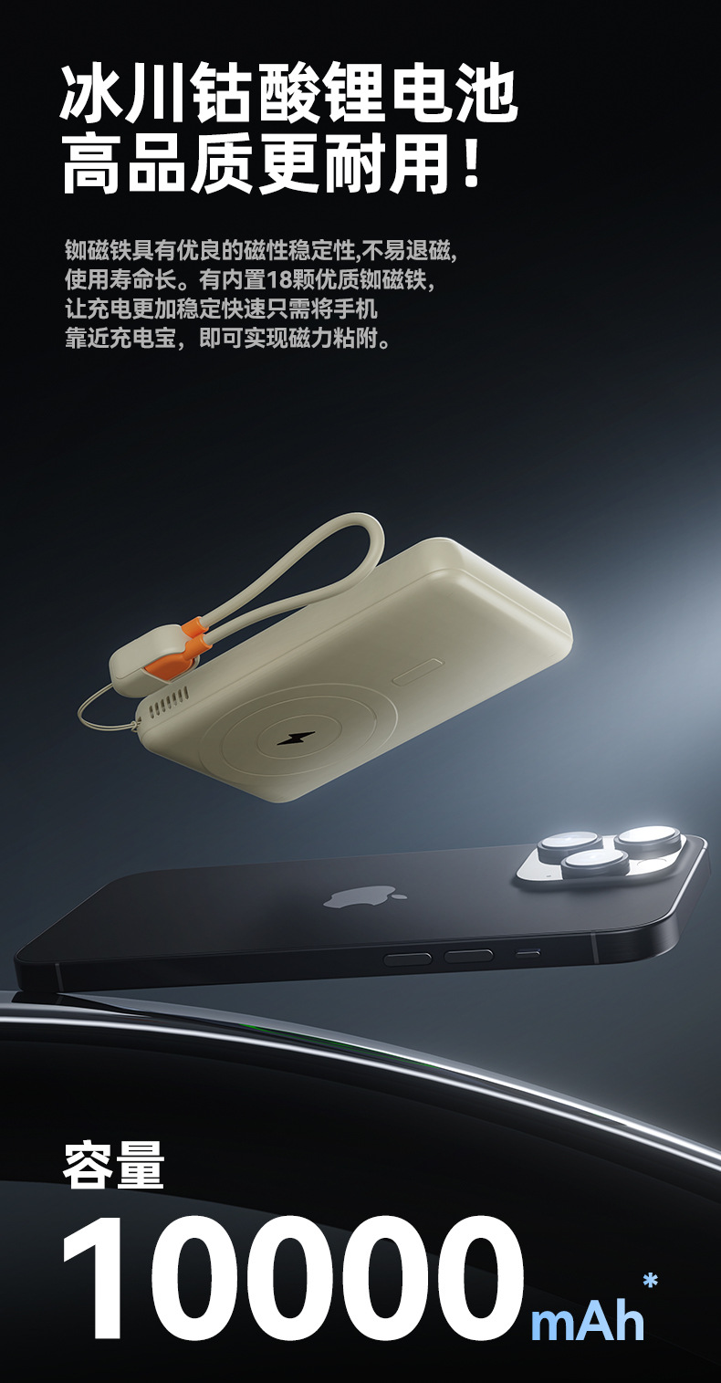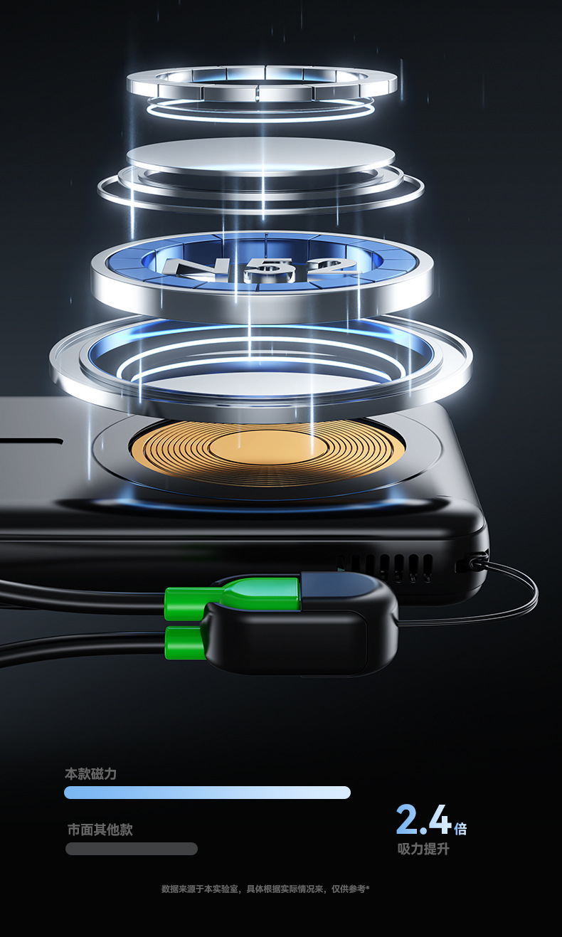 跨境磁吸支架快充22.5W散热充电宝自带可拆线10000毫安移动电源