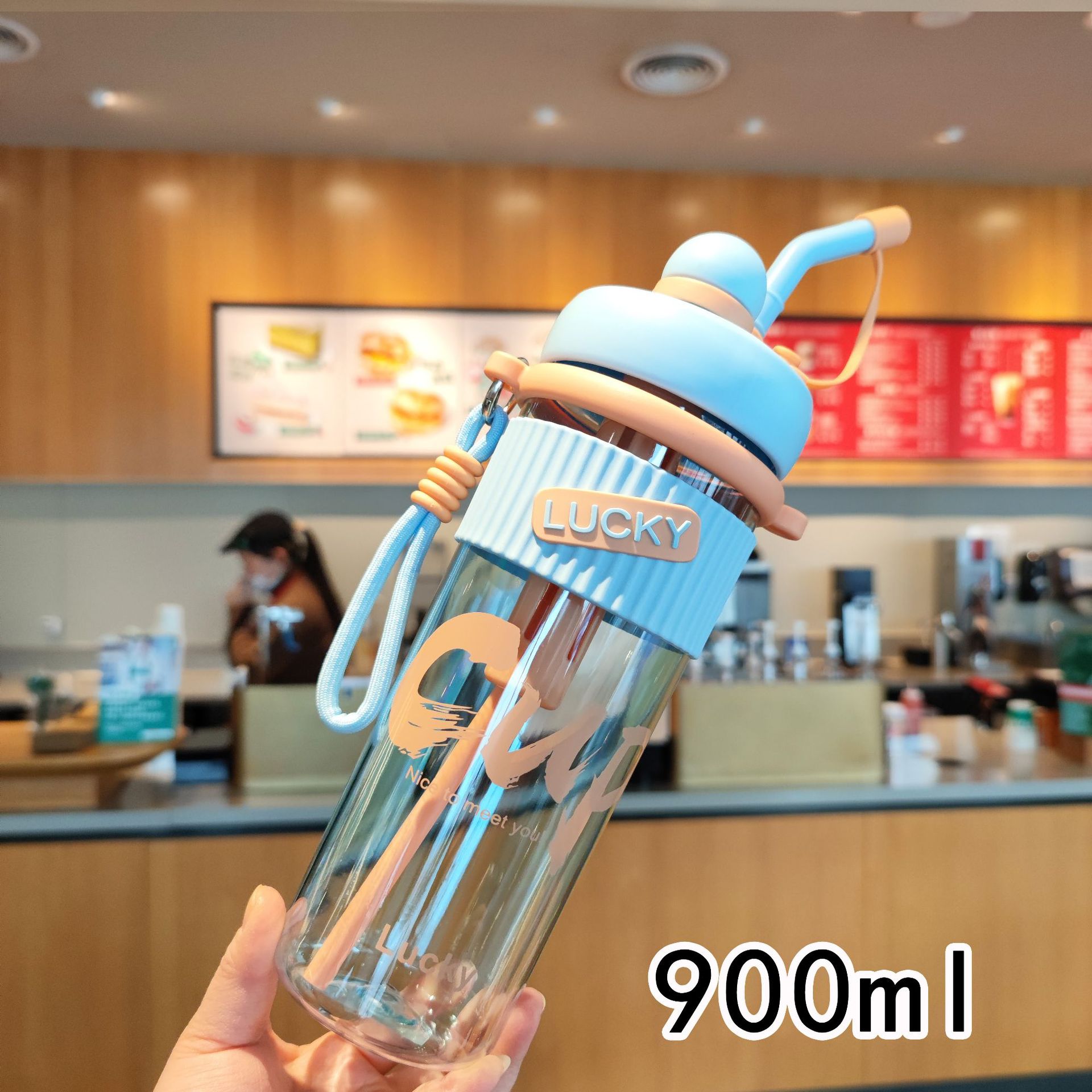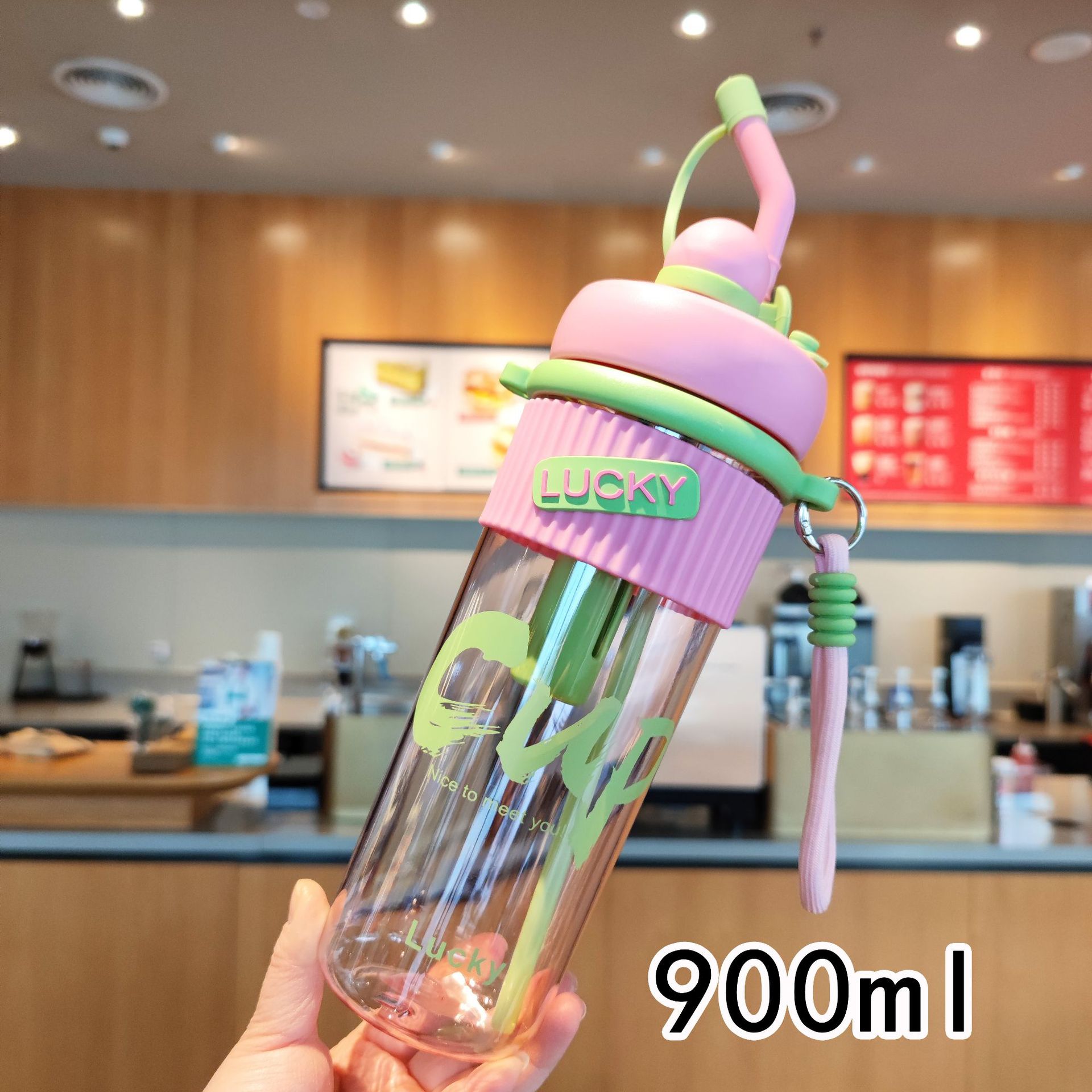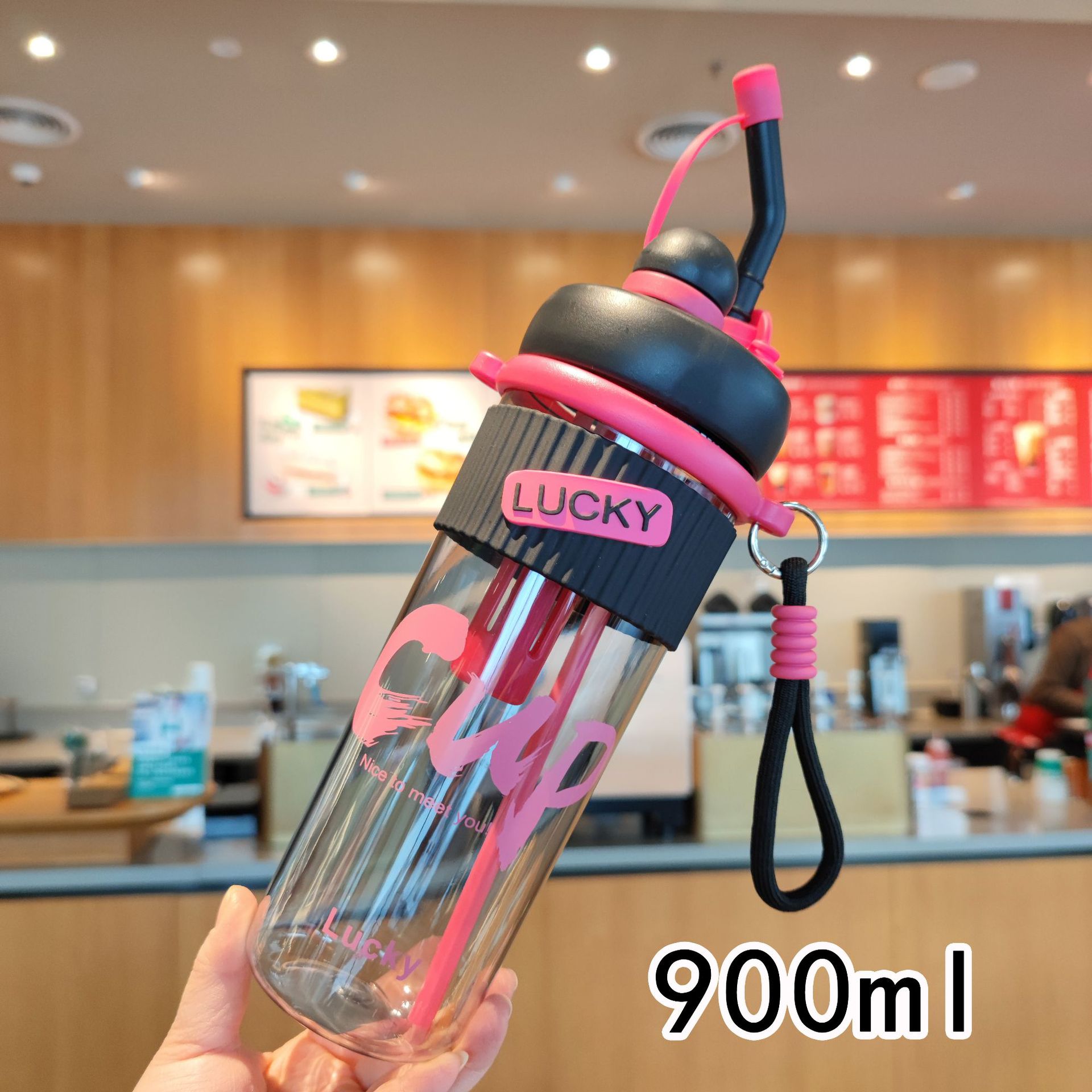 网红简约车霸杯水饮大容量塑料杯吸管水瓶900ml提绳户外健身礼品