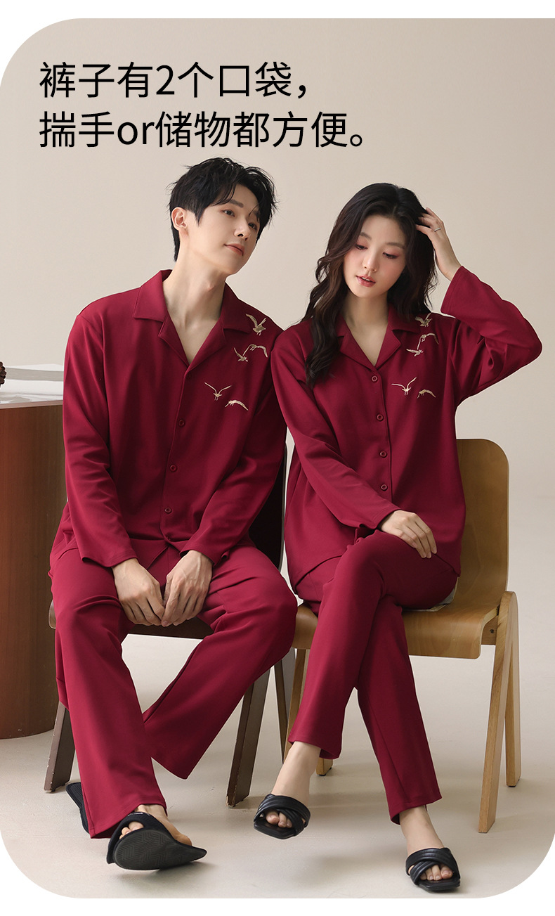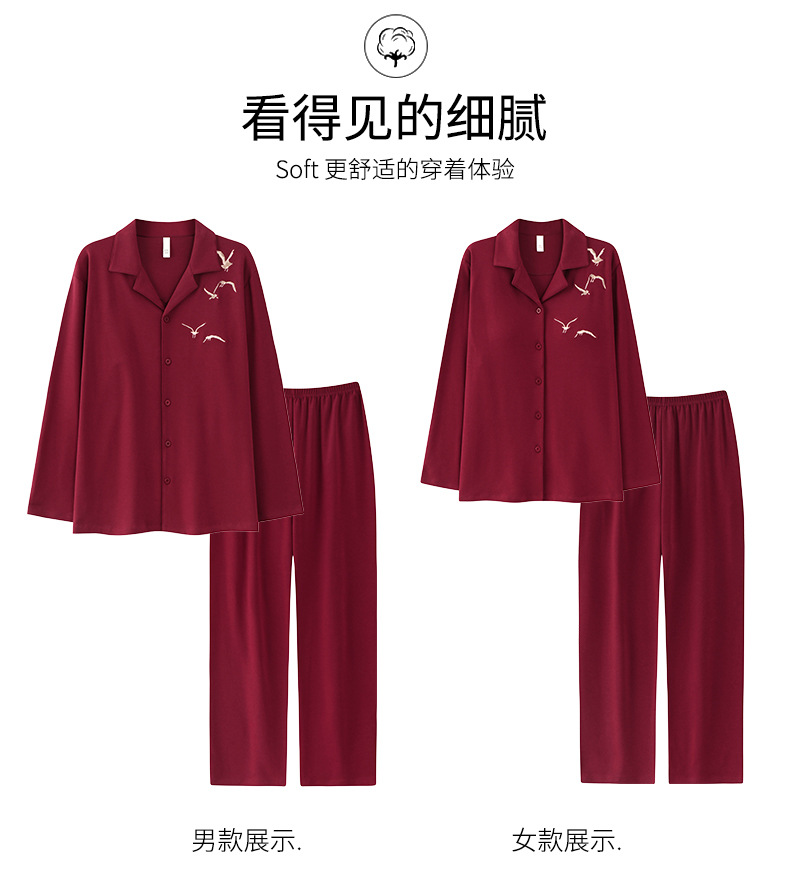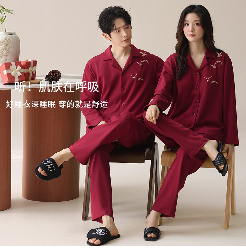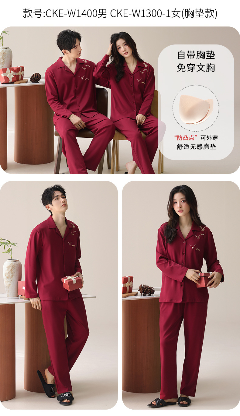 秋冬季新婚长袖女款带胸垫情侣睡衣纯棉红色开衫男士家居服两件套