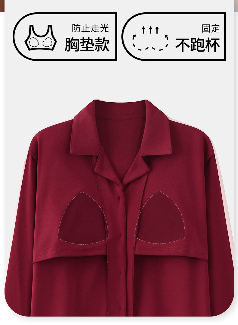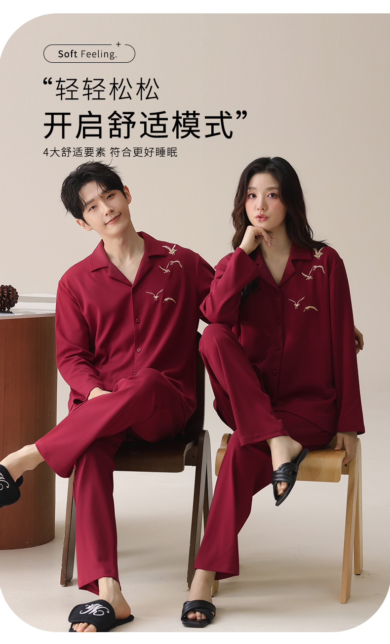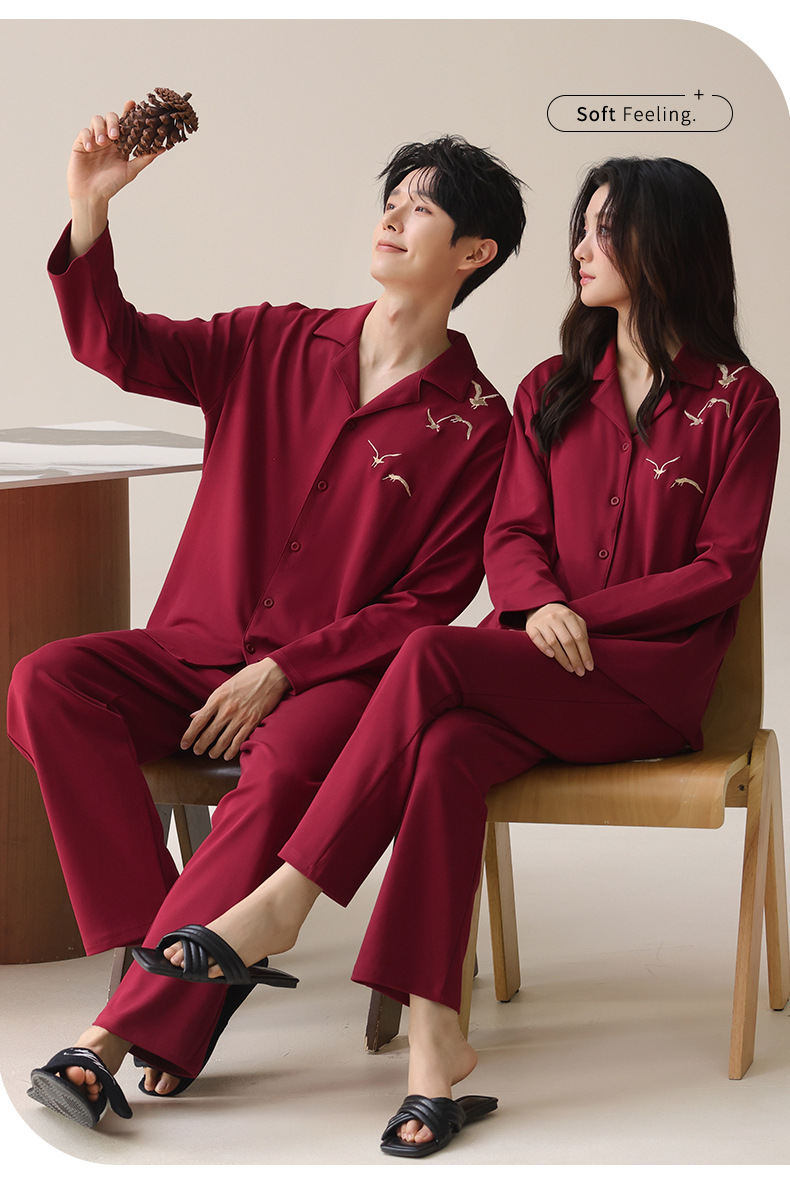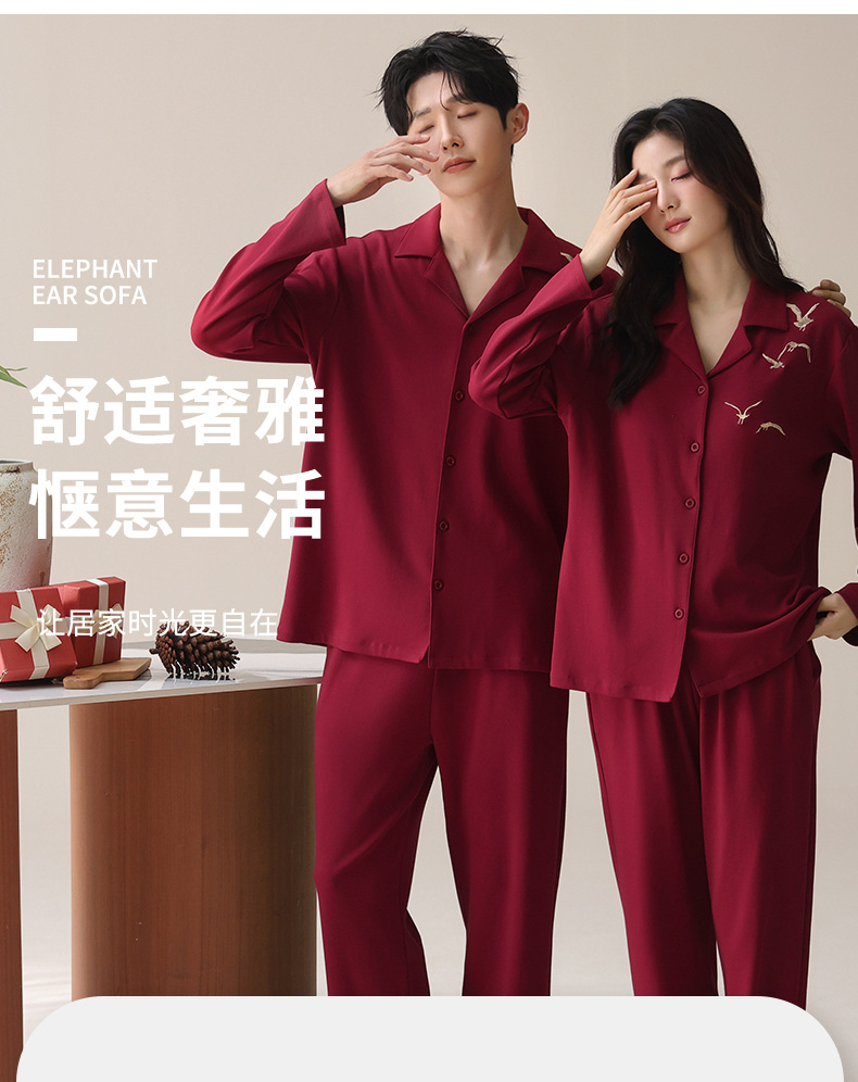 秋冬季新婚长袖女款带胸垫情侣睡衣纯棉红色开衫男士家居服两件套