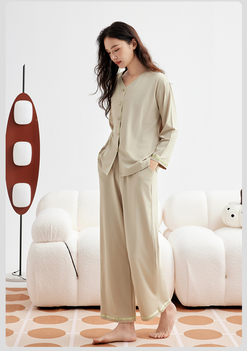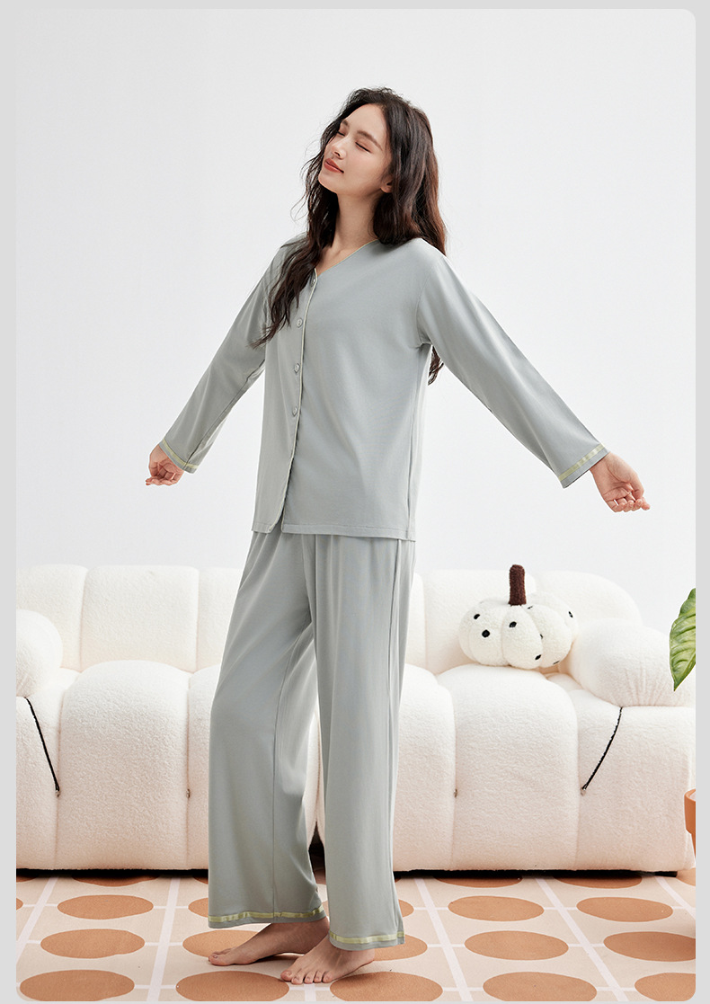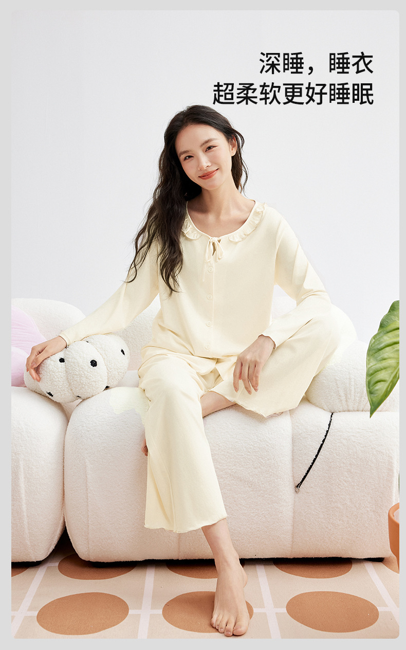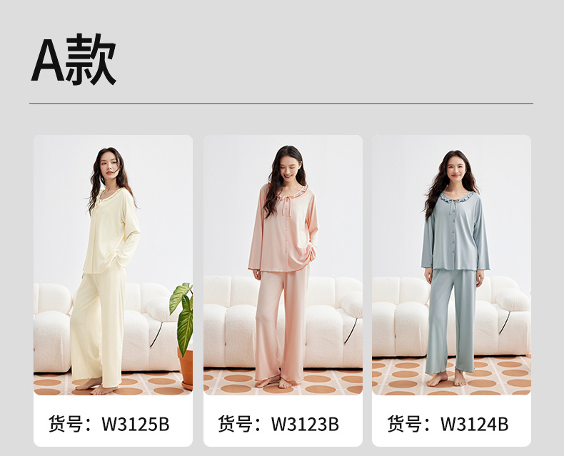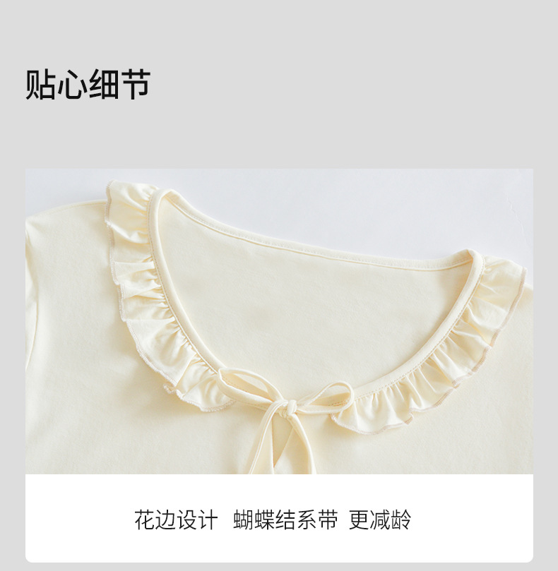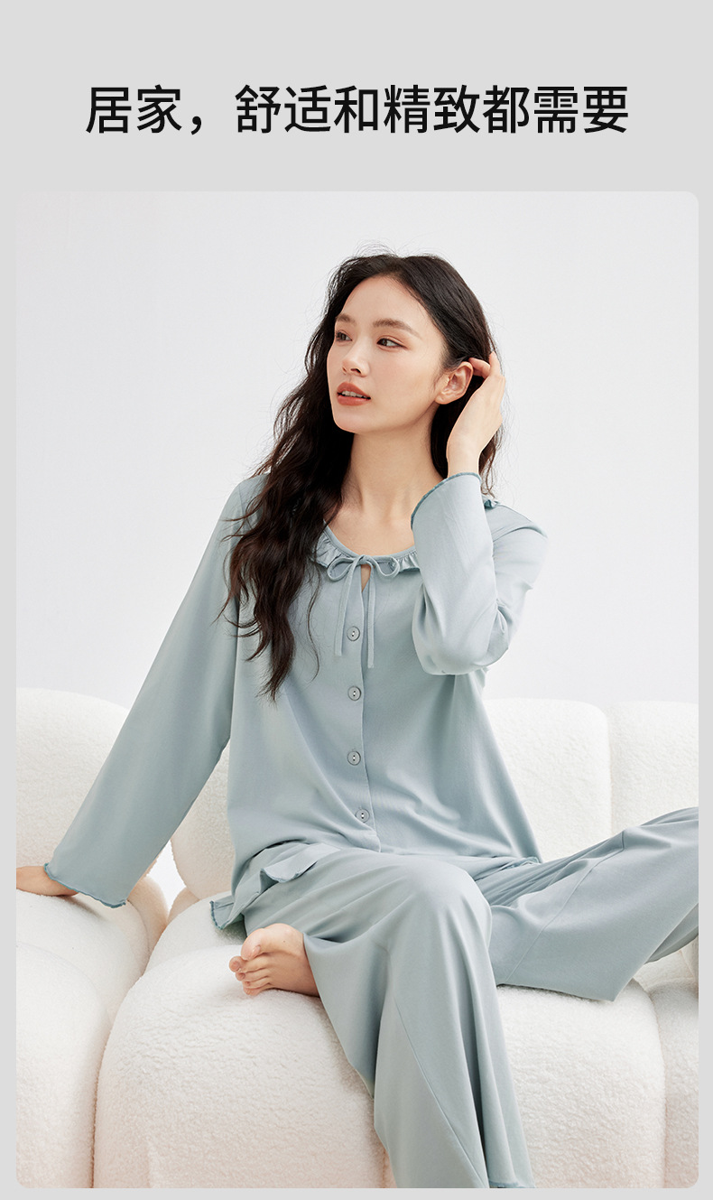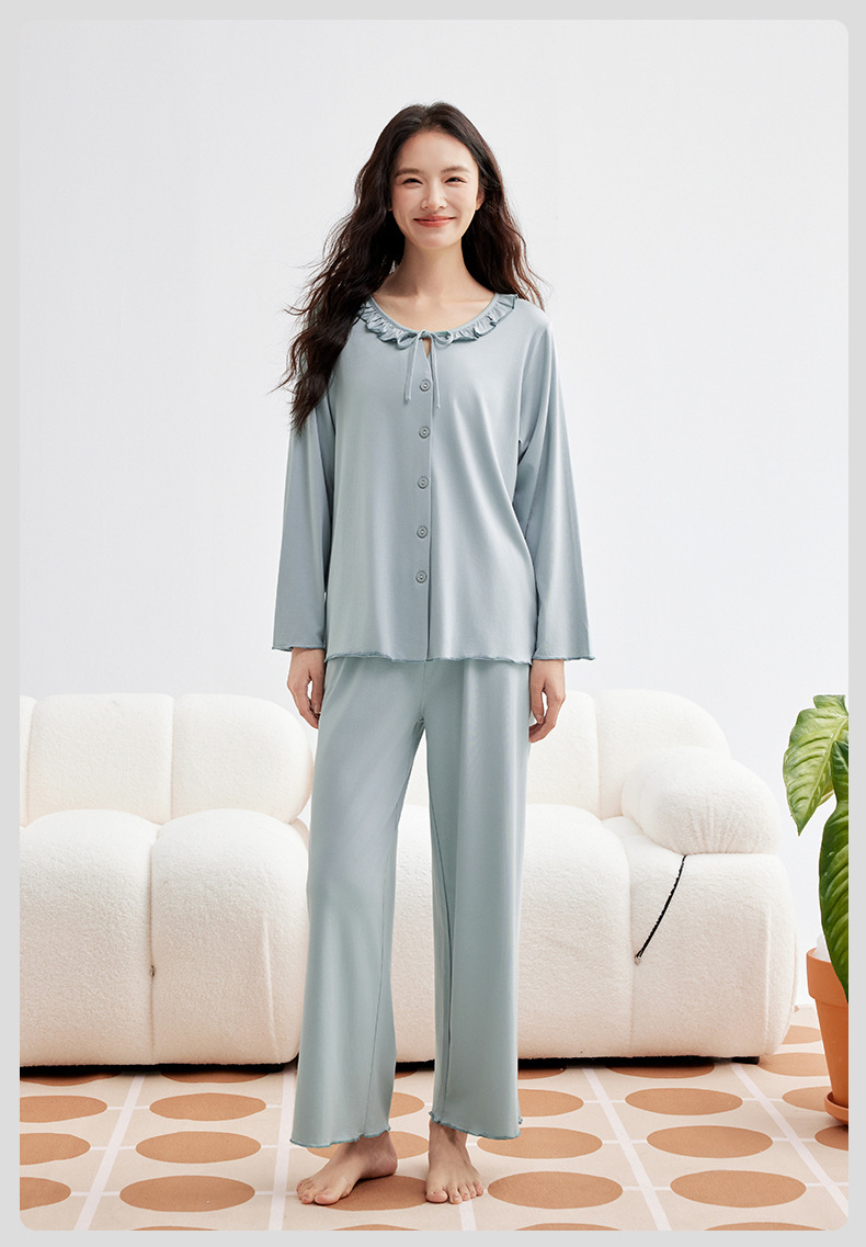 莫代尔棉圆领薄款女秋长袖长裤套装春秋季木耳领女士睡衣家居服