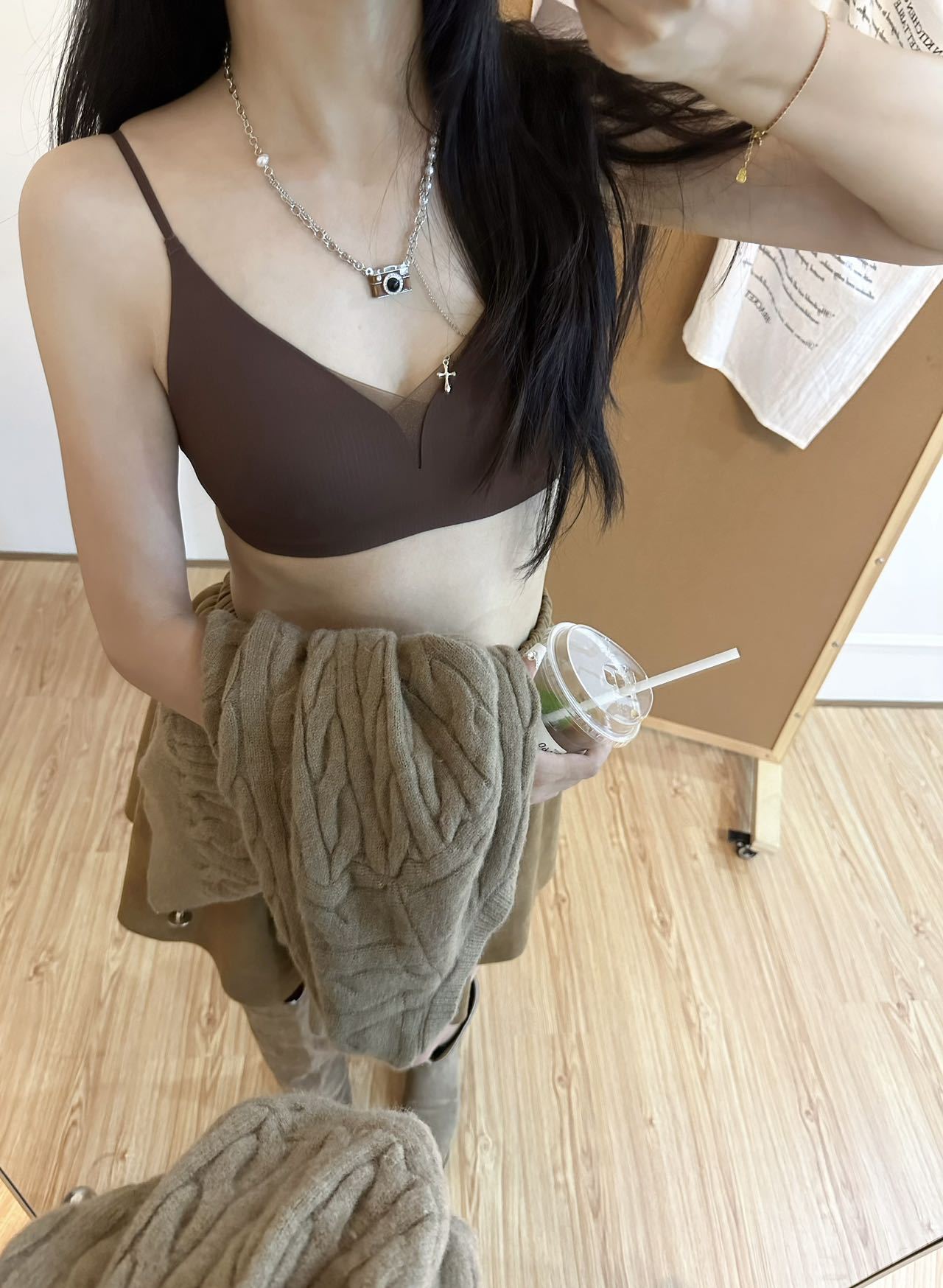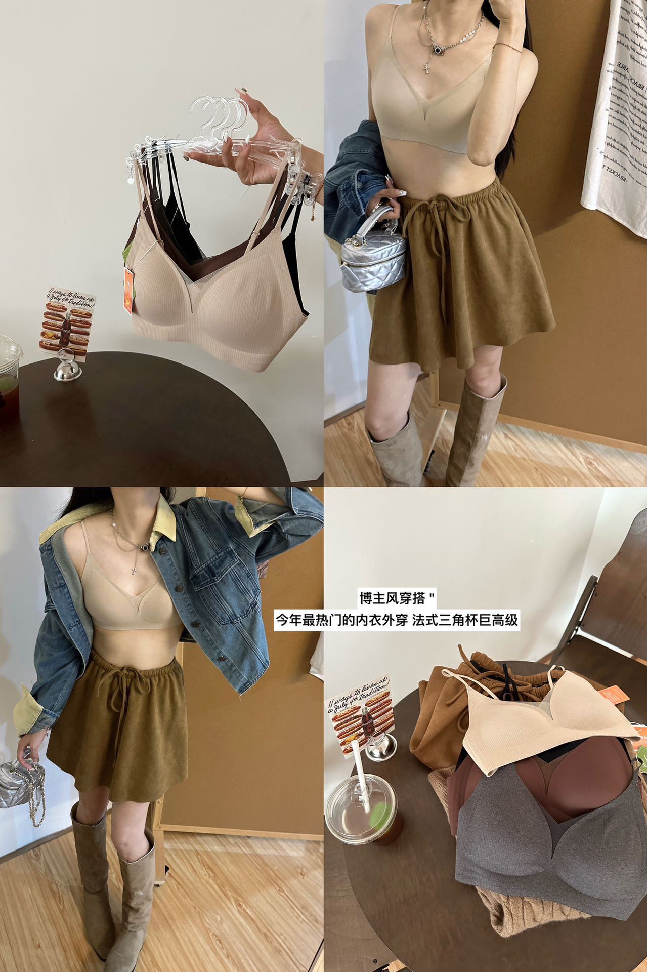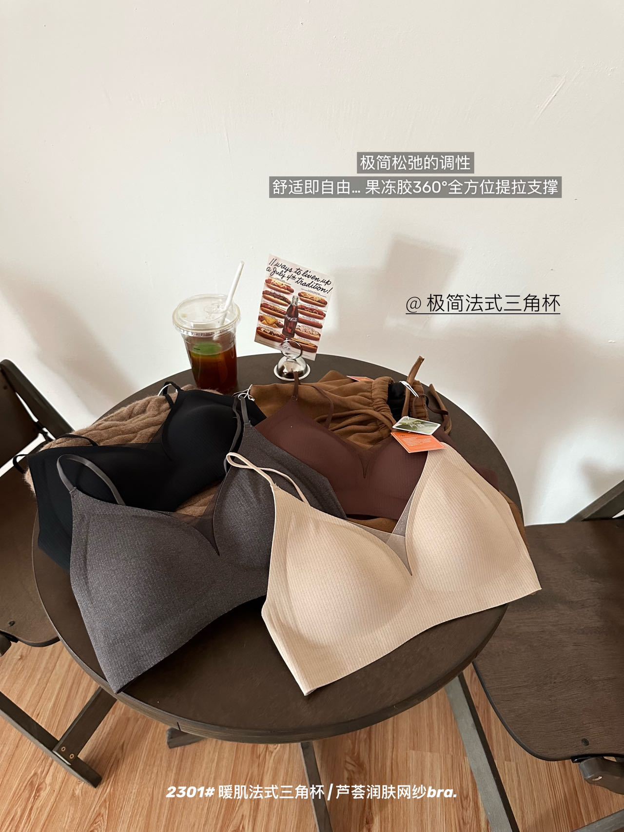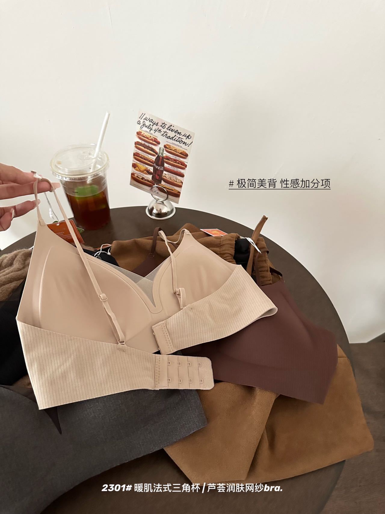 秋冬暖肌大胸显小三角杯网纱内衣法式深V薄款磨毛无痕细肩带文胸