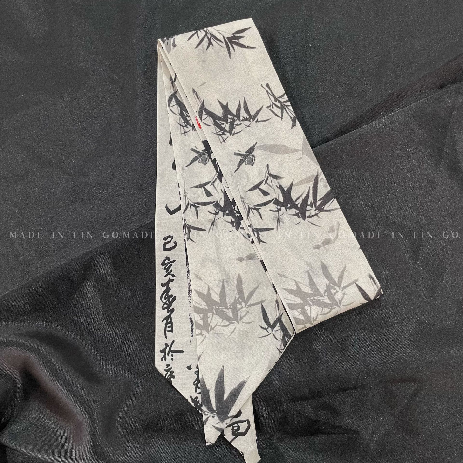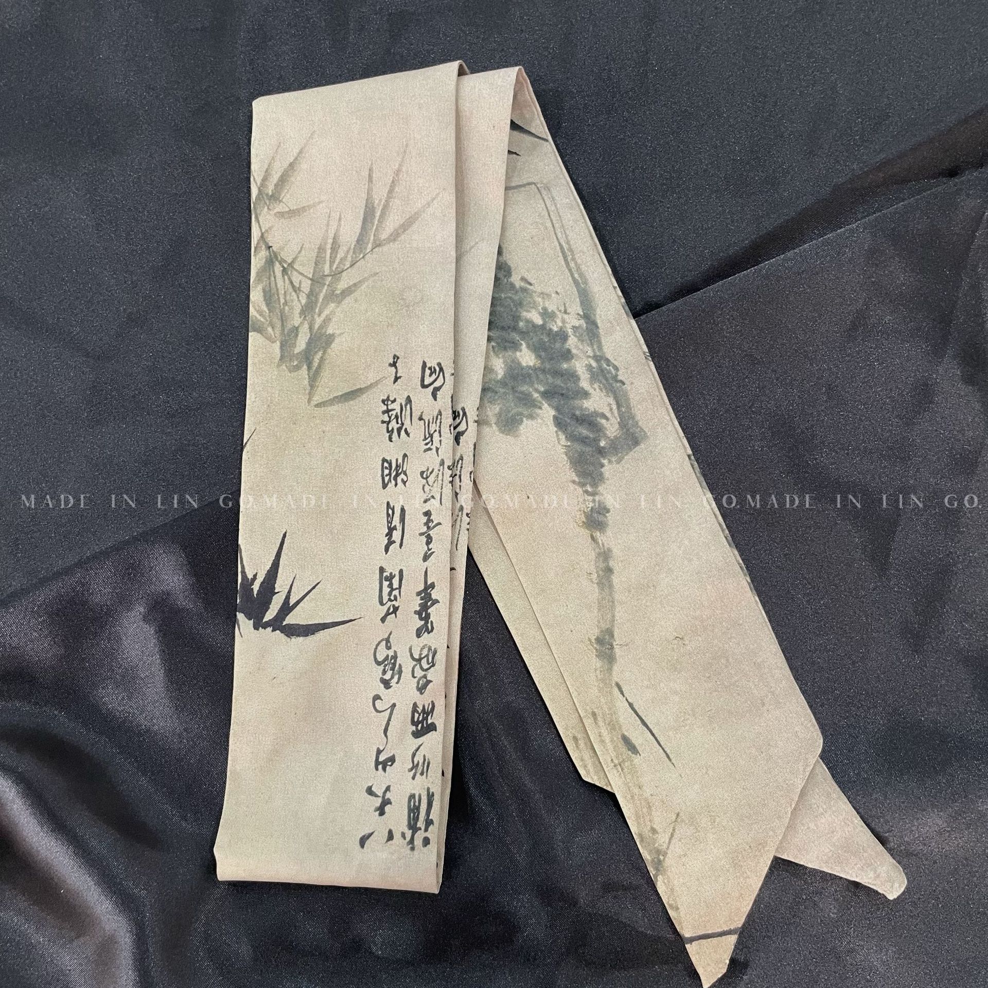 墨竹白鹤新中式古风发带长条丝巾女发饰水墨画中国风飘带发带批发