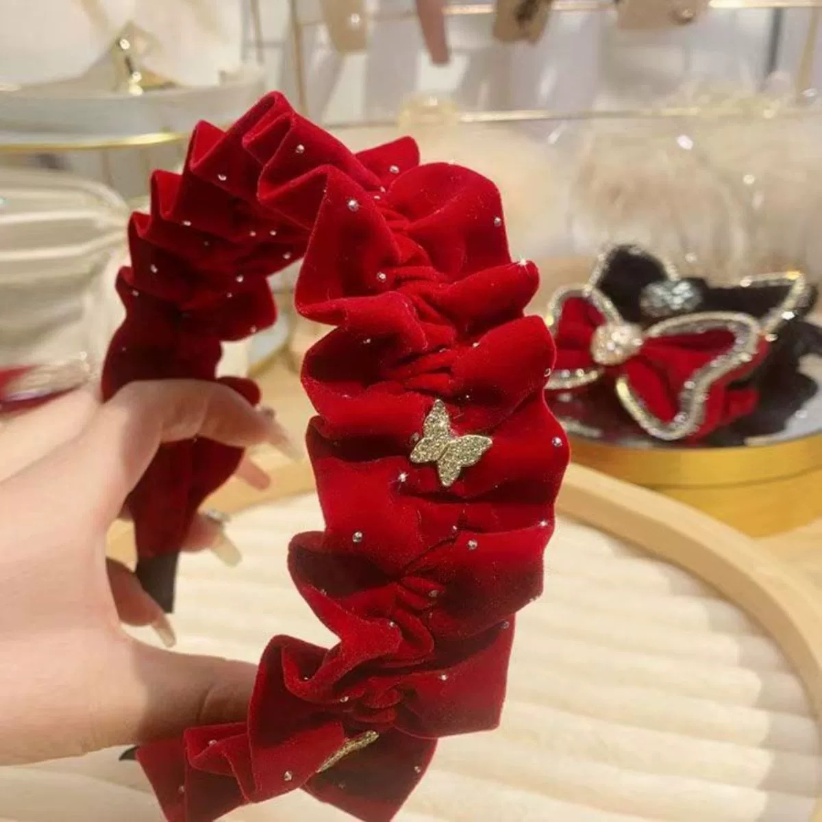 复古丝绒褶皱发箍法式蝴蝶防滑洗脸发卡高颅顶压发宽边头箍显发量
