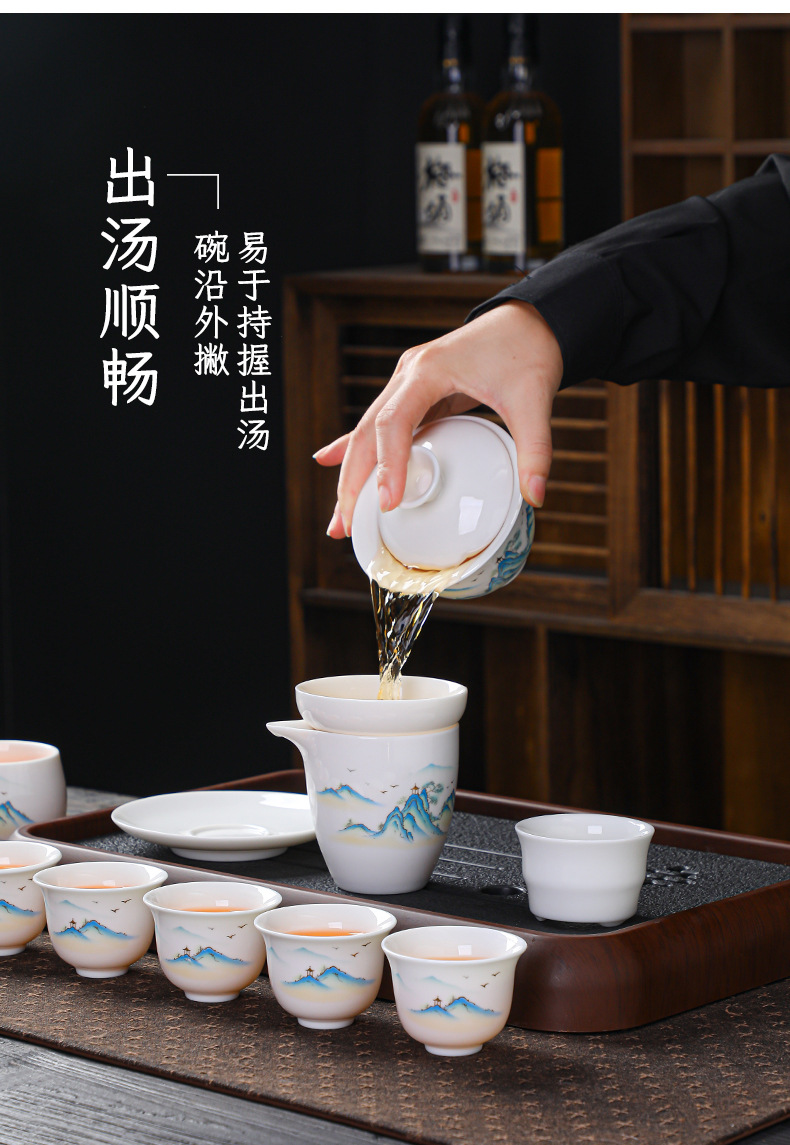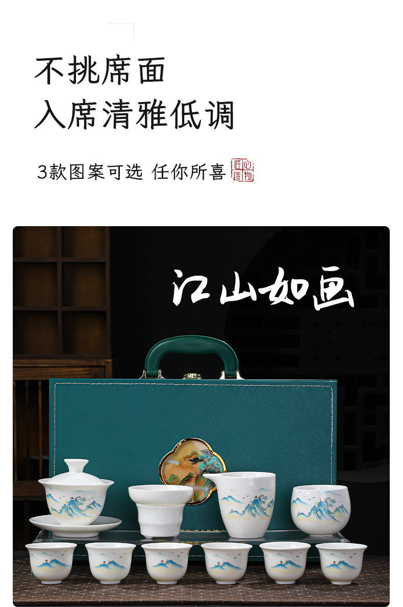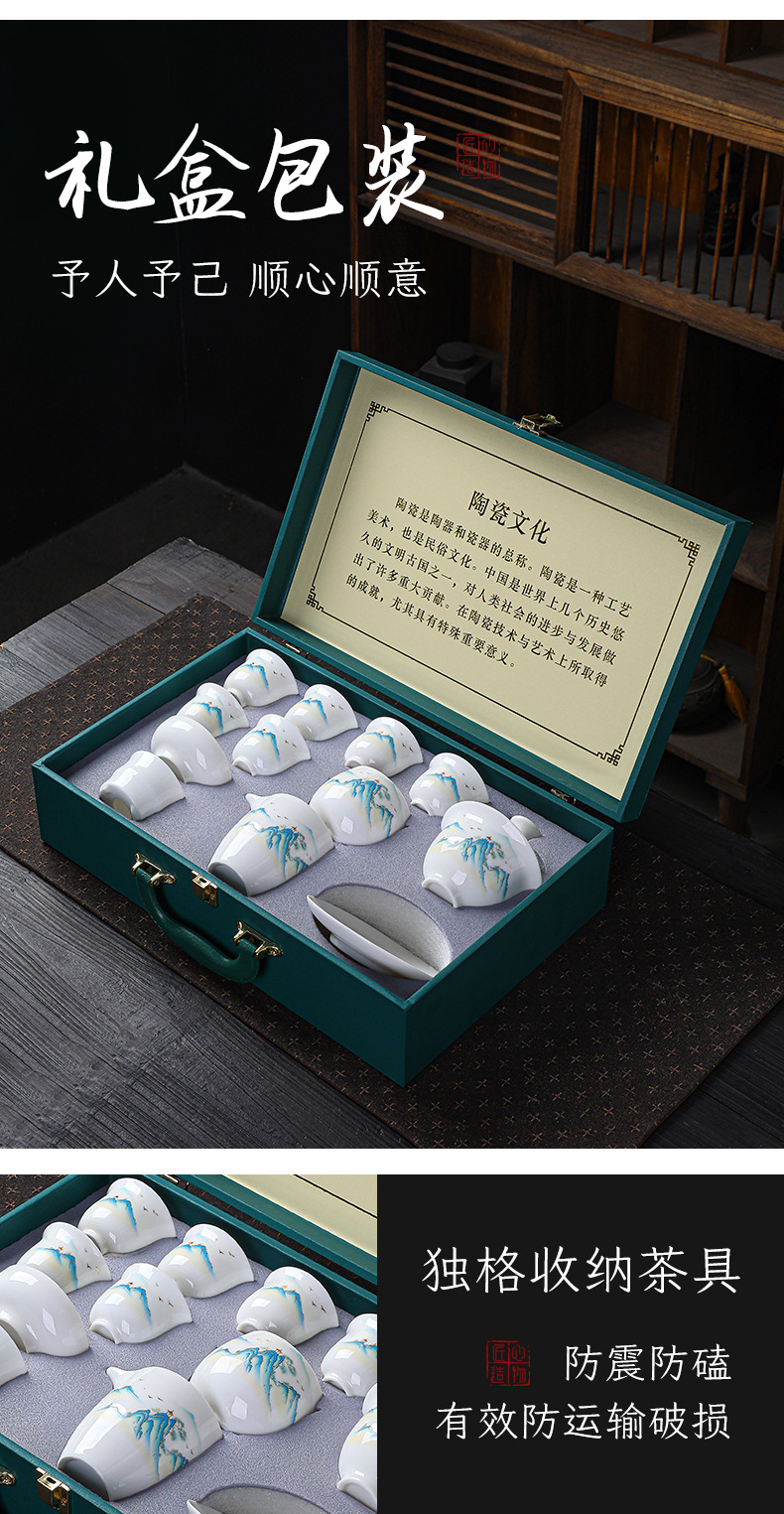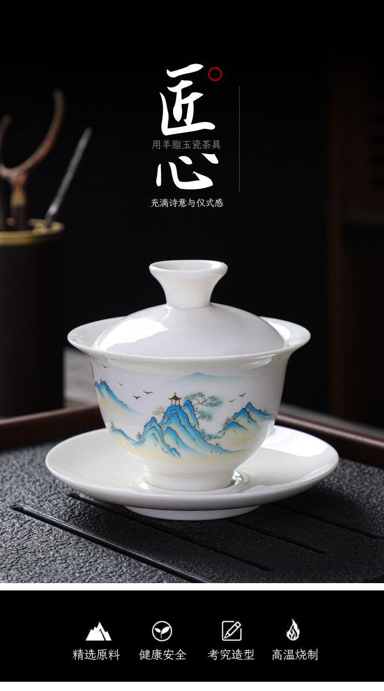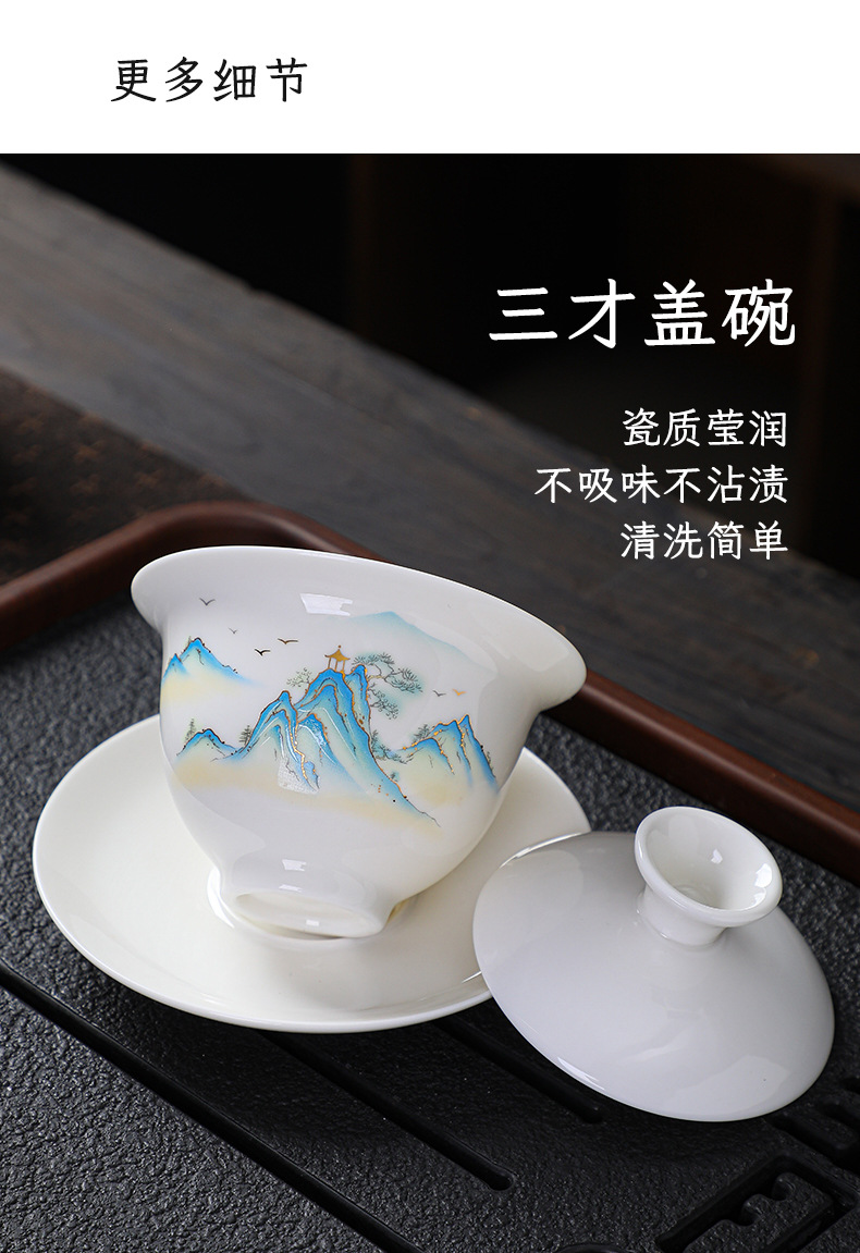 高档羊脂玉白瓷水墨盖碗功夫茶具套装礼盒整套盖碗陶瓷伴手礼品
