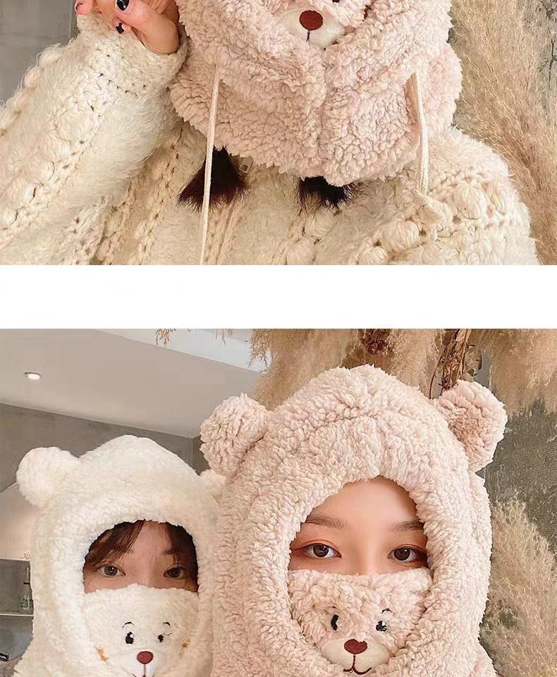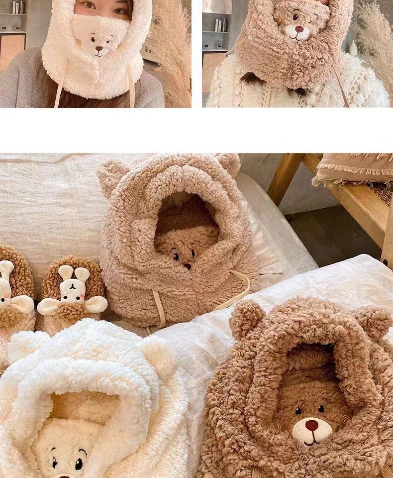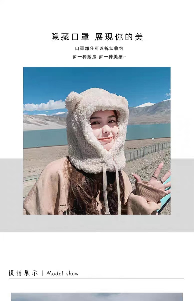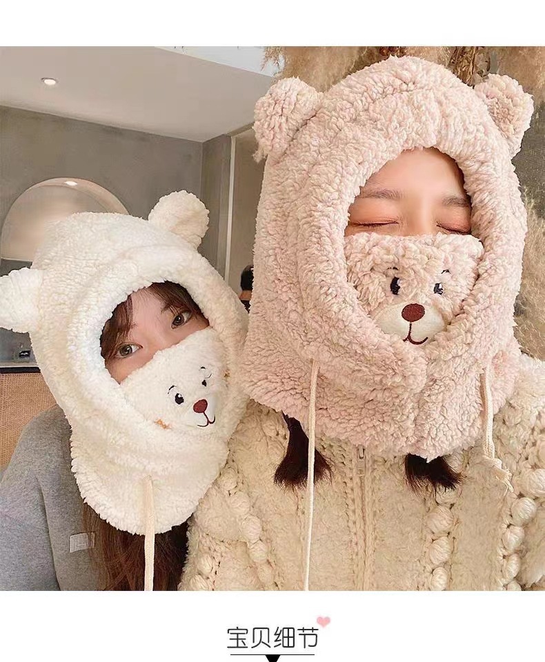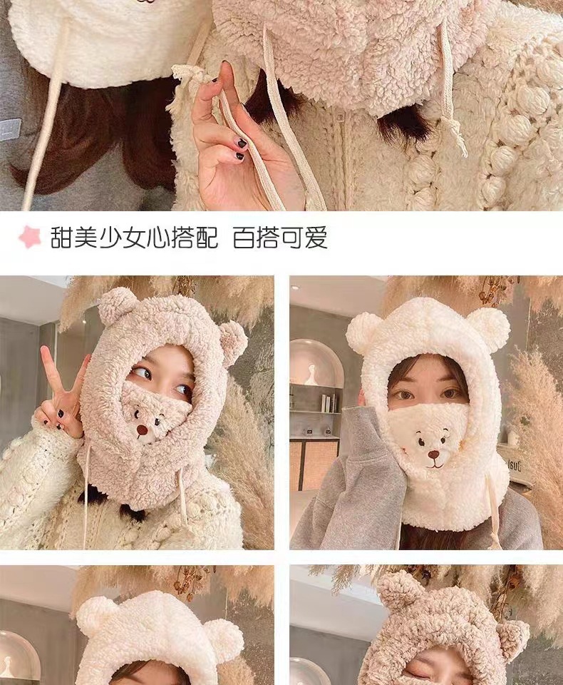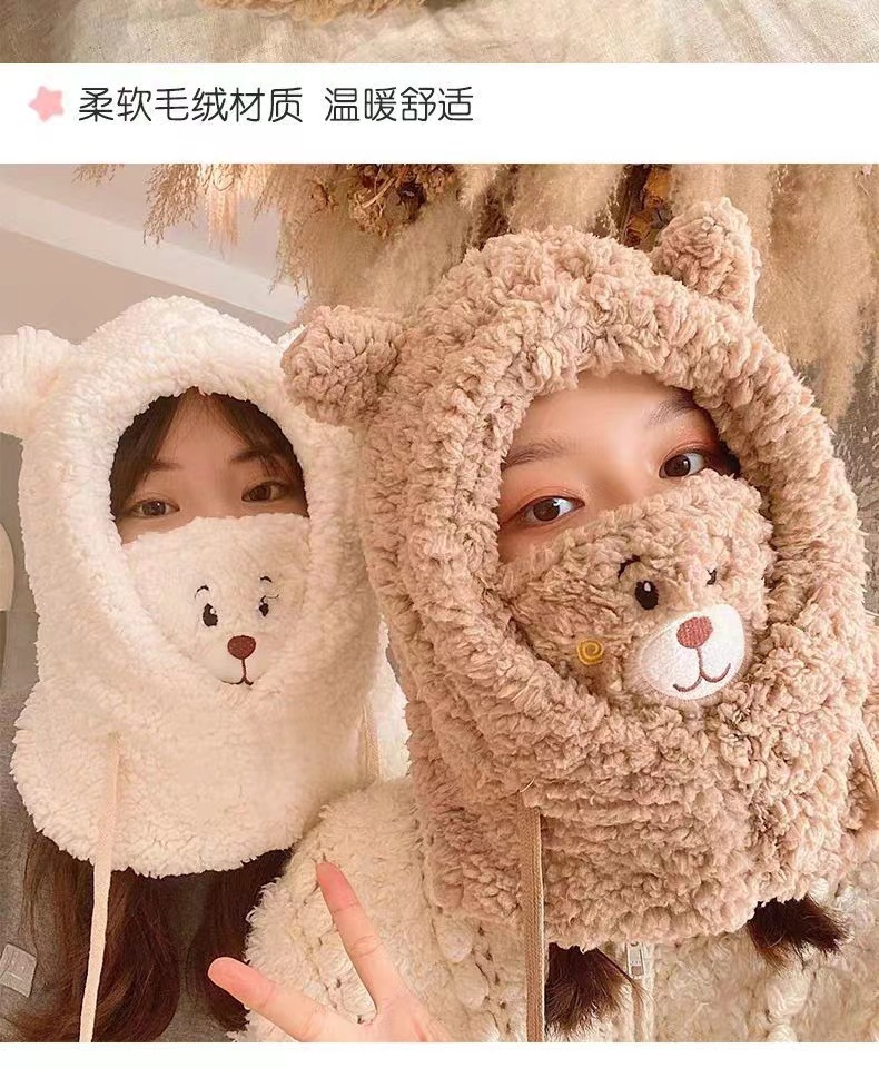 毛绒可爱小熊口罩一体帽子女秋冬韩版骑车防风保暖护耳围脖雷锋帽