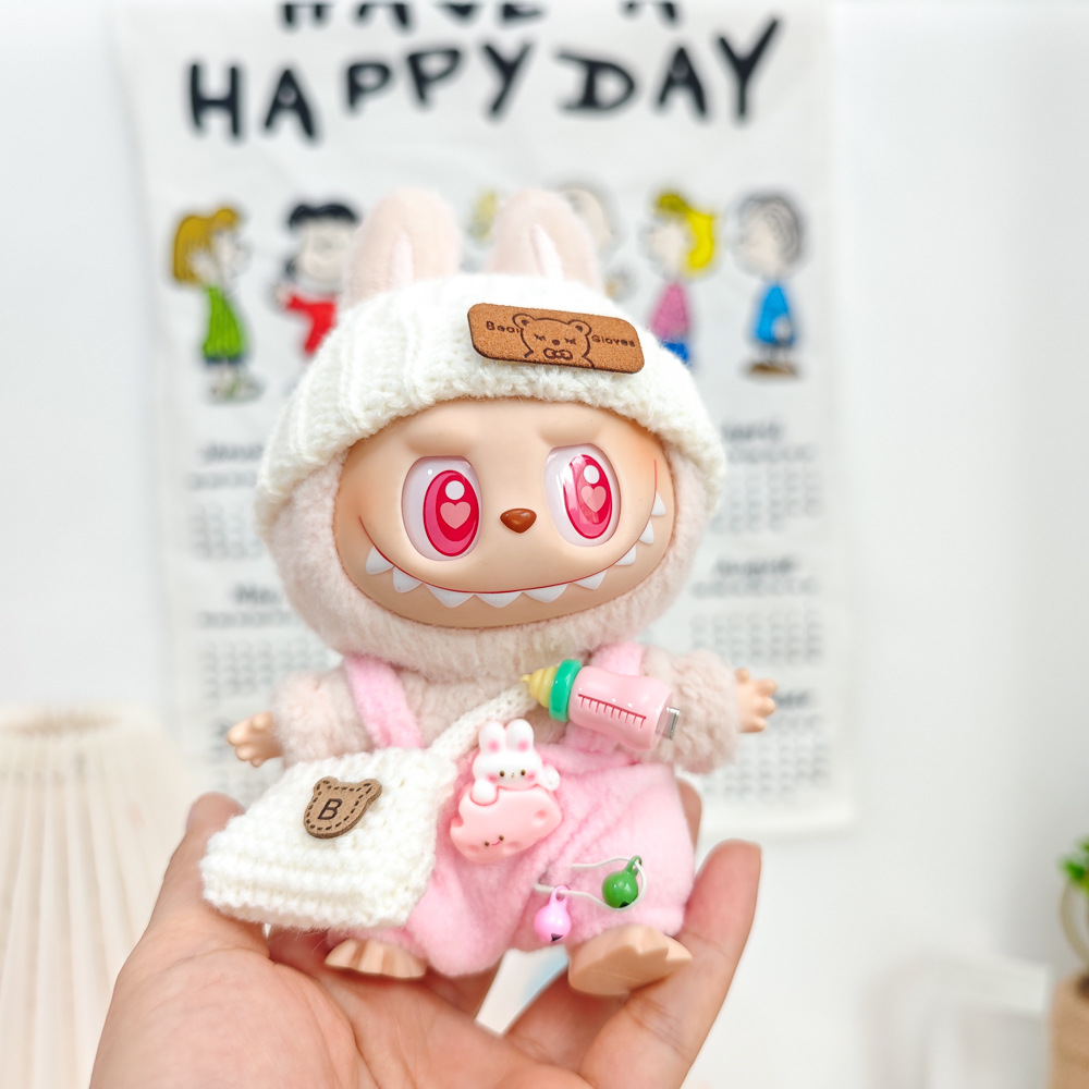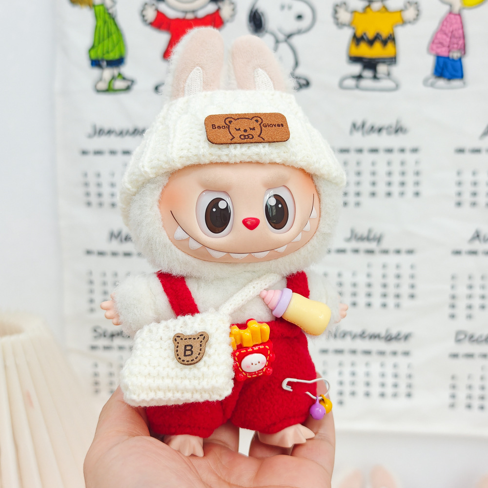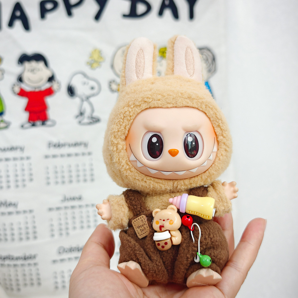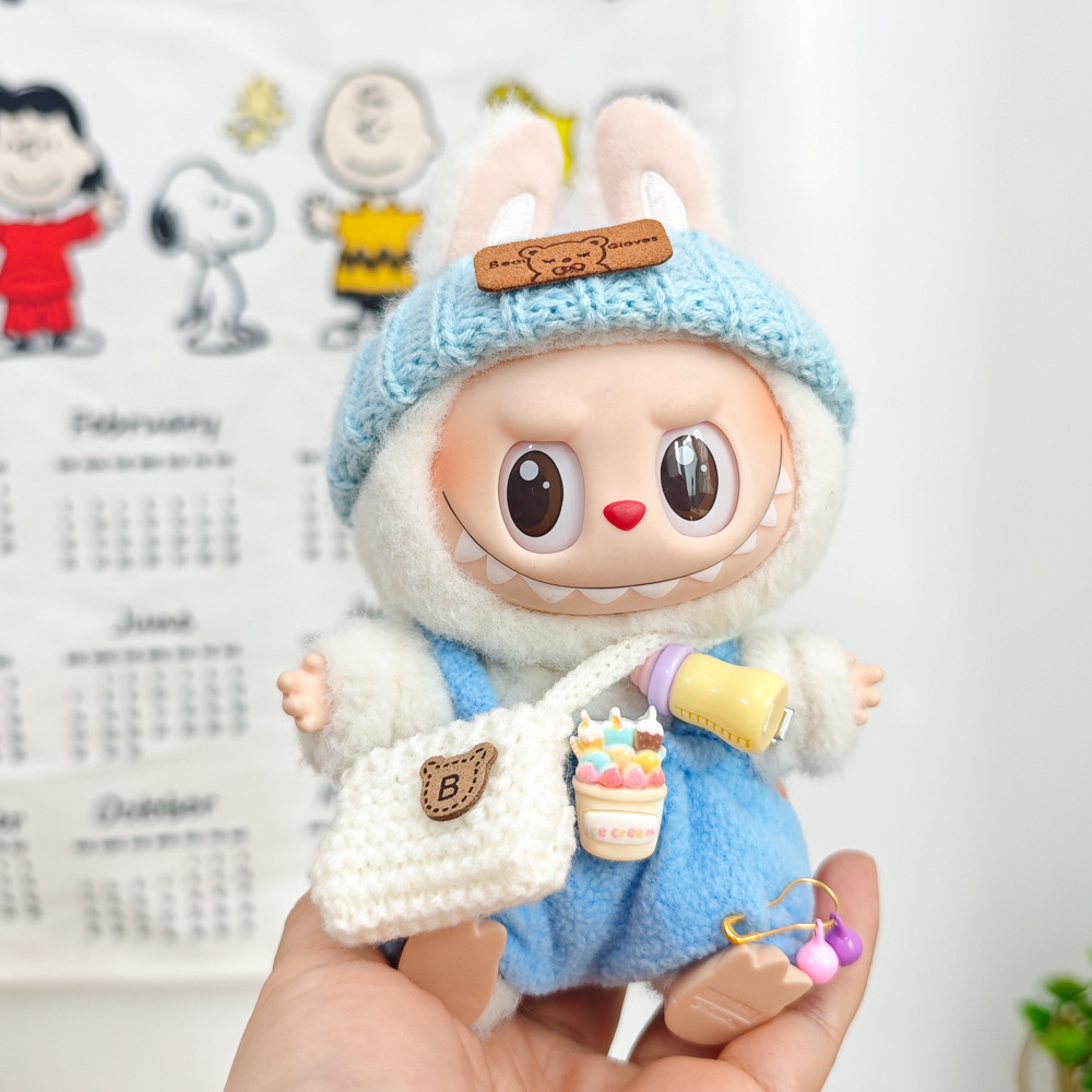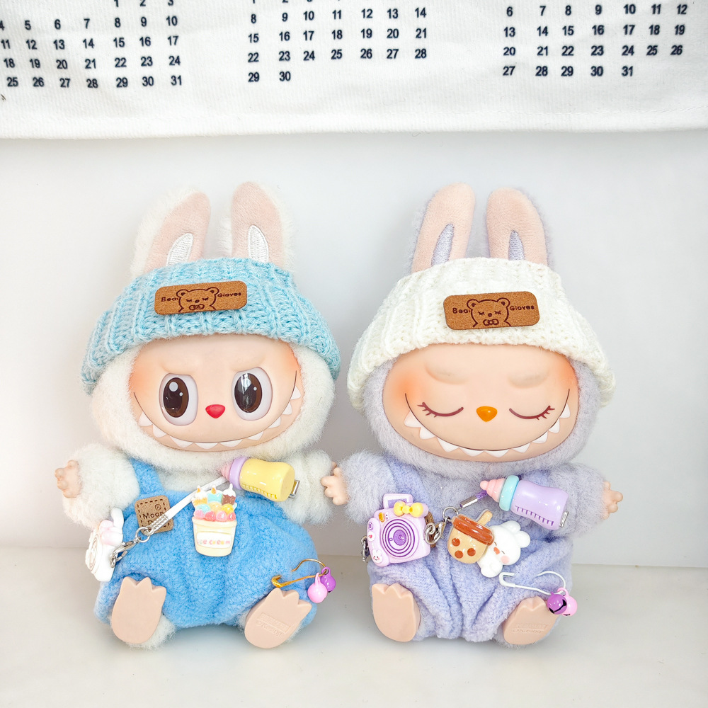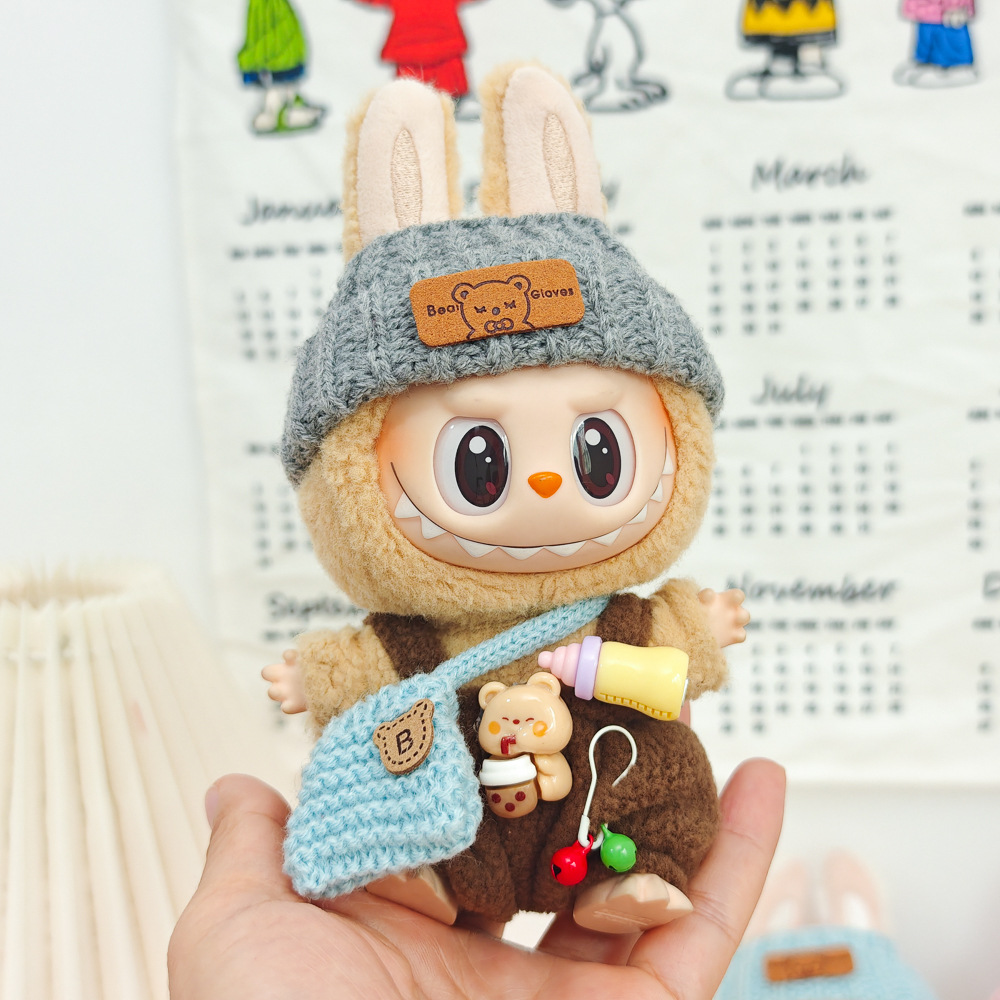 17厘米拉布布钥匙扣挂件娃衣服可爱labubu奶瓶背带裤毛线跨包套装
