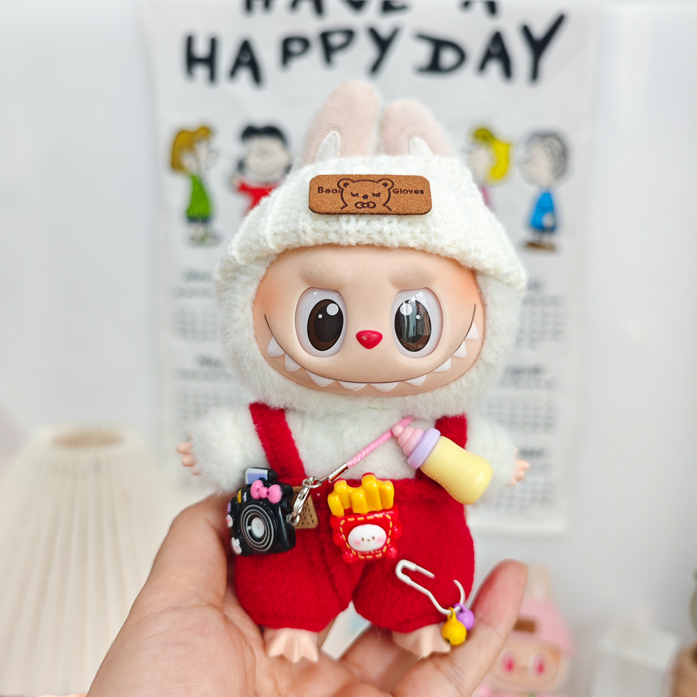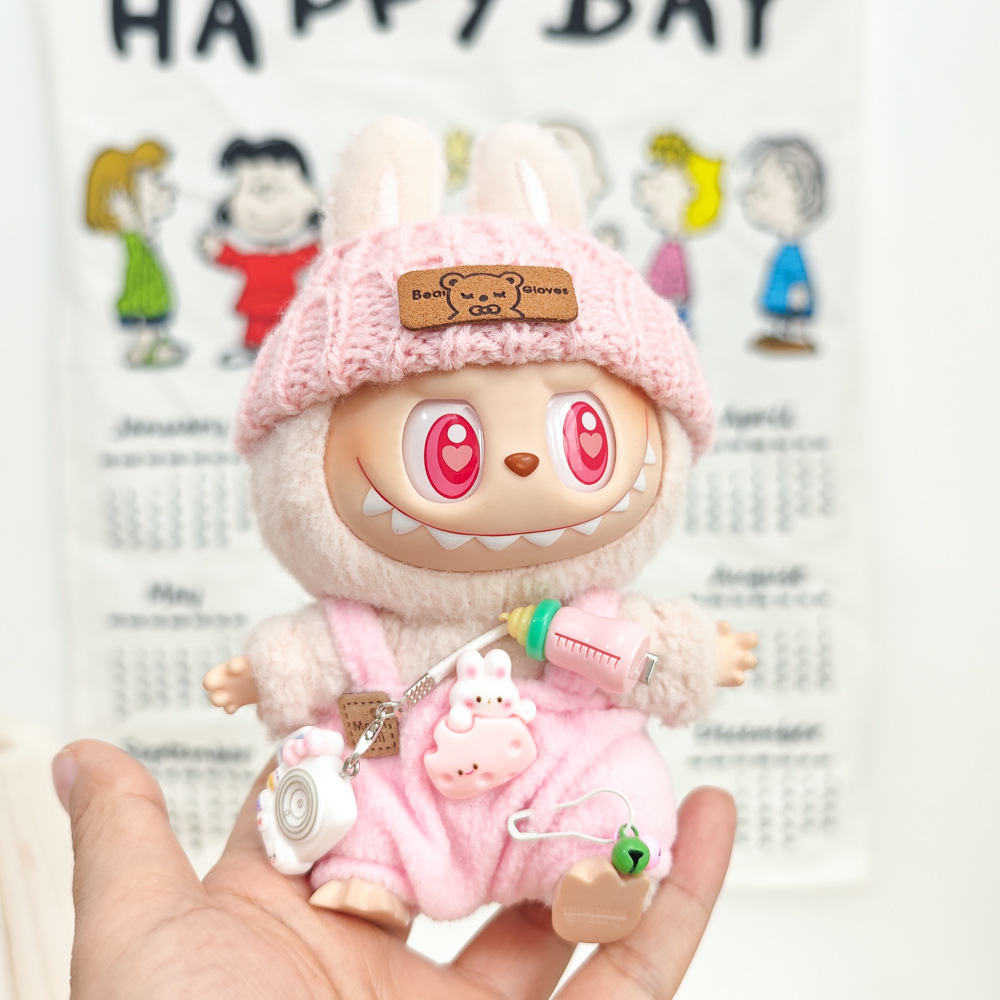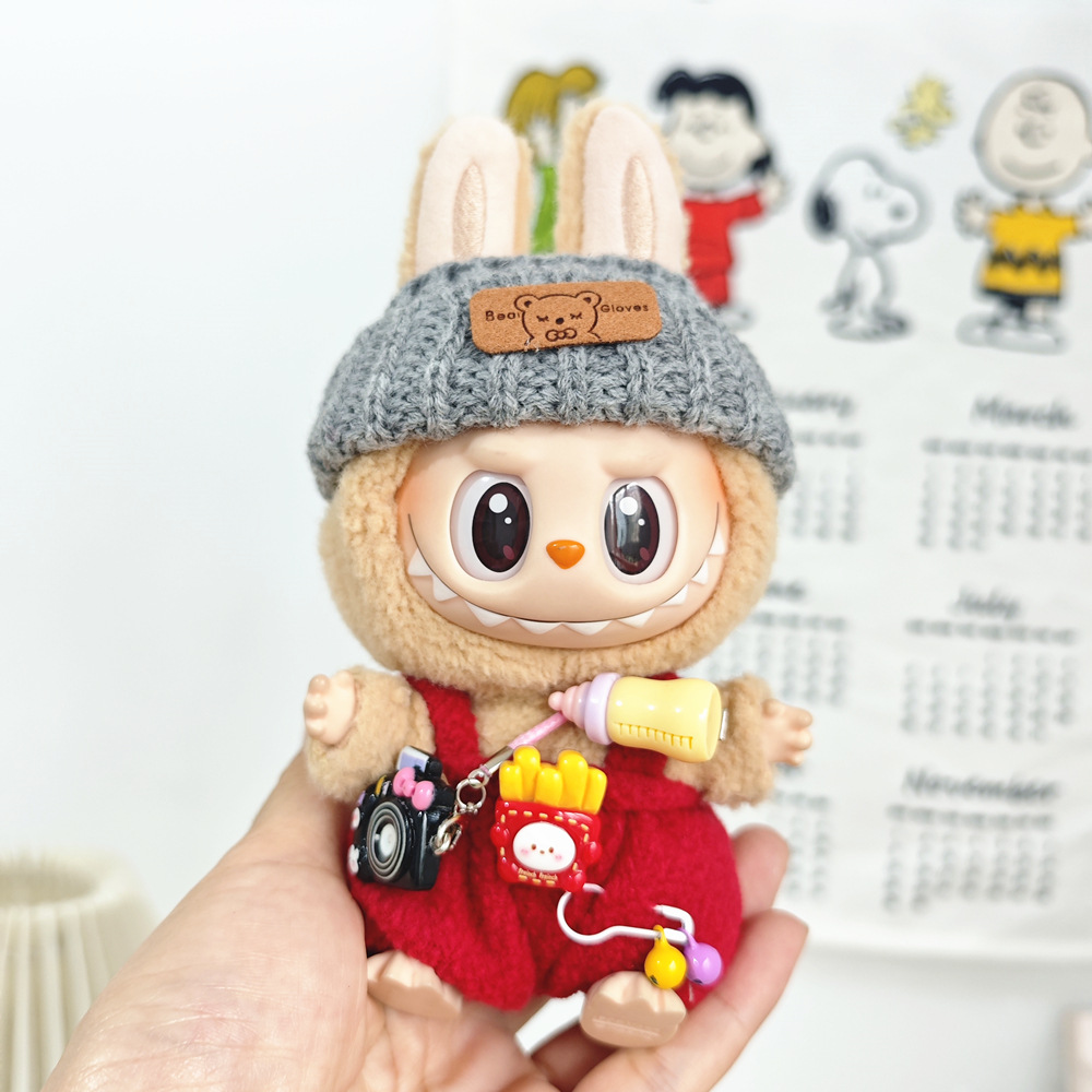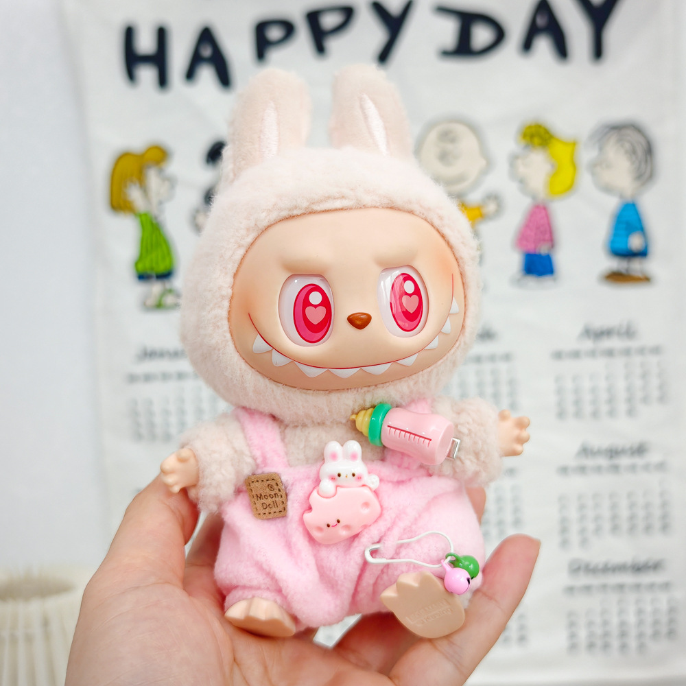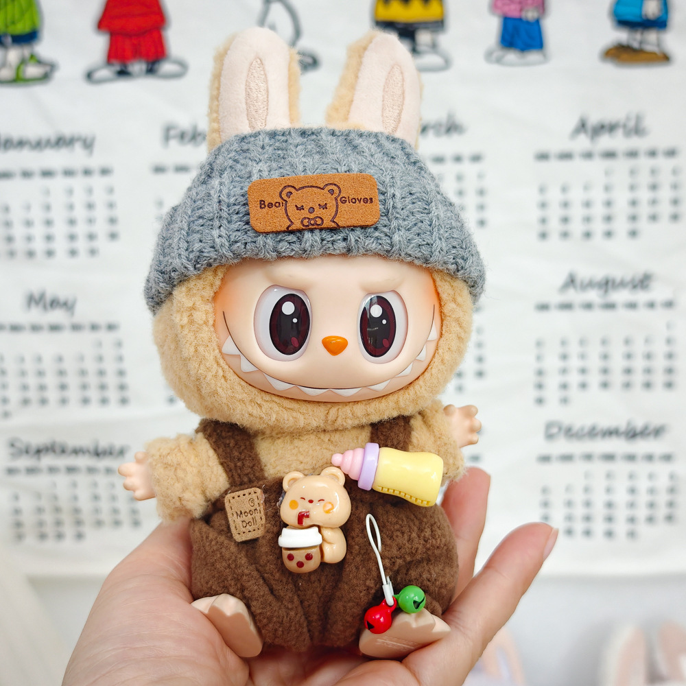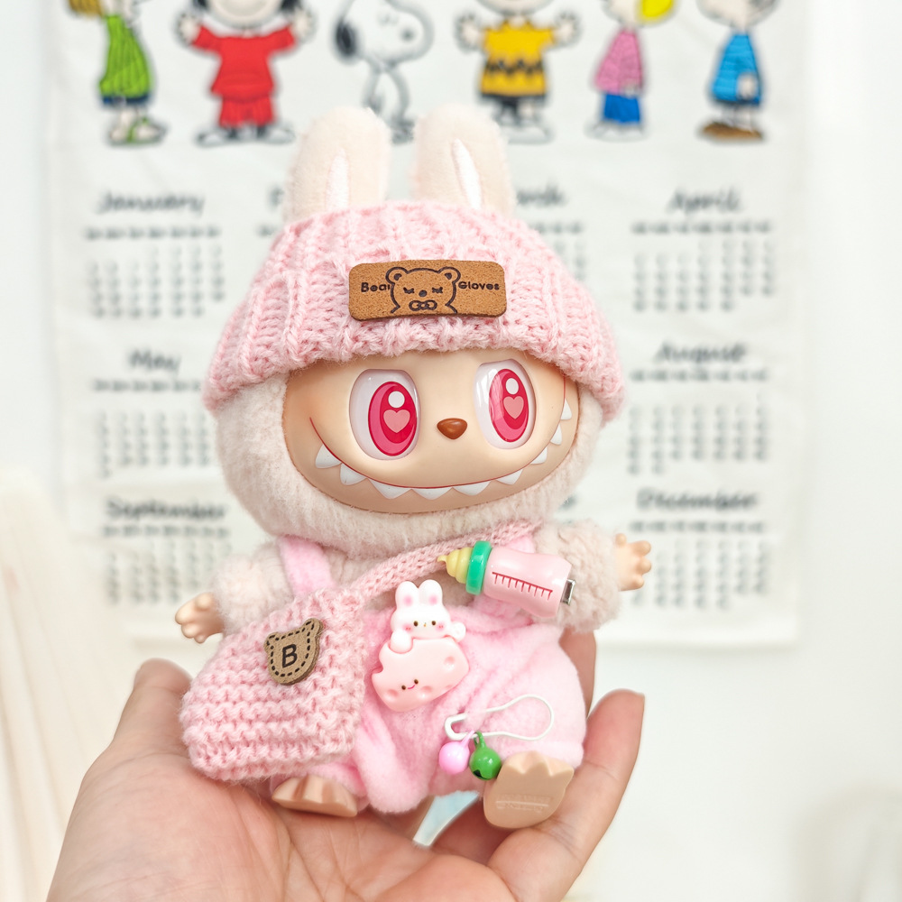 17厘米拉布布钥匙扣挂件娃衣服可爱labubu奶瓶背带裤毛线跨包套装