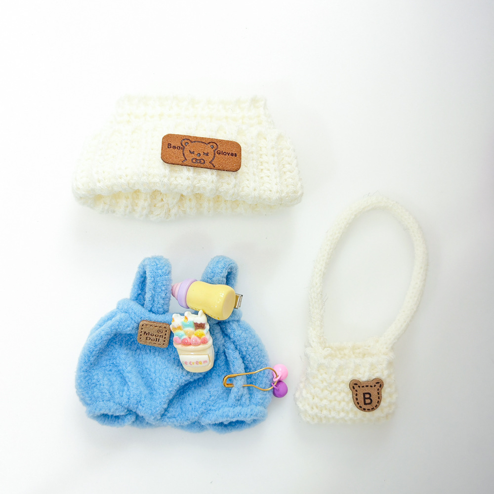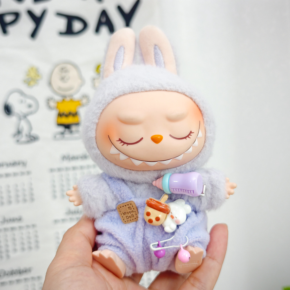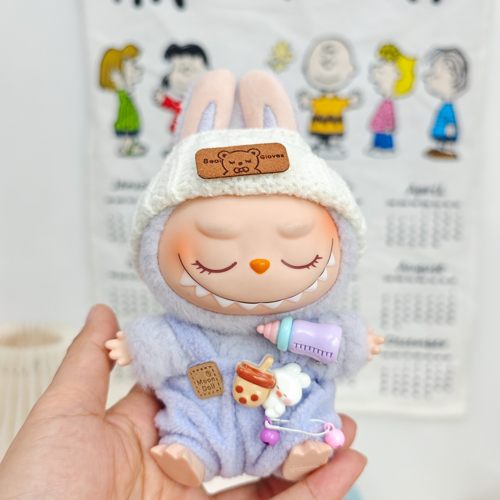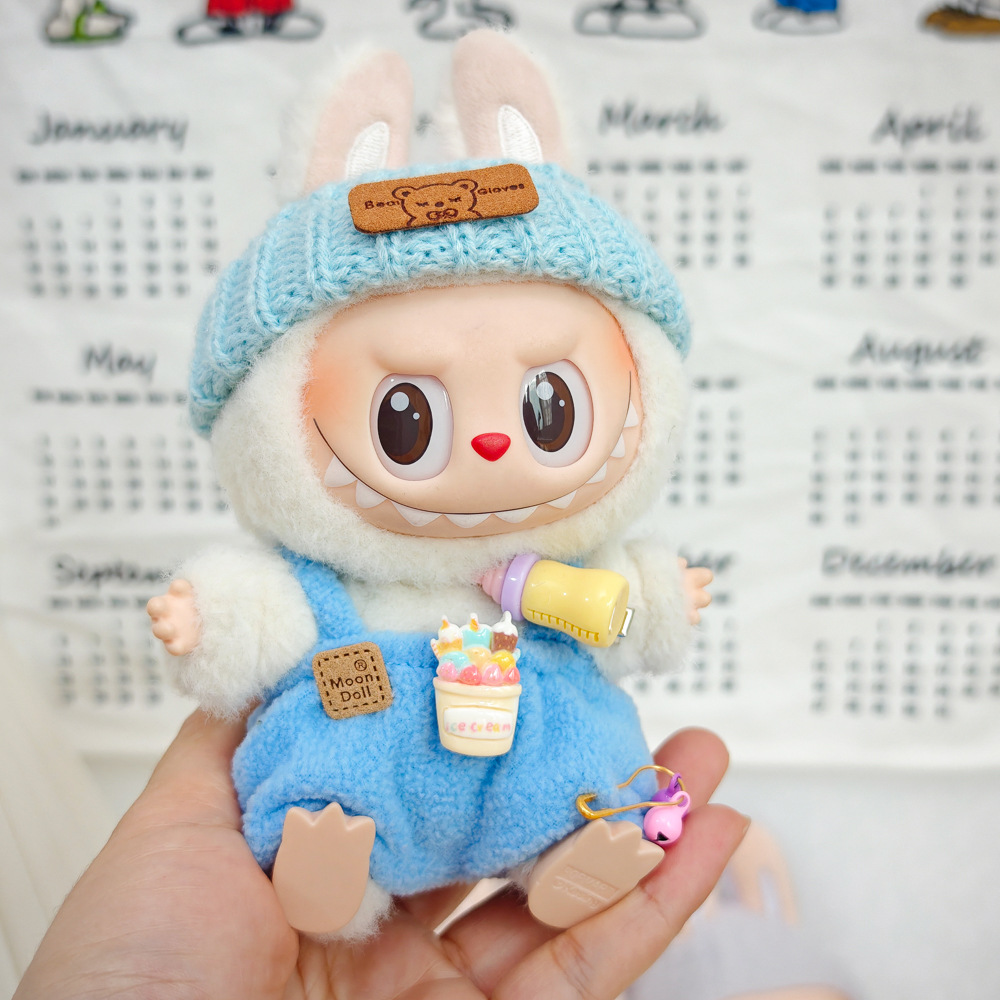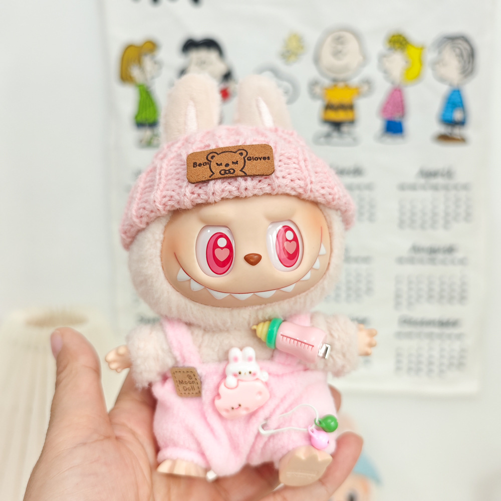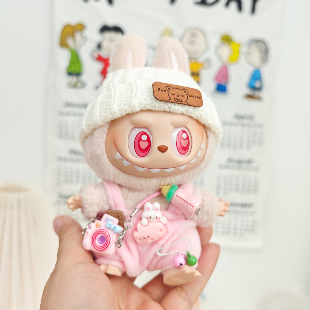 17厘米拉布布钥匙扣挂件娃衣服可爱labubu奶瓶背带裤毛线跨包套装