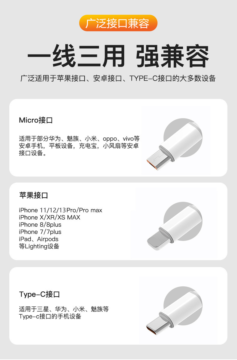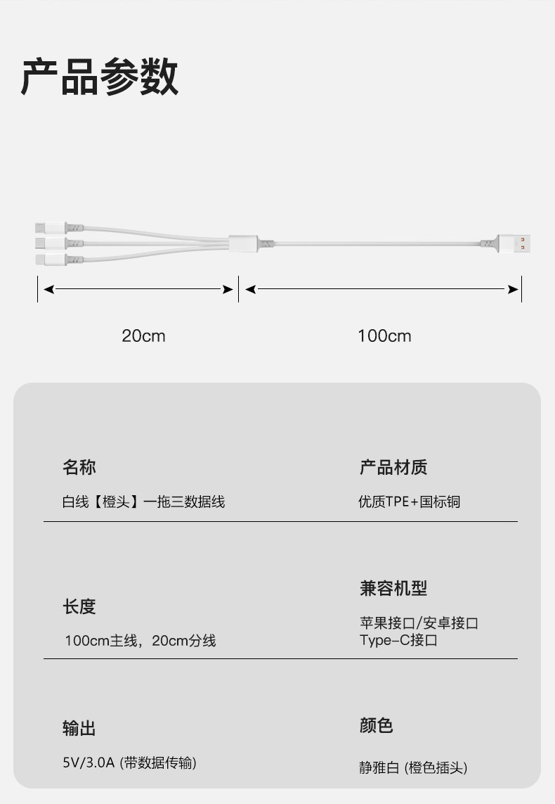 多头白线一拖三数据线typec超级快充多兼容支持66w三头手机充电线