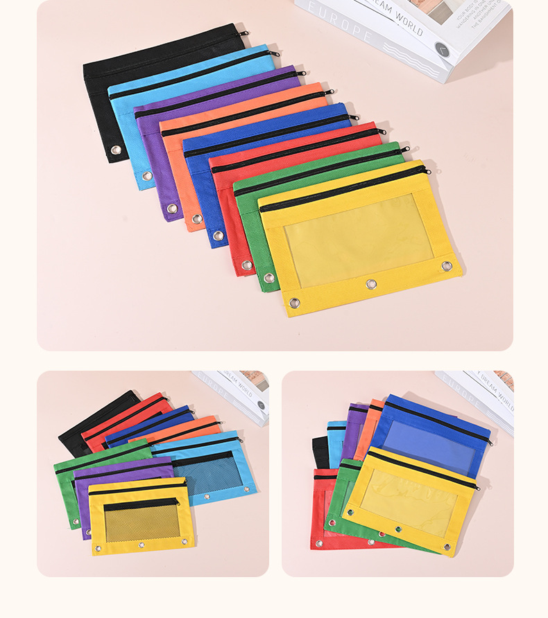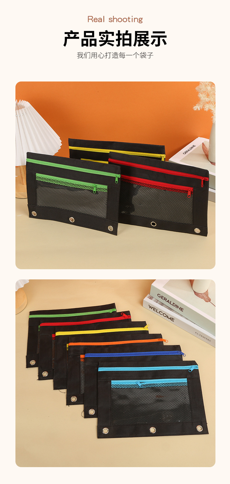 跨境双拉链文件文具袋双层网格三孔笔袋可视收纳袋大容量纯色笔袋