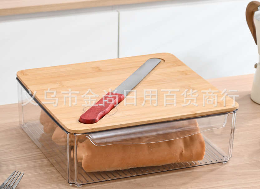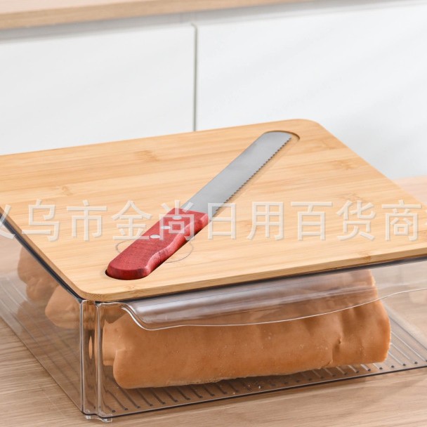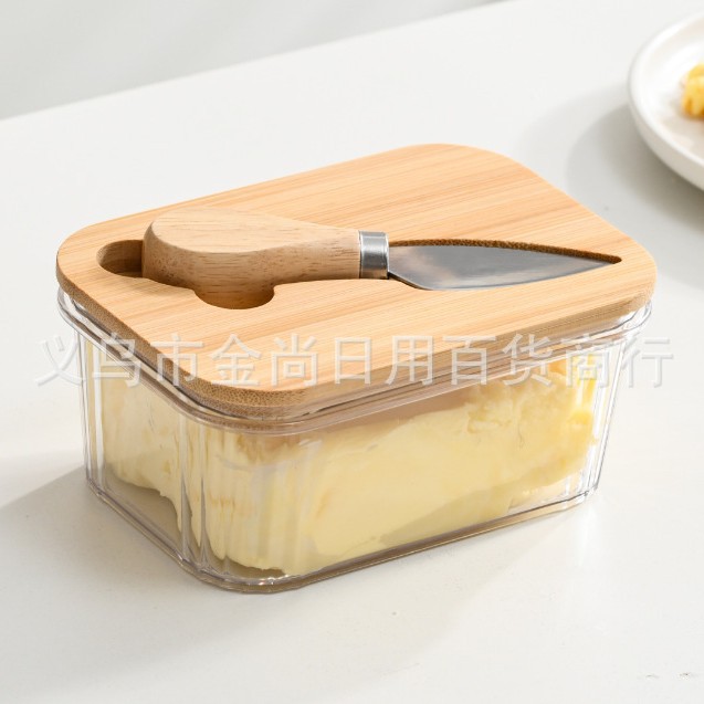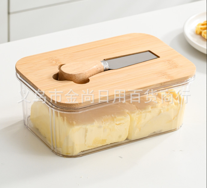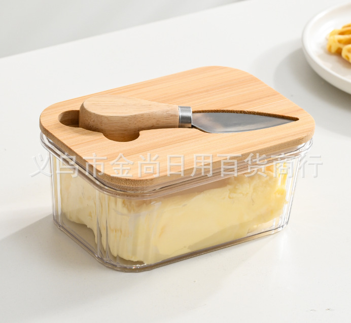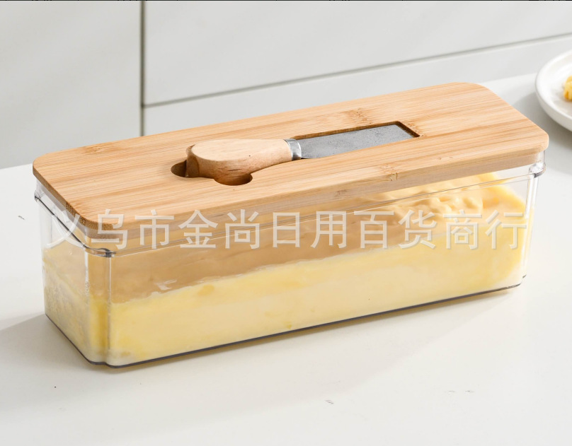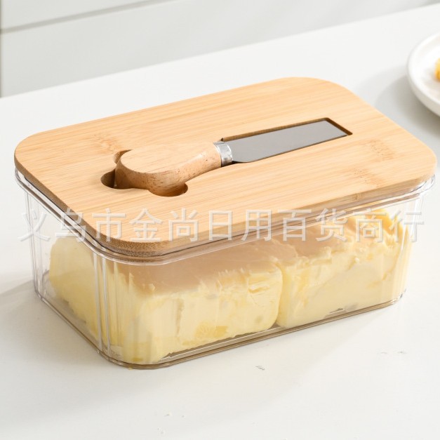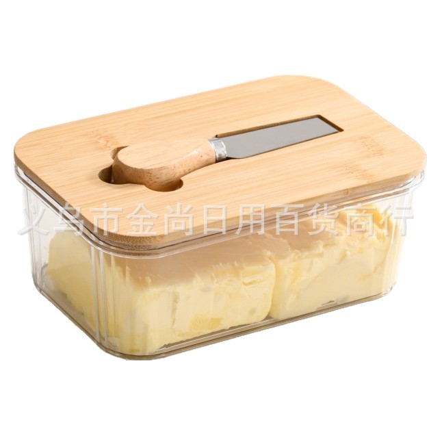 西式黄油盒PET+竹木带盖抹刀长方形家用奶酪保鲜密封罐家用奶酪