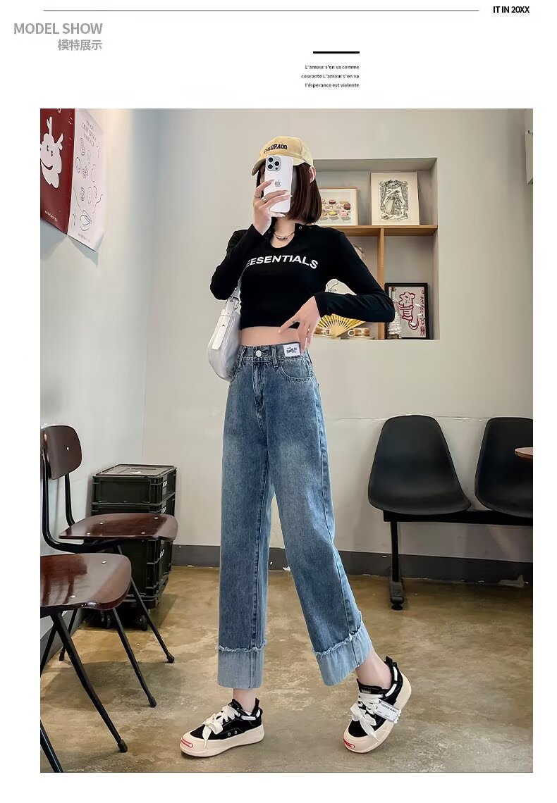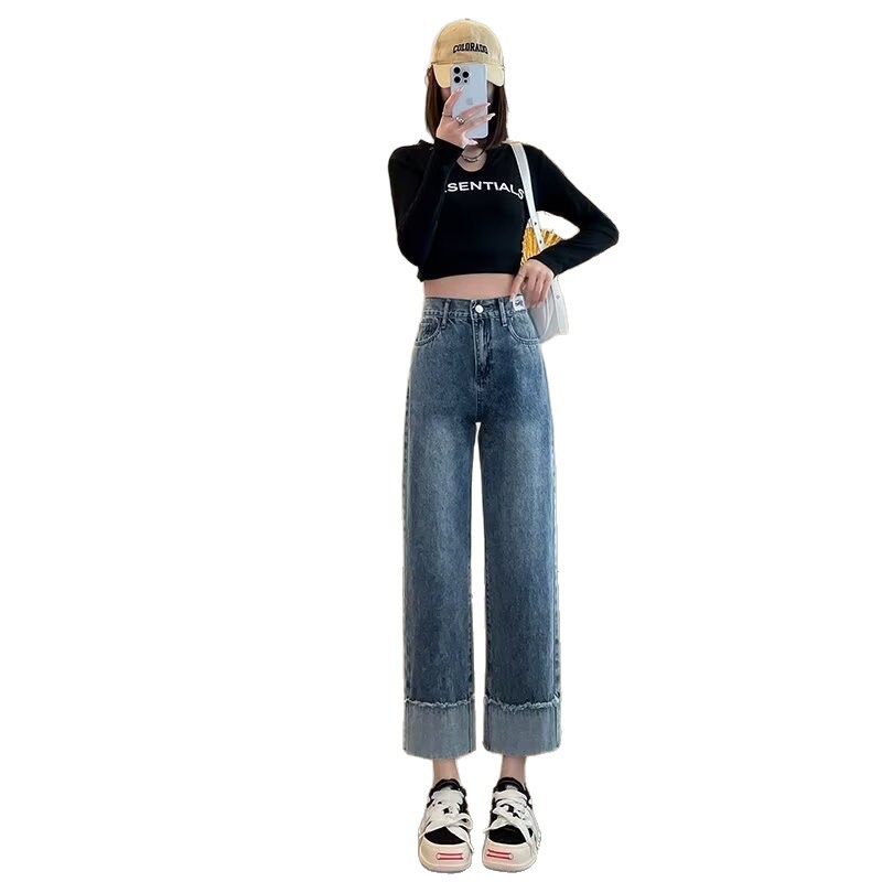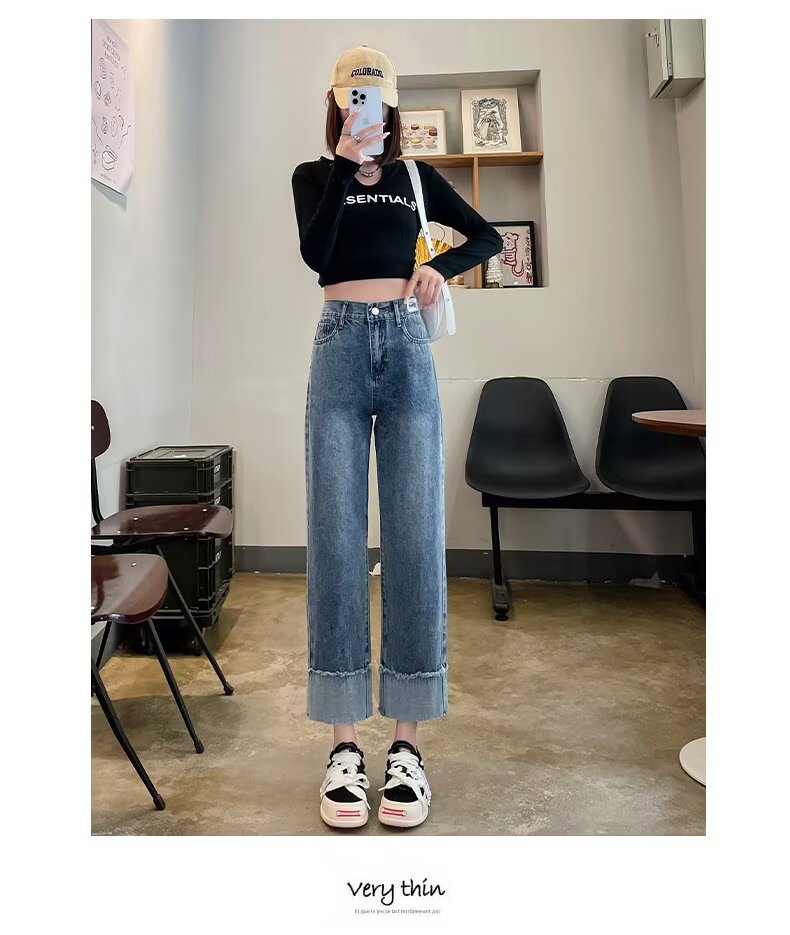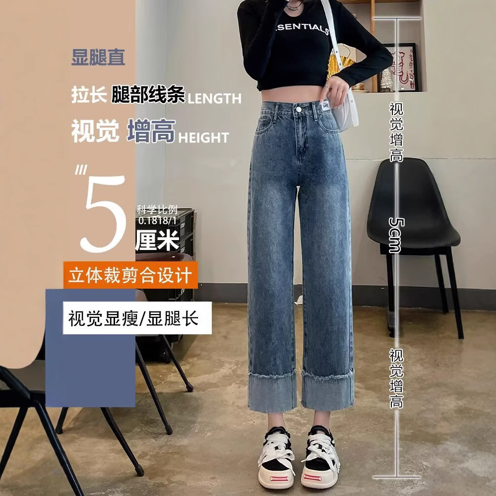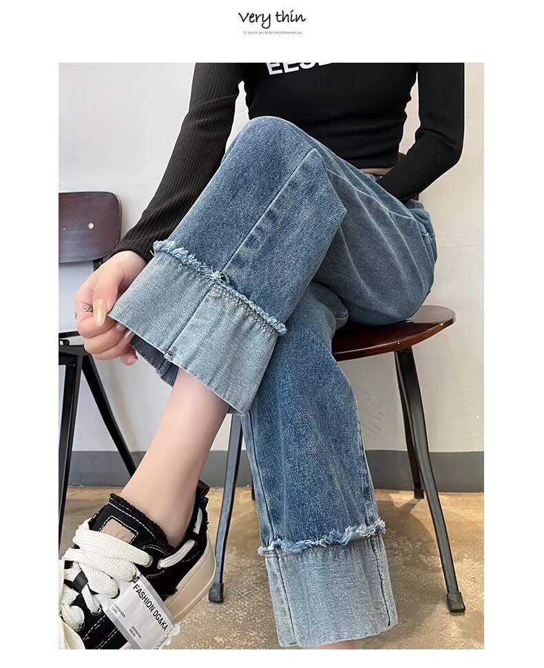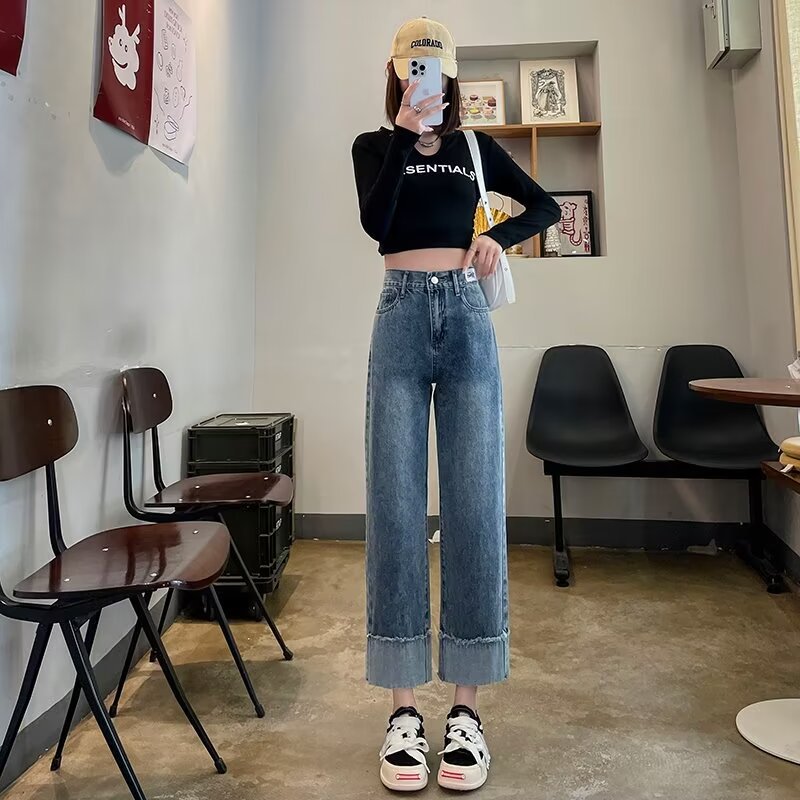 韩版休闲直筒牛仔裤女款2025年夏季新款高腰显瘦百搭松紧腰牛仔裤