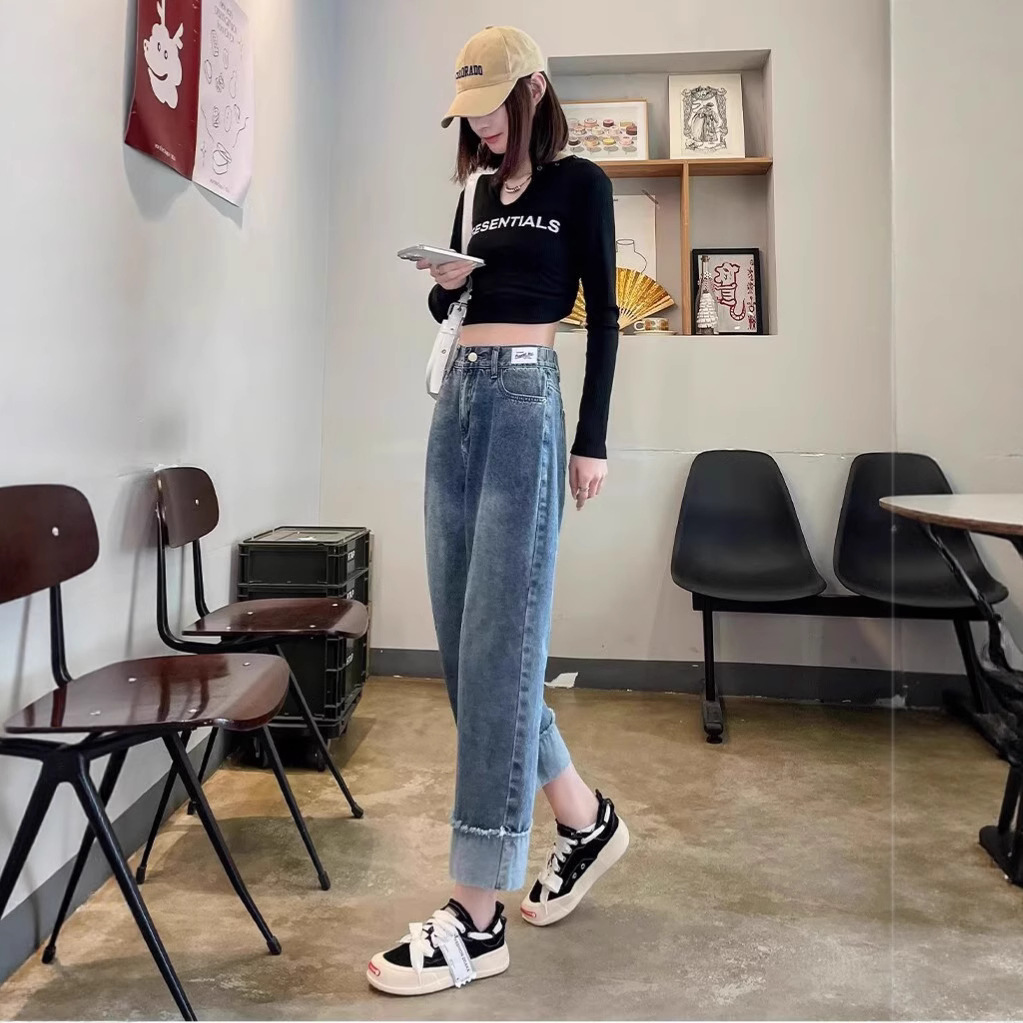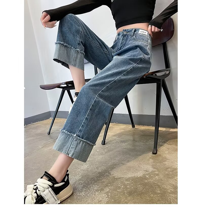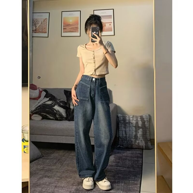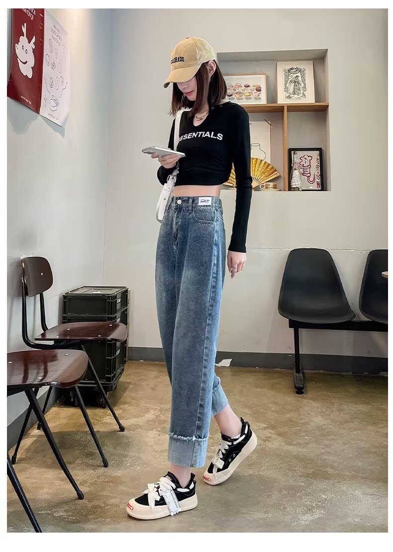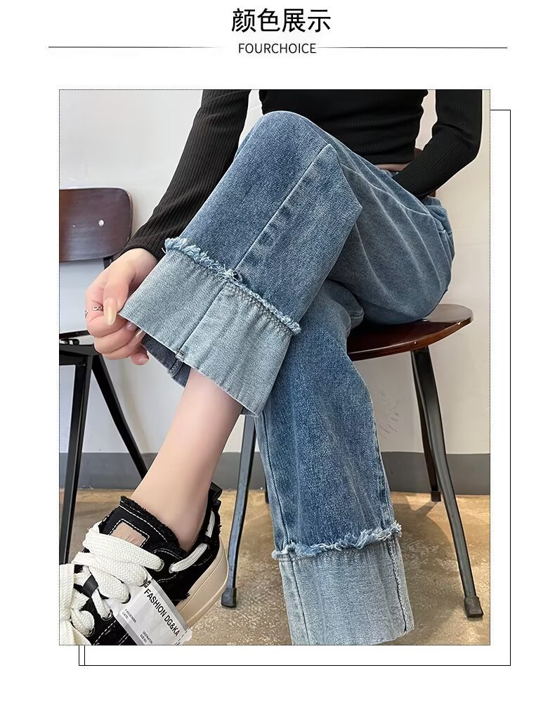 韩版休闲直筒牛仔裤女款2025年夏季新款高腰显瘦百搭松紧腰牛仔裤
