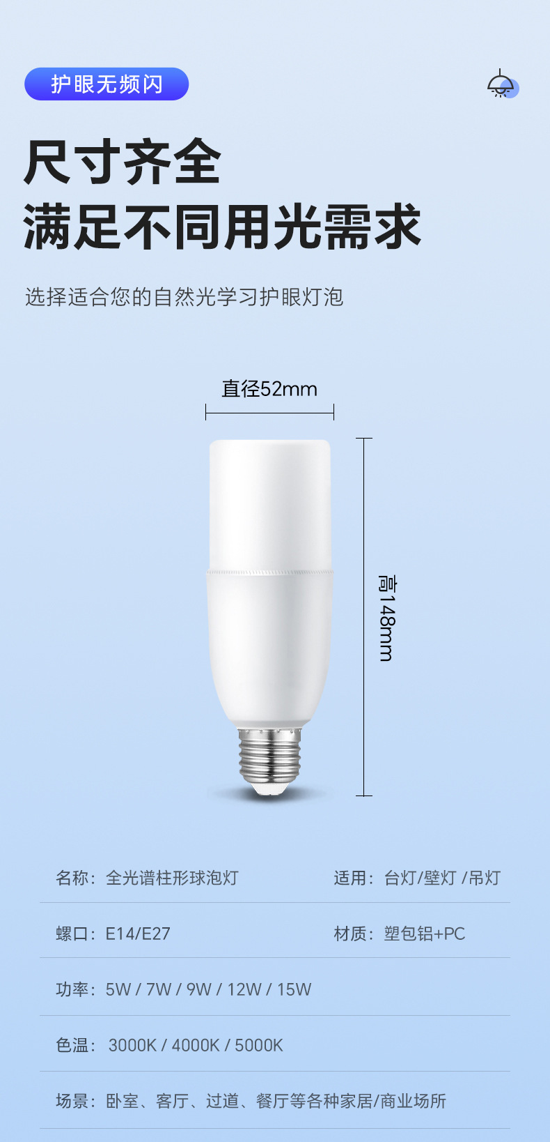 | warm light 3000k-cylindrical bulb(暖光3000K—柱形灯泡) | USD $1.39 | 12322 piece available |