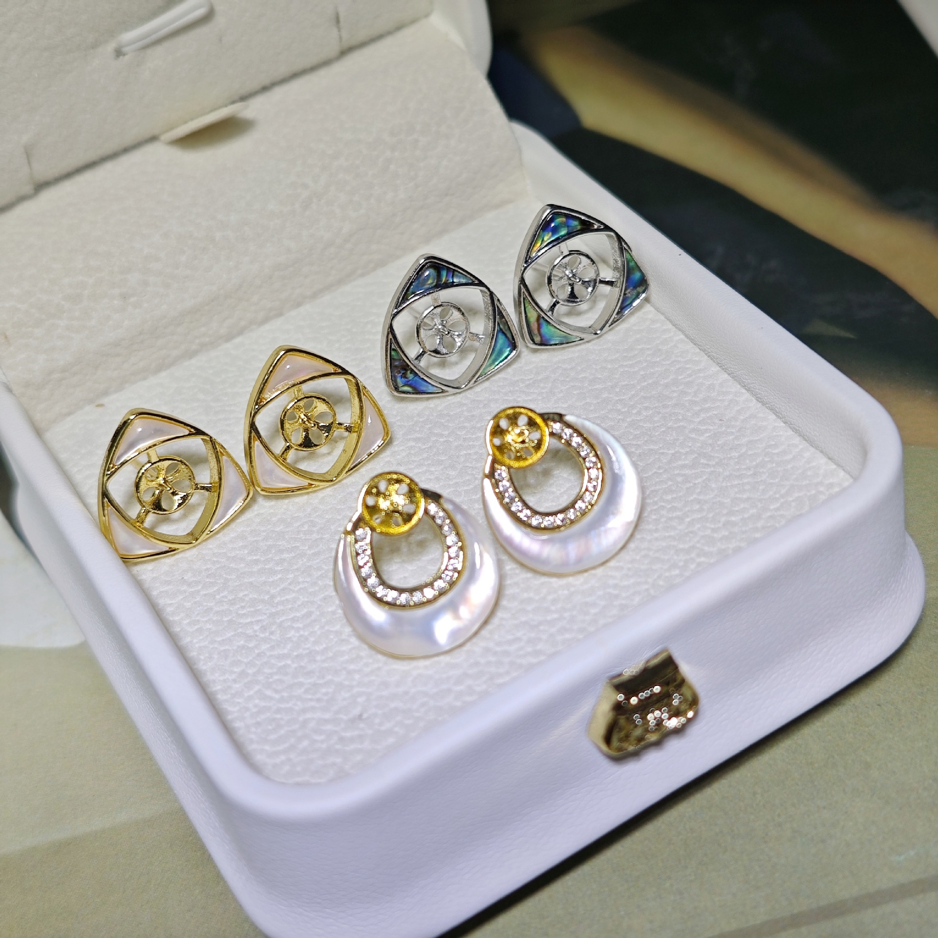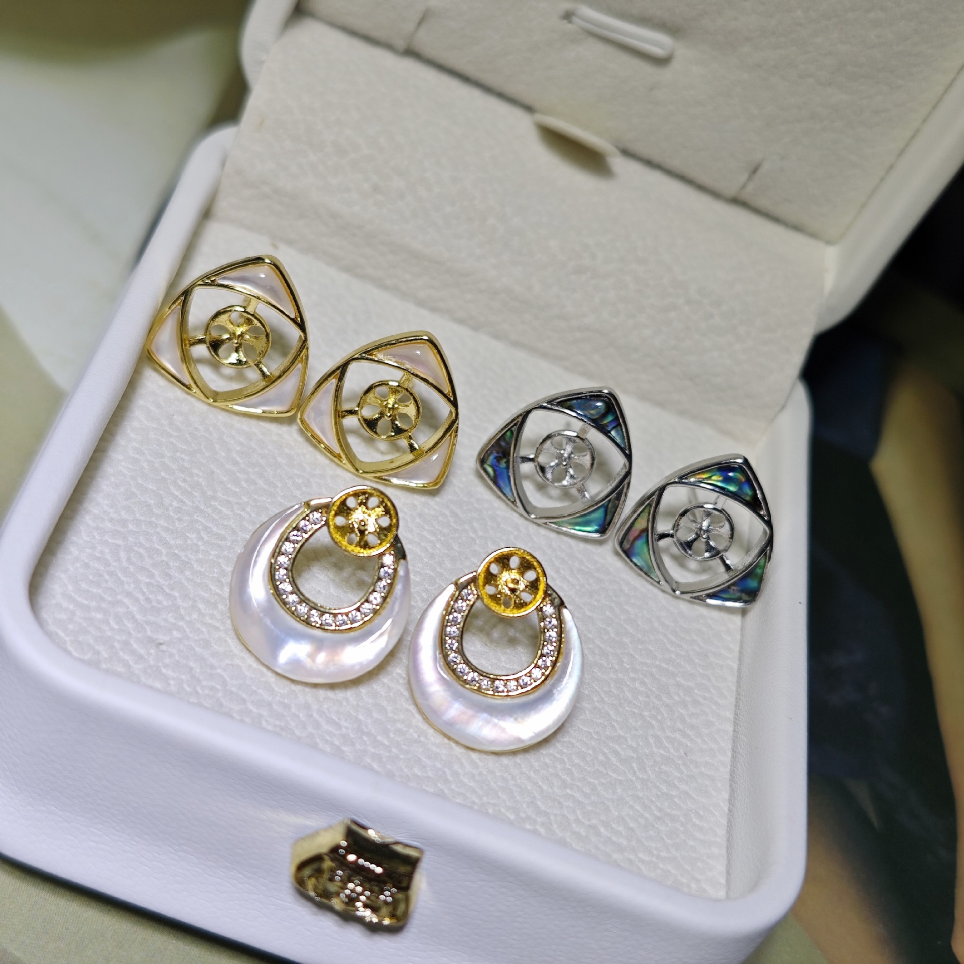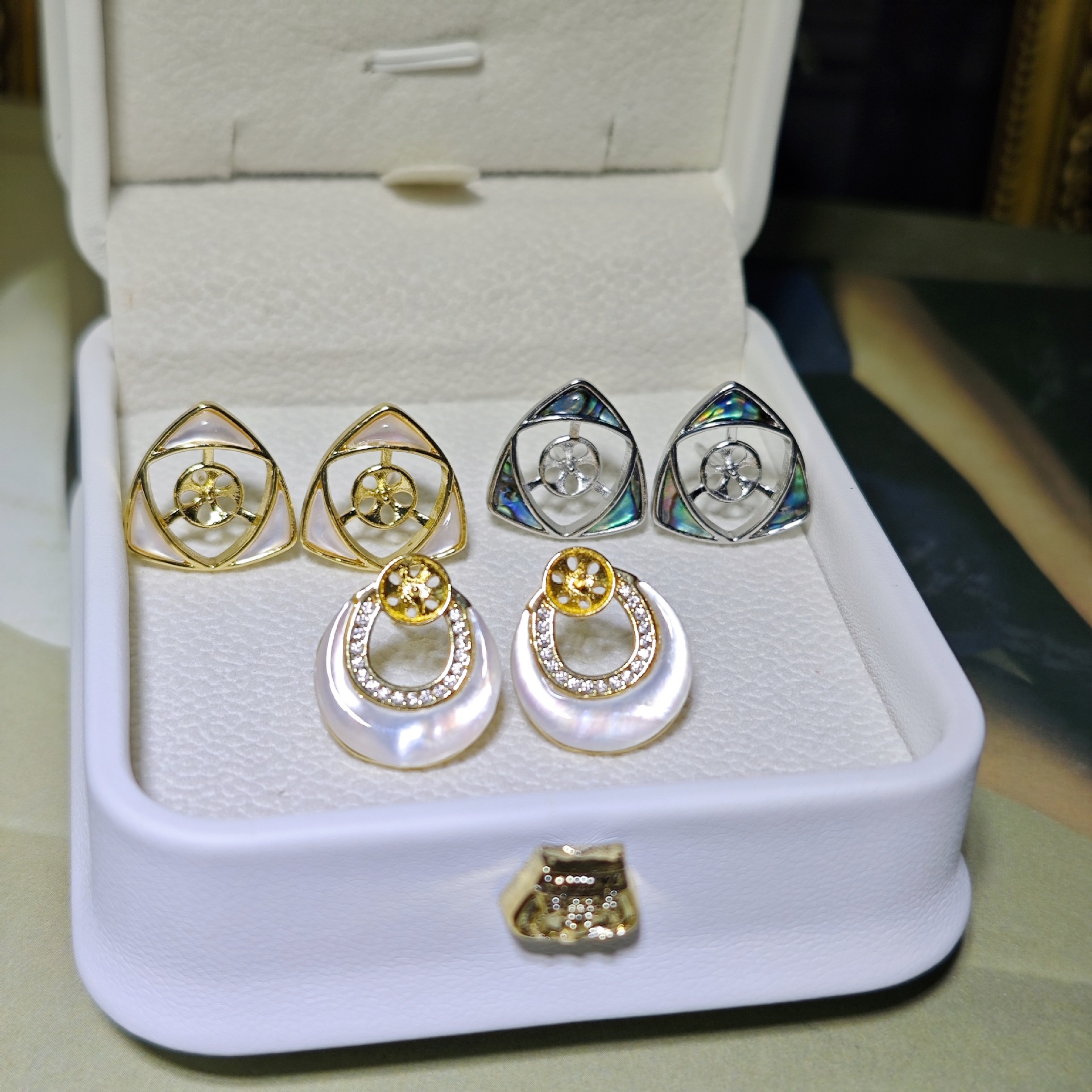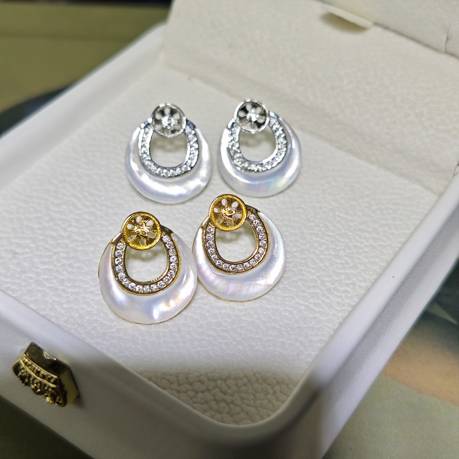 天然贝母手工DIY珍珠耳饰配件女真金电镀18K白金锆石珍珠耳钉空托
