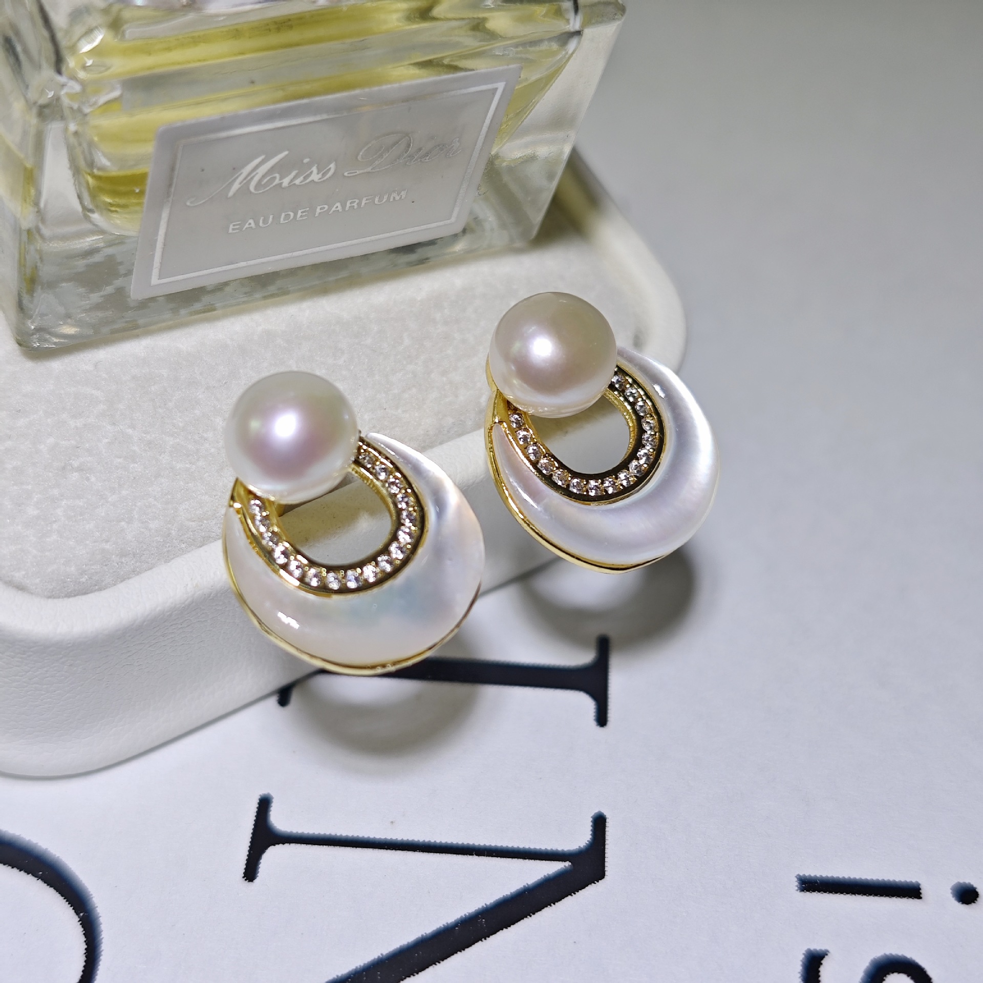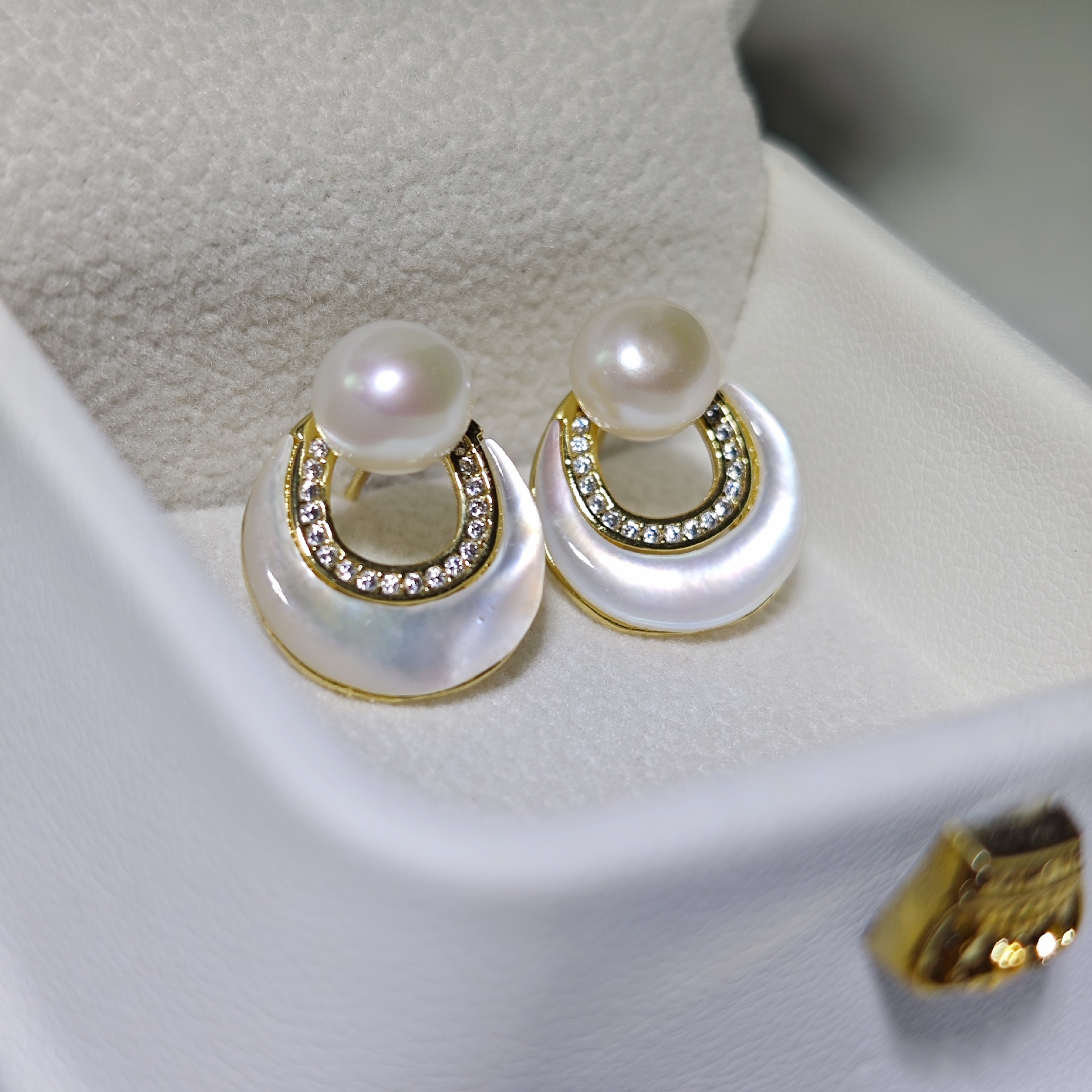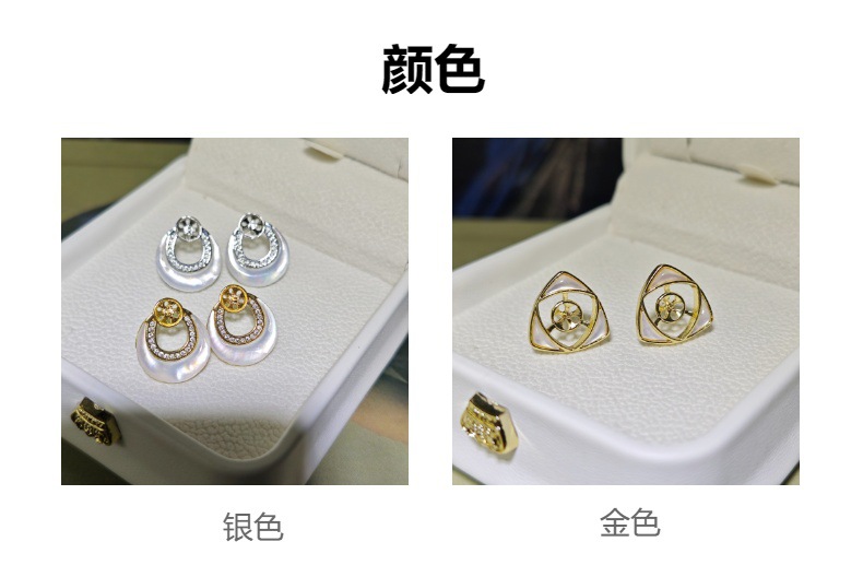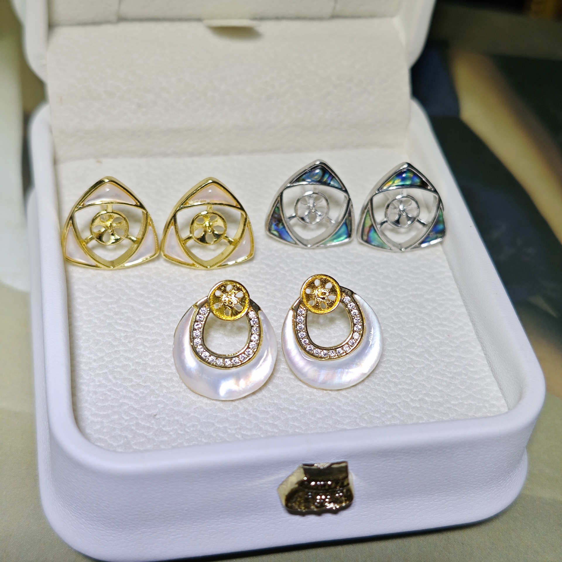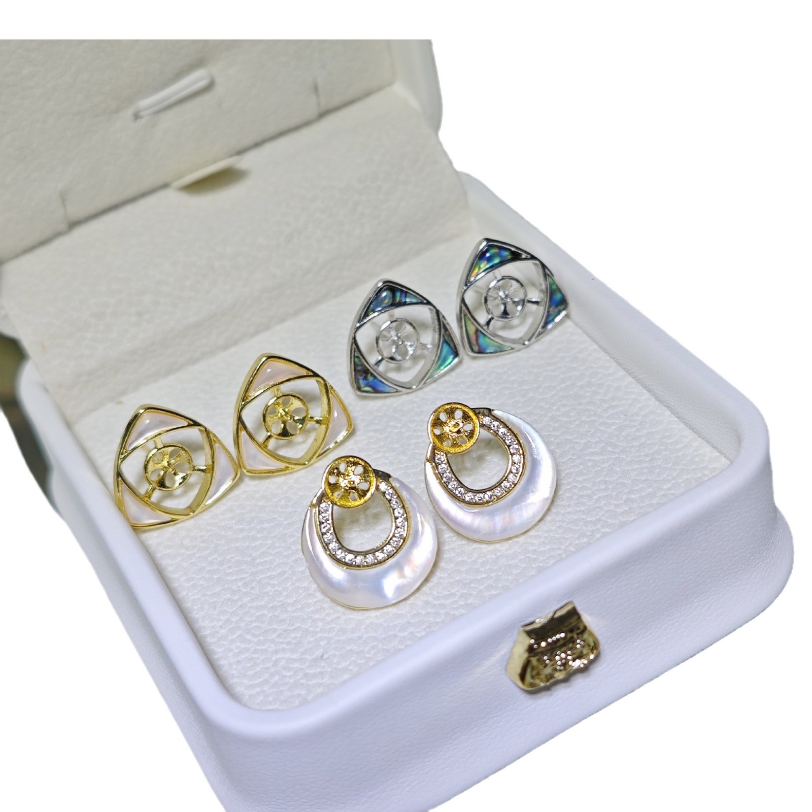 天然贝母手工DIY珍珠耳饰配件女真金电镀18K白金锆石珍珠耳钉空托