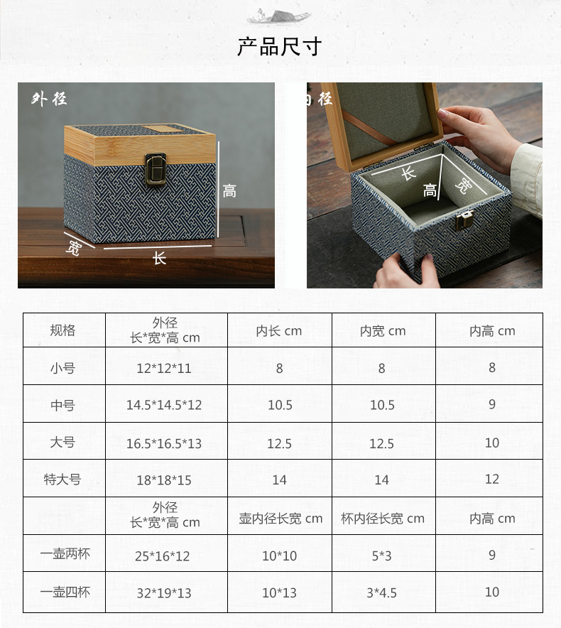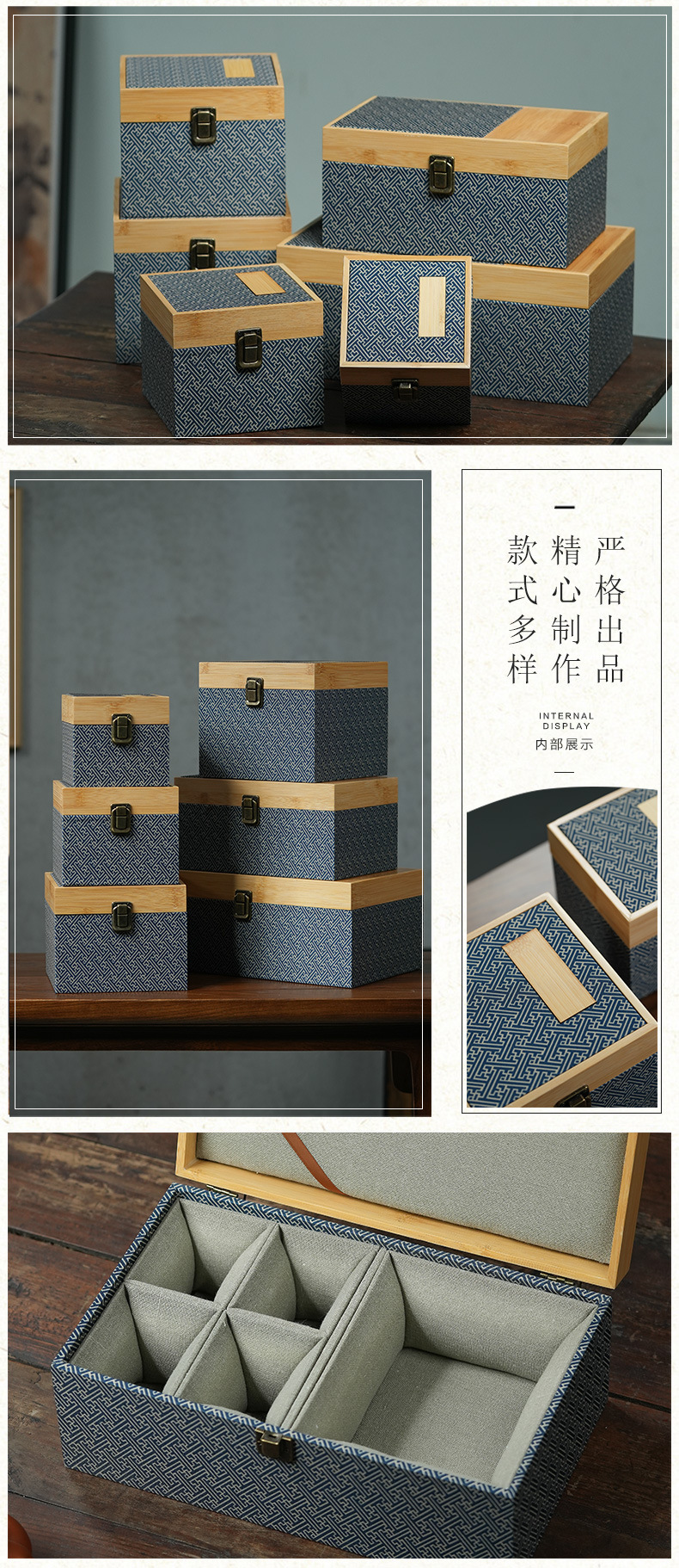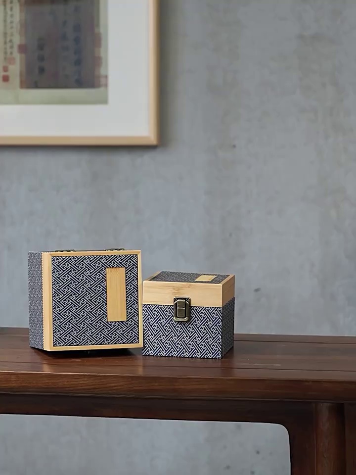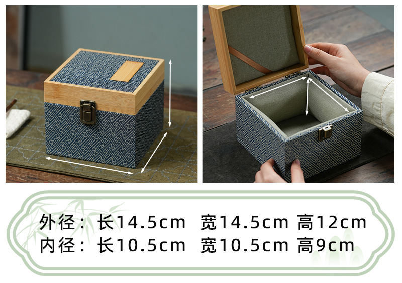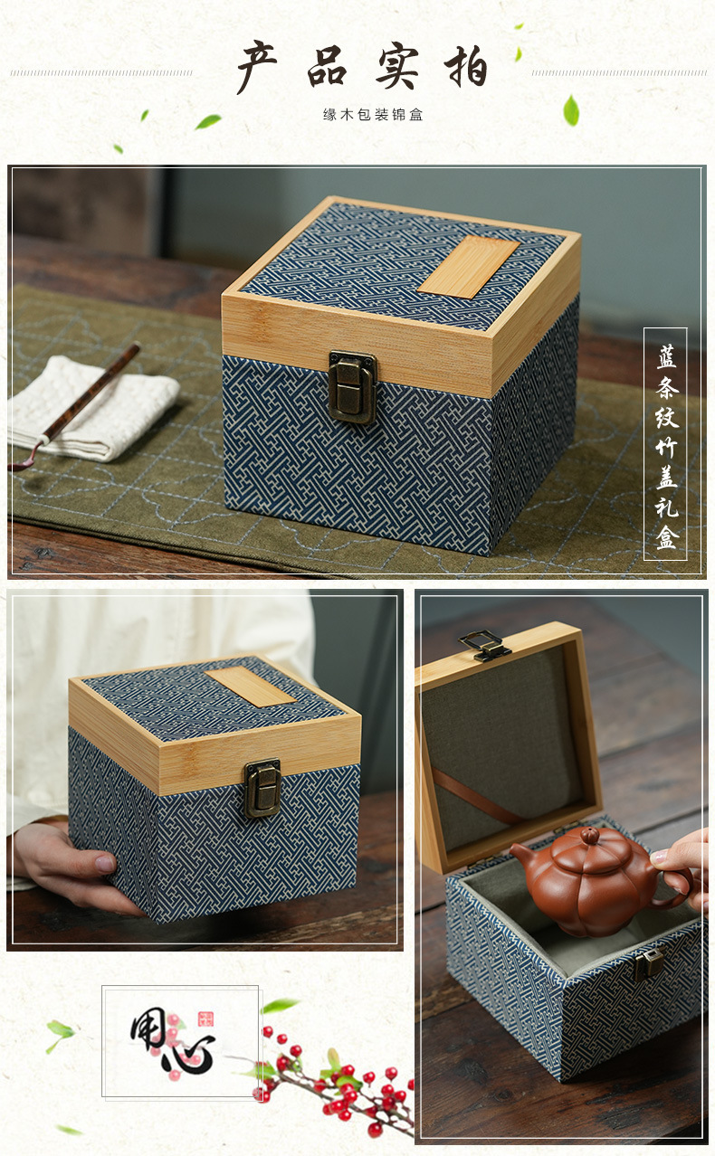 蓝条纹竹盖锦盒 复古国风文玩首饰印章礼品盒紫砂壶包装锦盒