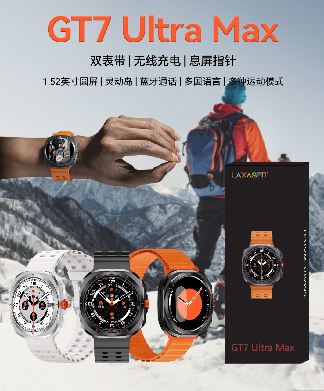新款跨境热卖GT7 UlTRAMAX智能手表圆屏蓝牙通话超低耗能多国语言