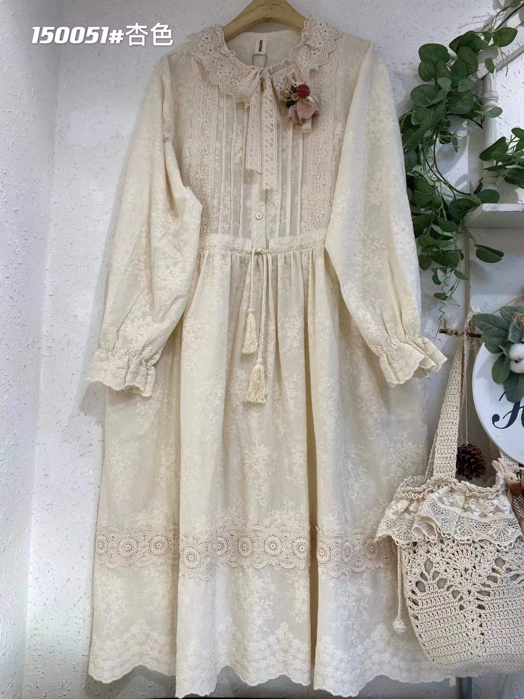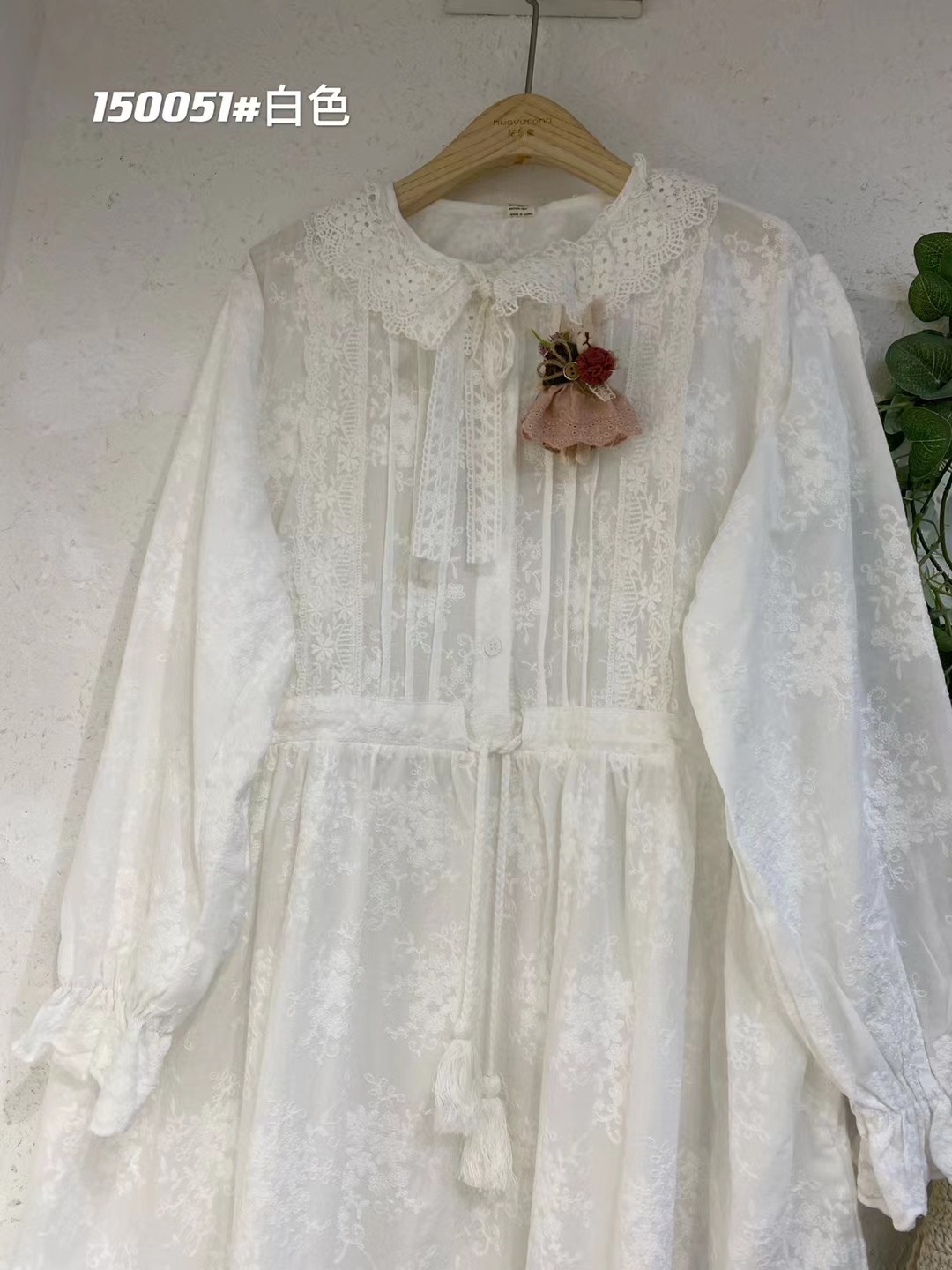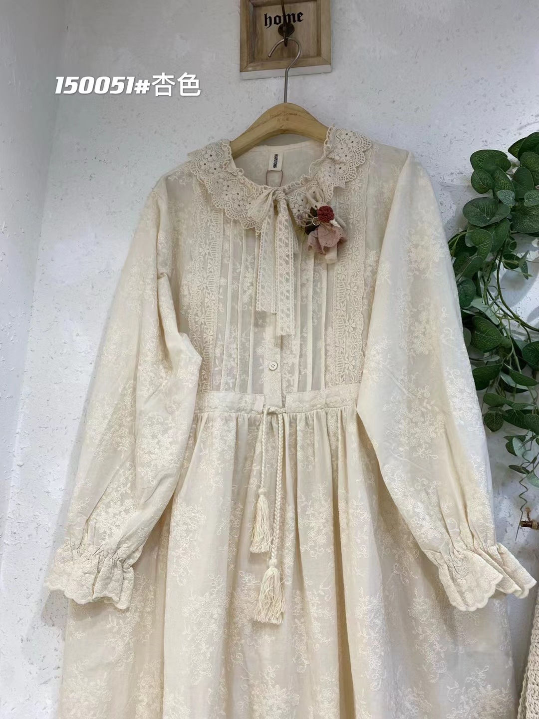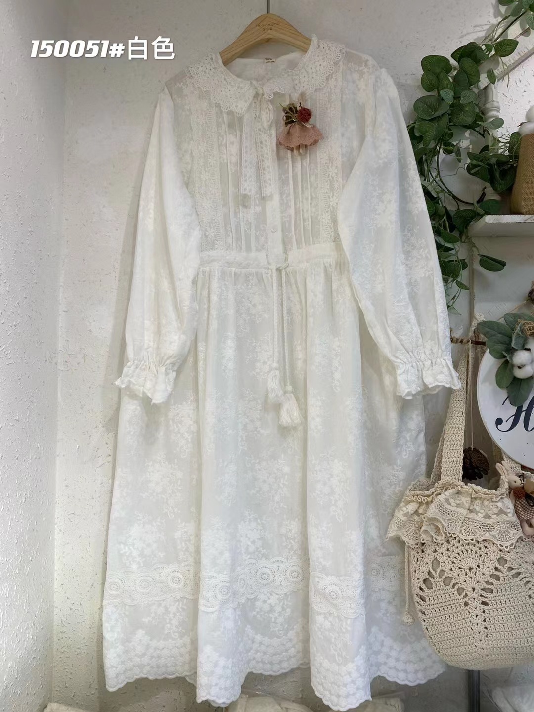 150051森系甜美少女蕾丝重工刺绣连衣裙日系棉绣花收腰娃娃领裙