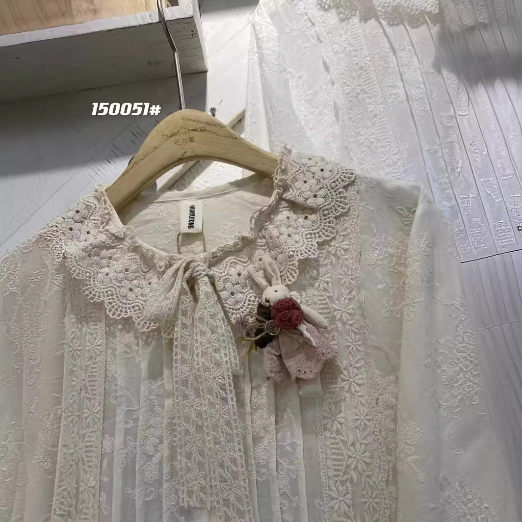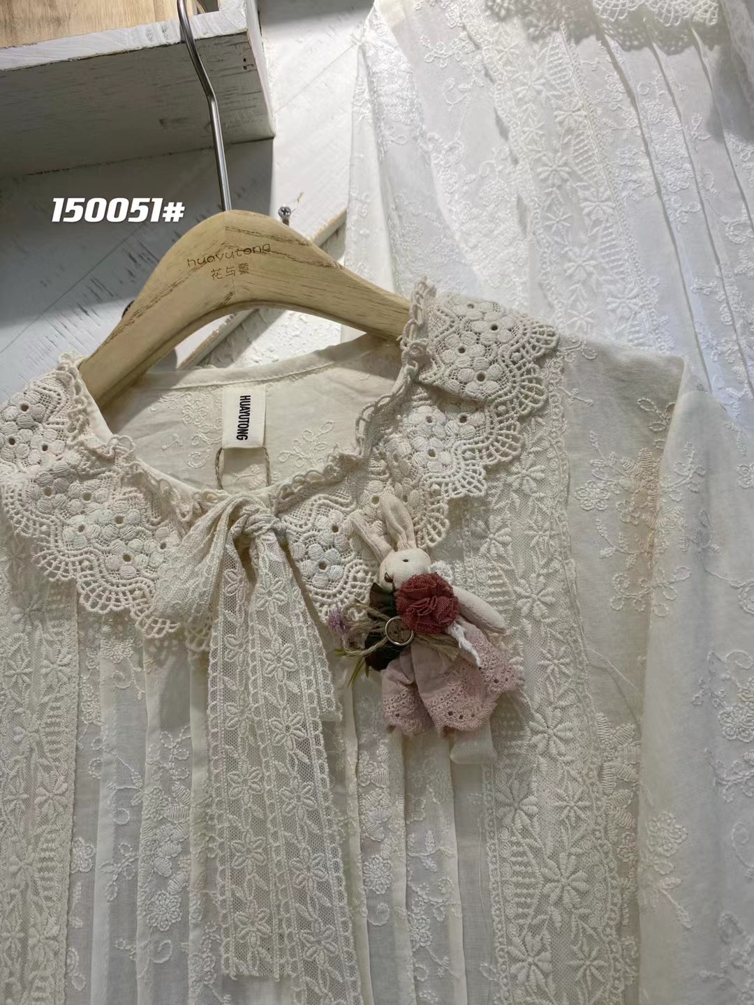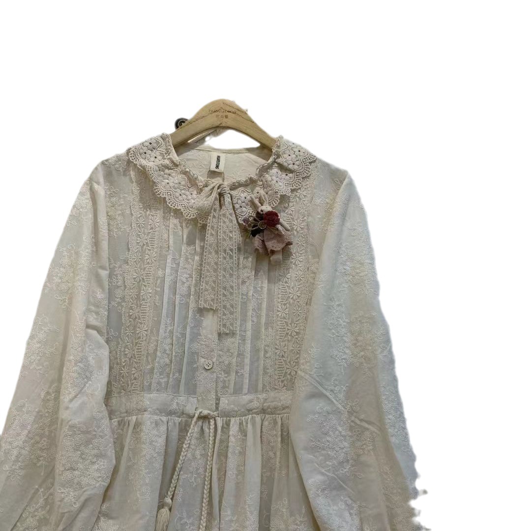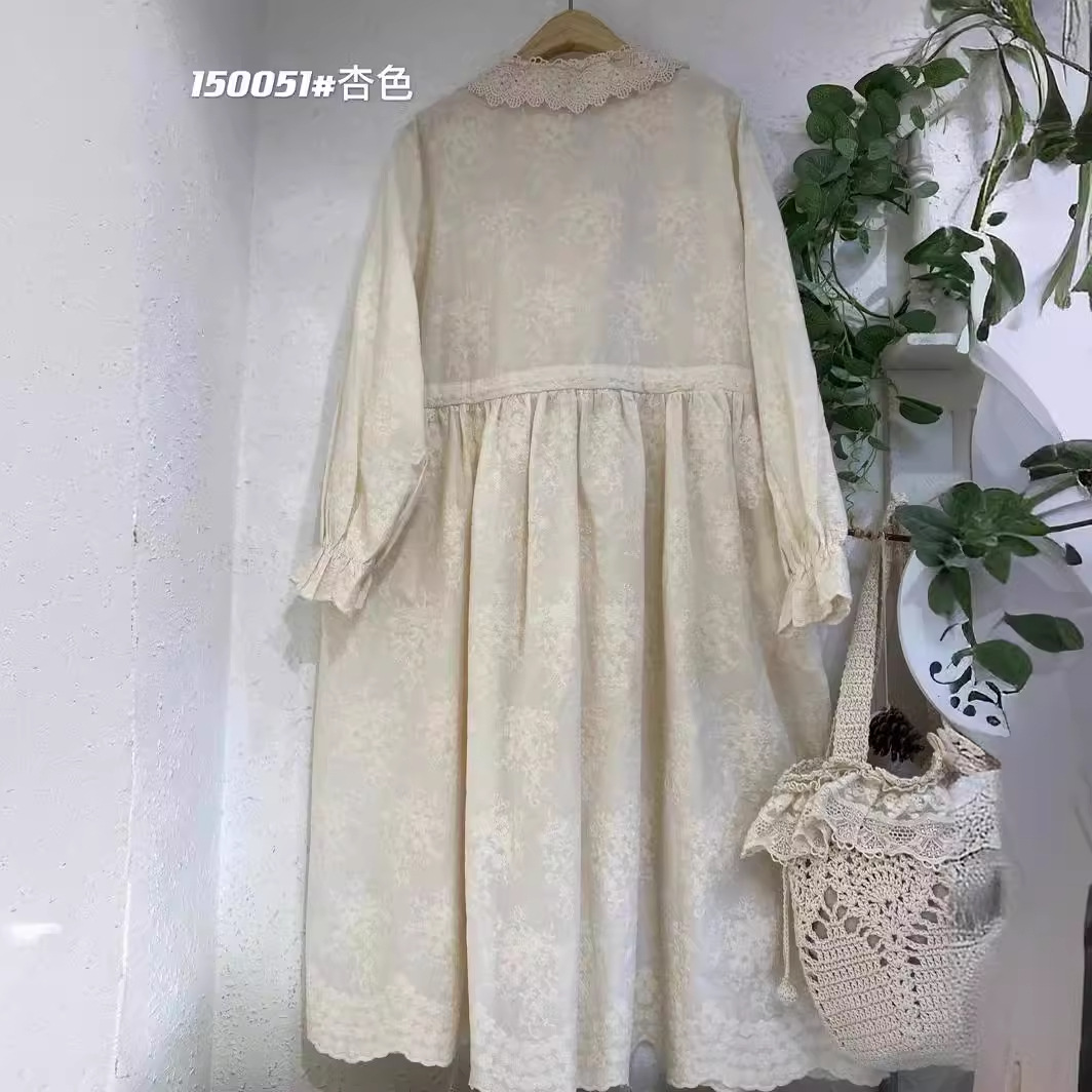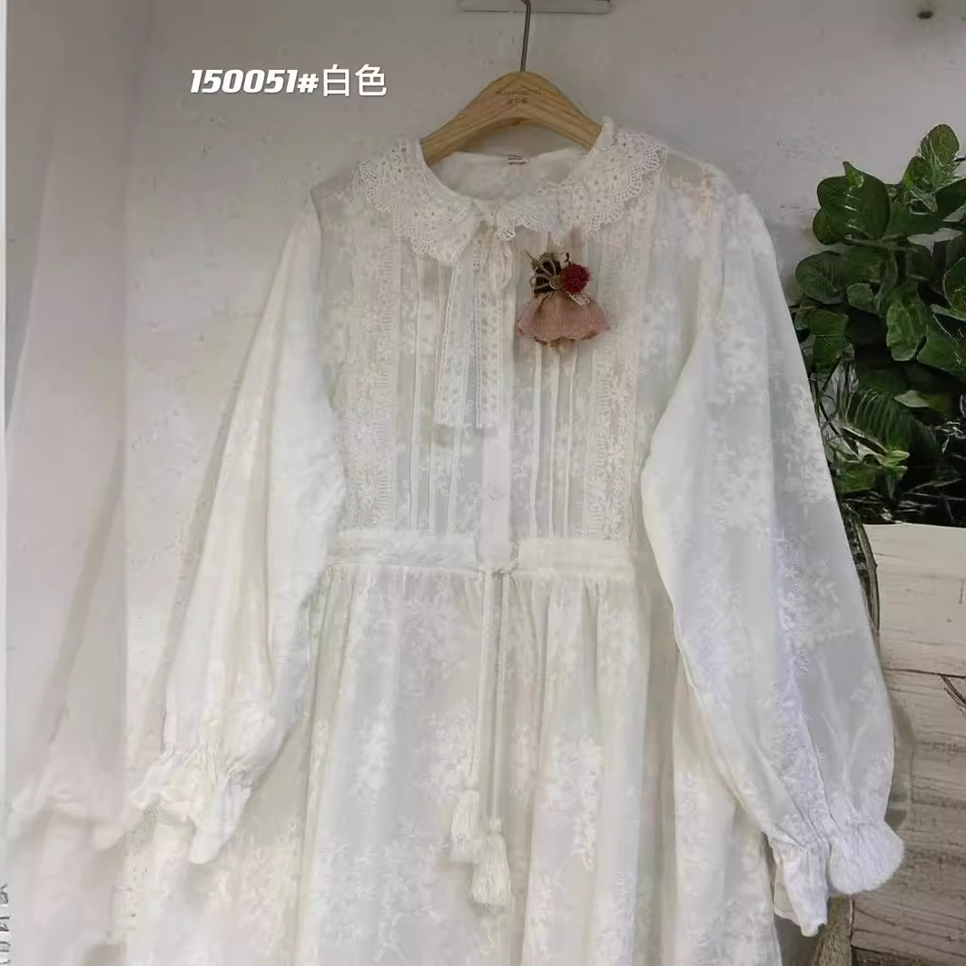 150051森系甜美少女蕾丝重工刺绣连衣裙日系棉绣花收腰娃娃领裙