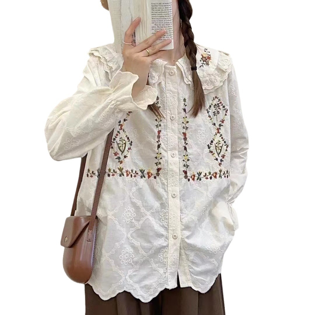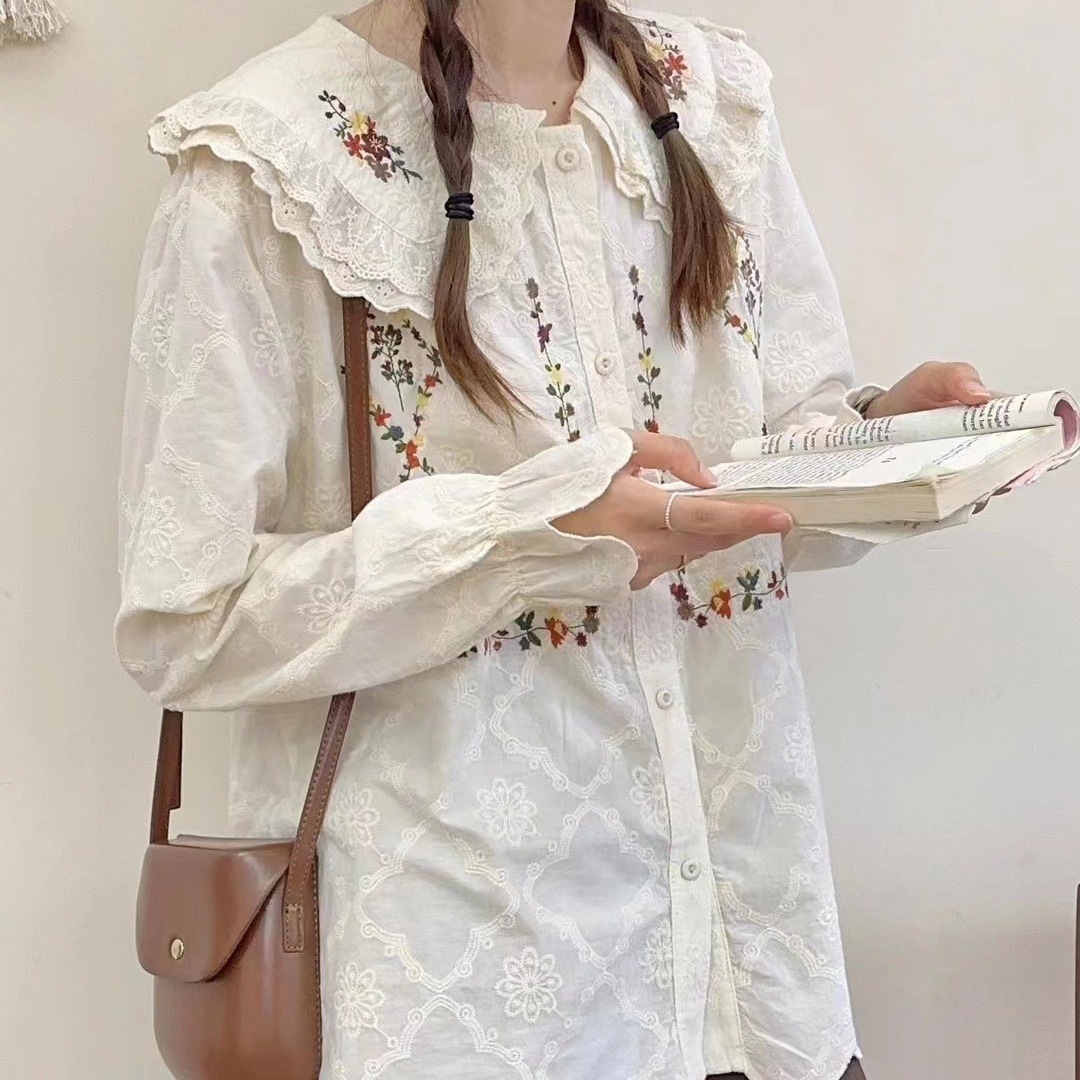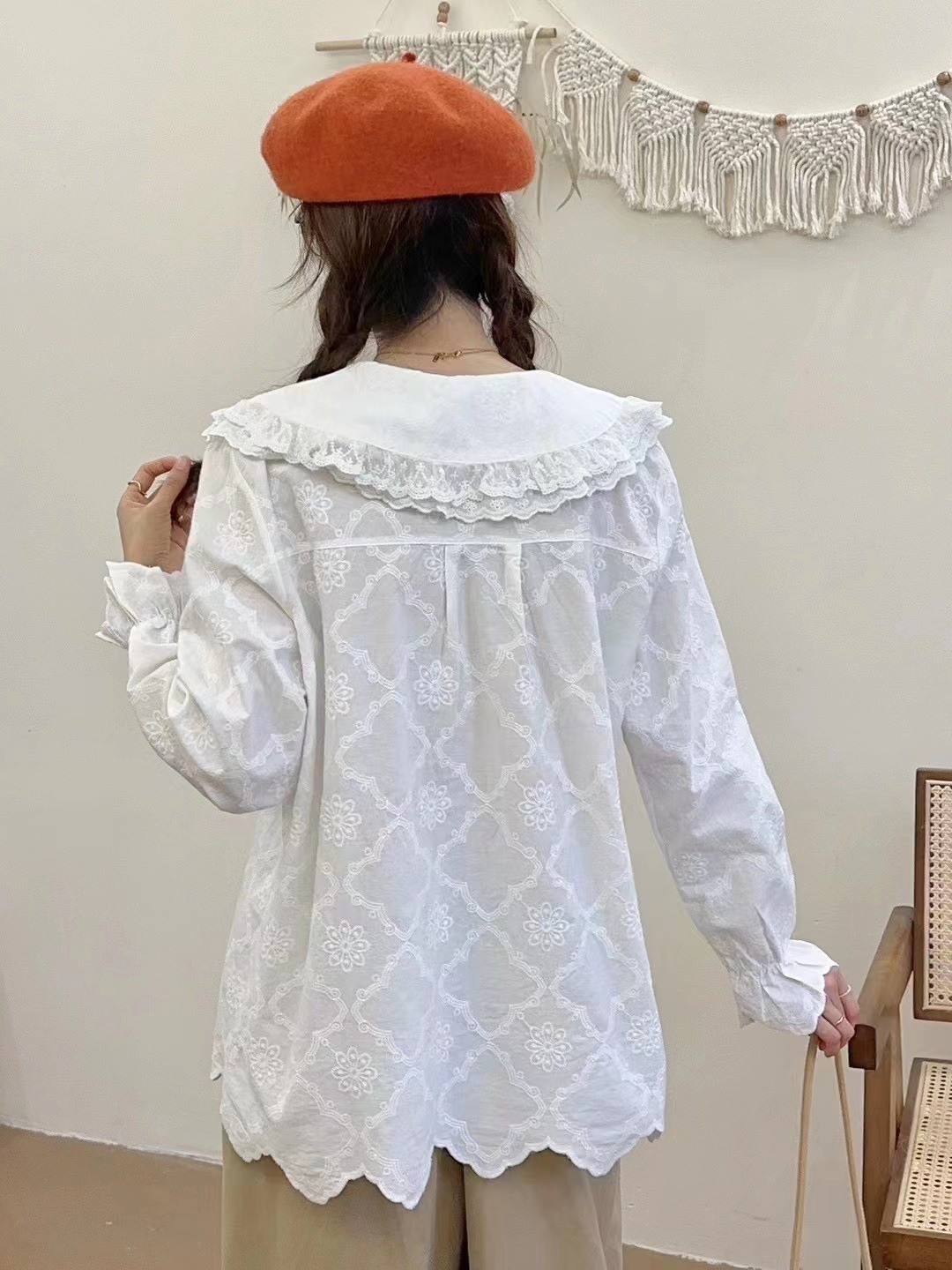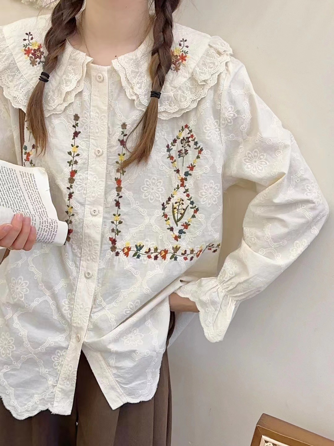 森系刺绣蕾丝花边娃娃领衬衫女春季新款甜美减龄百搭全棉提花上衣