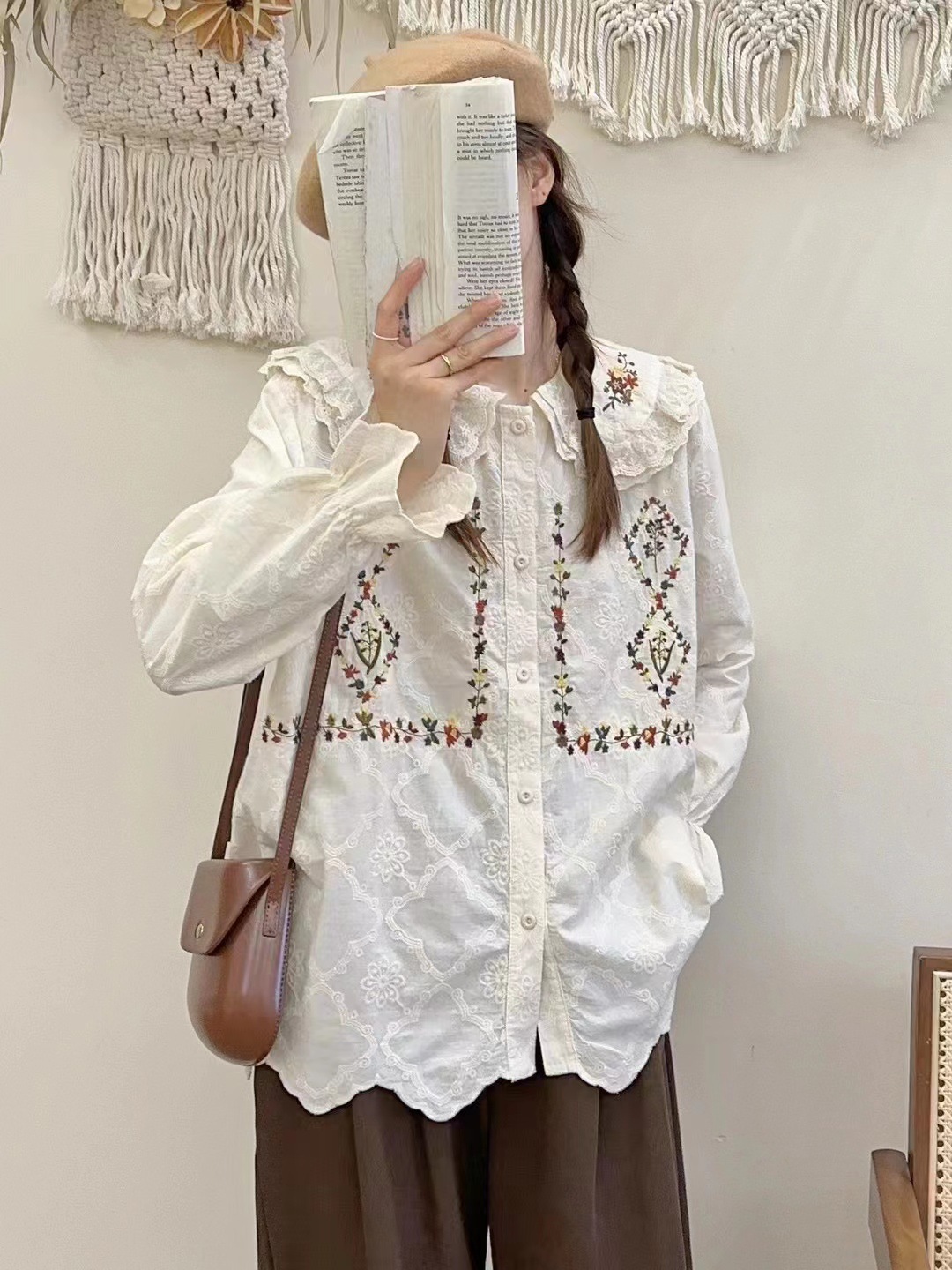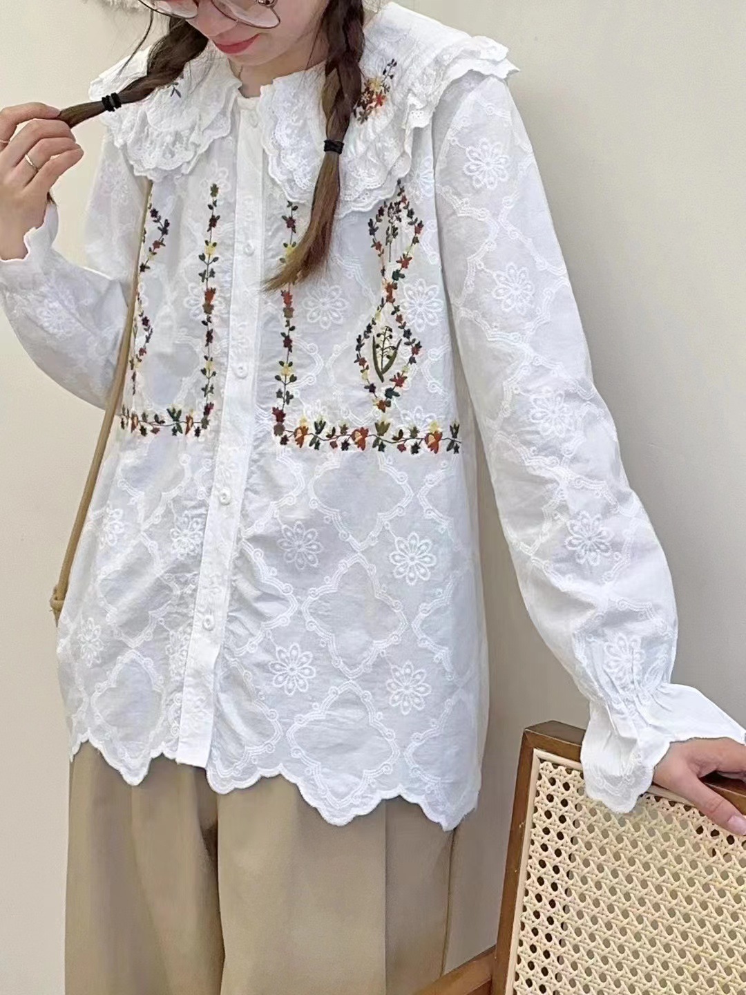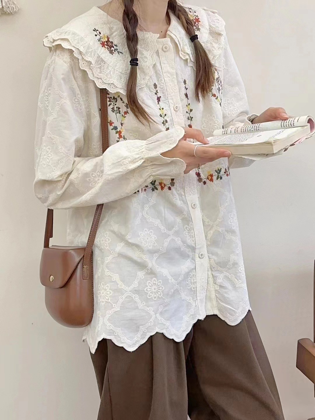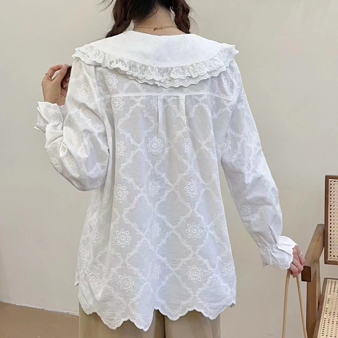 森系刺绣蕾丝花边娃娃领衬衫女春季新款甜美减龄百搭全棉提花上衣