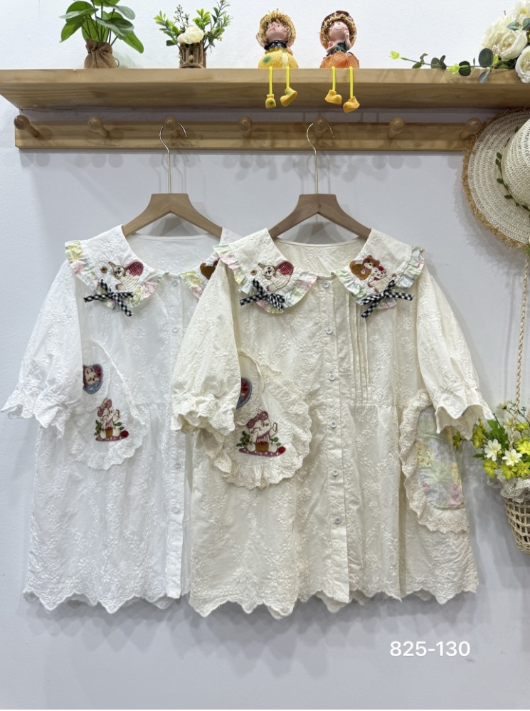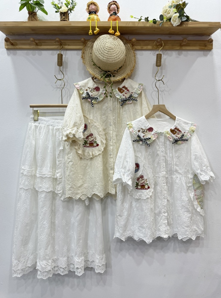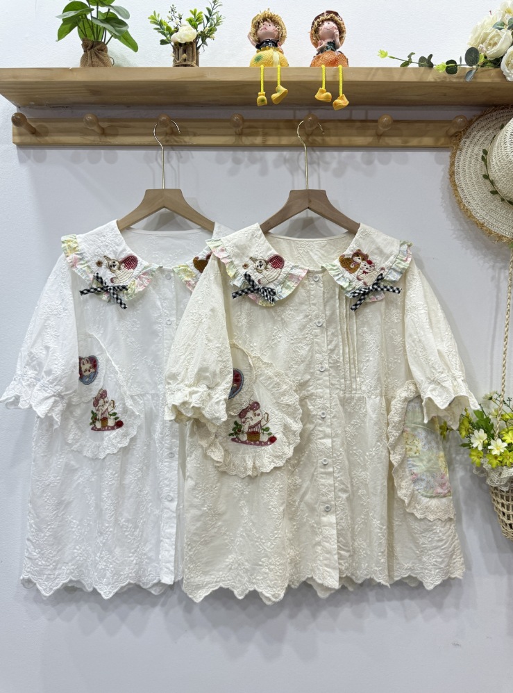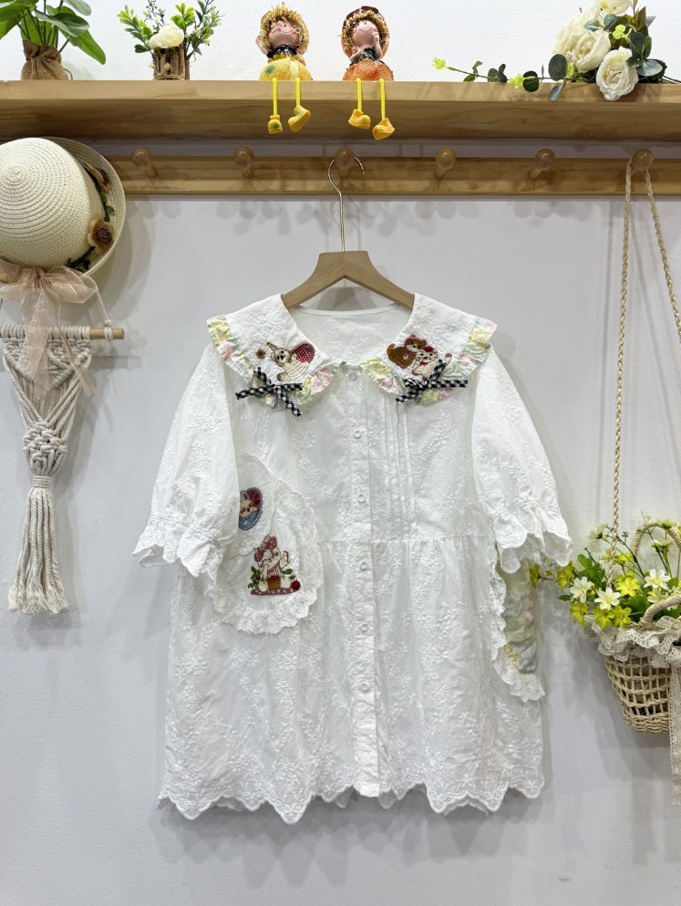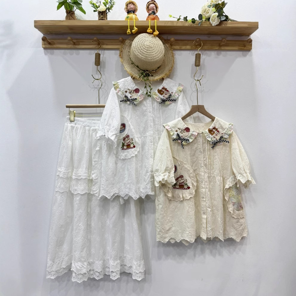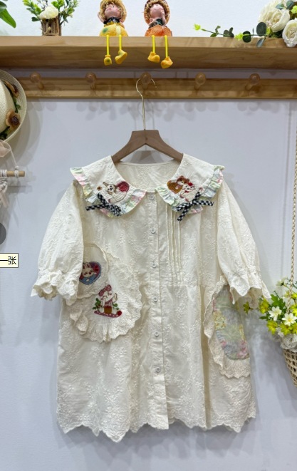2025新款刺绣蕾丝娃娃领衬衫森女系胸前拼接蕾丝花边衬衫上衣