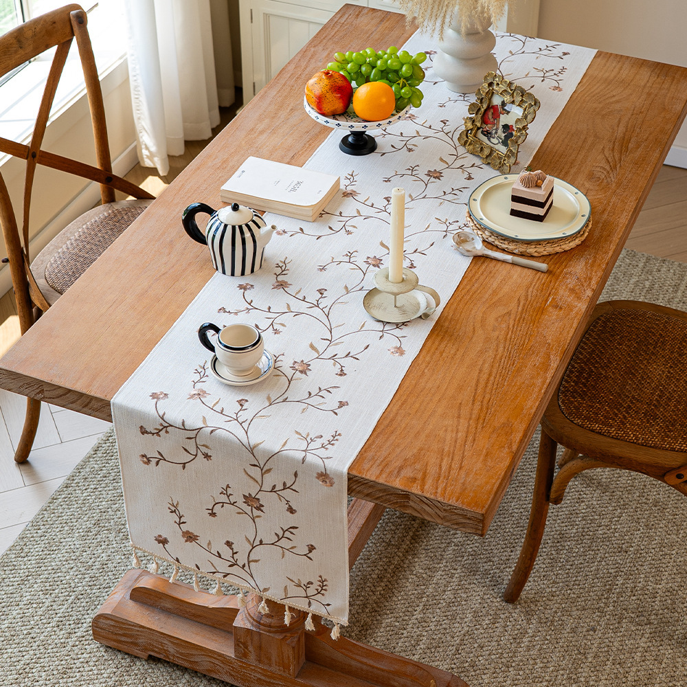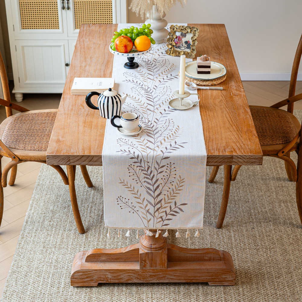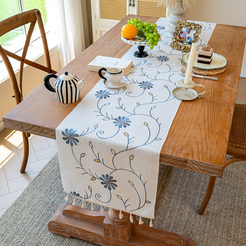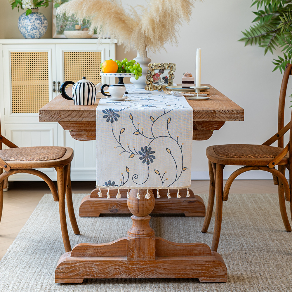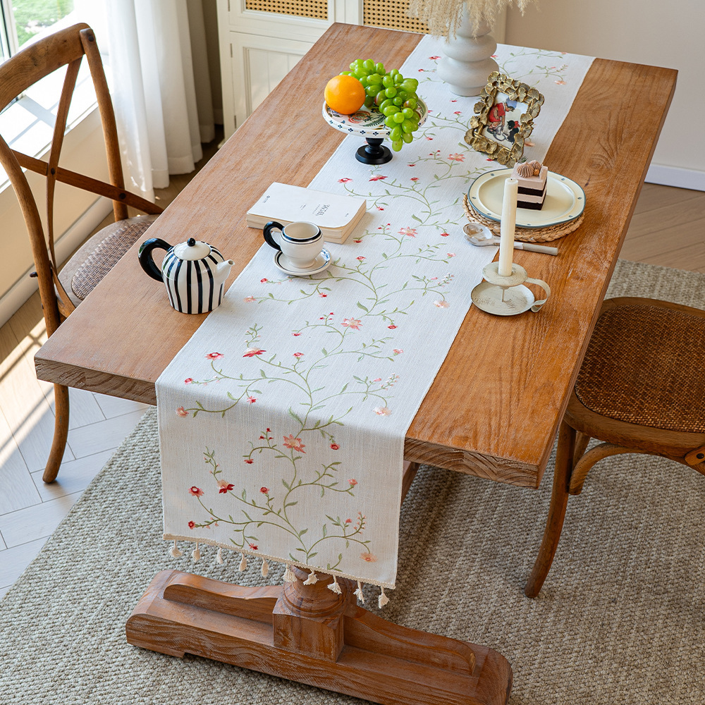 北欧新款桌旗跨境专供植物花卉绣花长条布艺流苏家用茶几桌垫批发