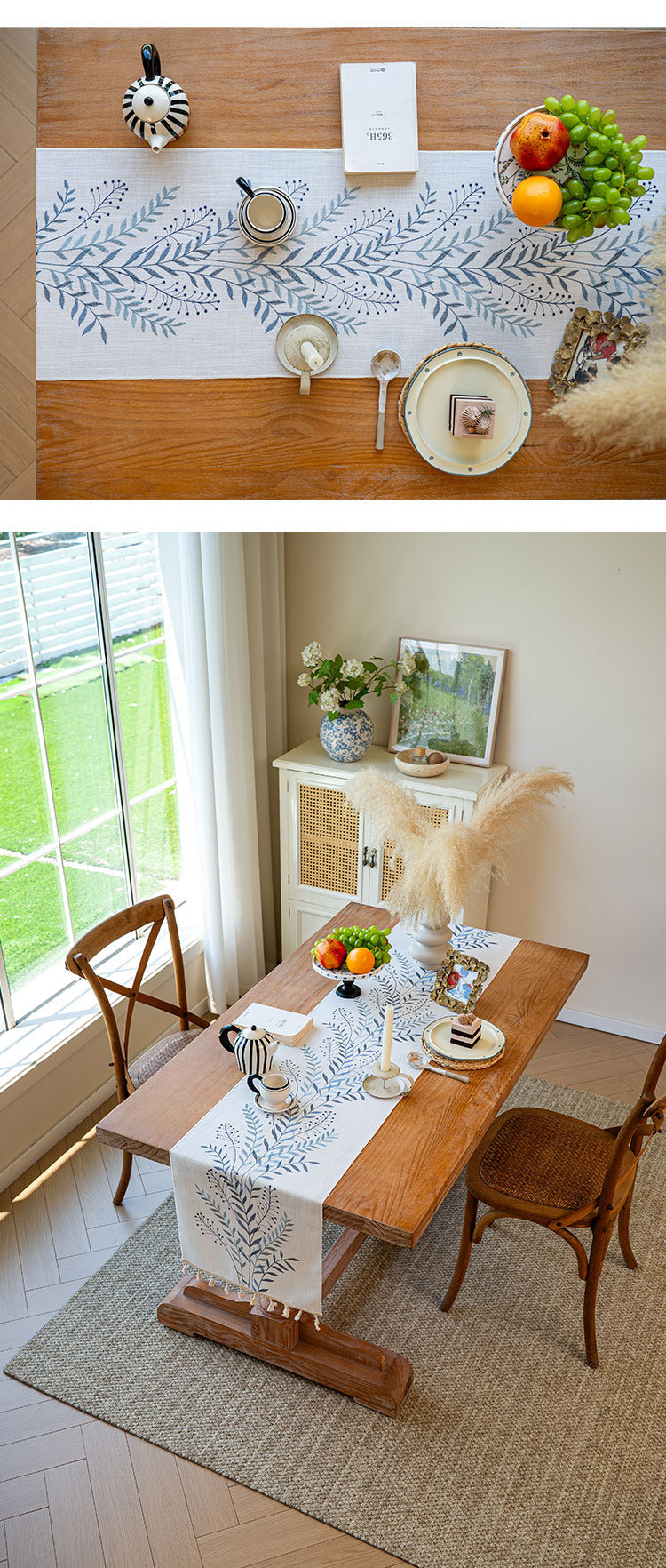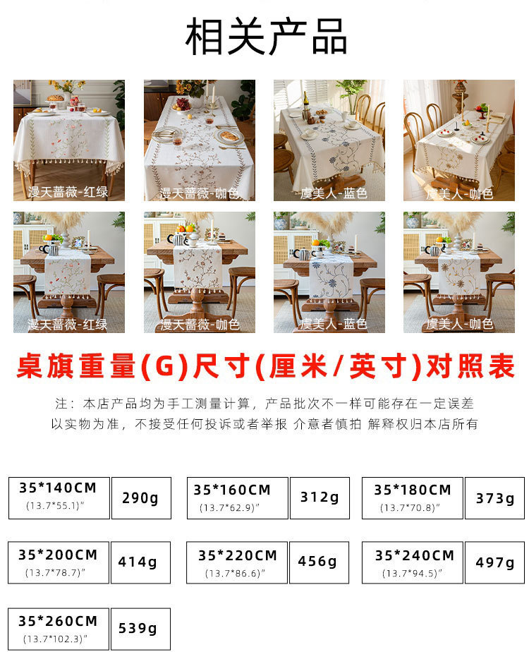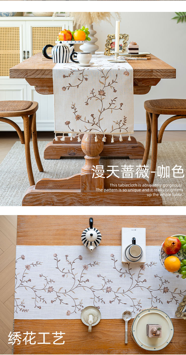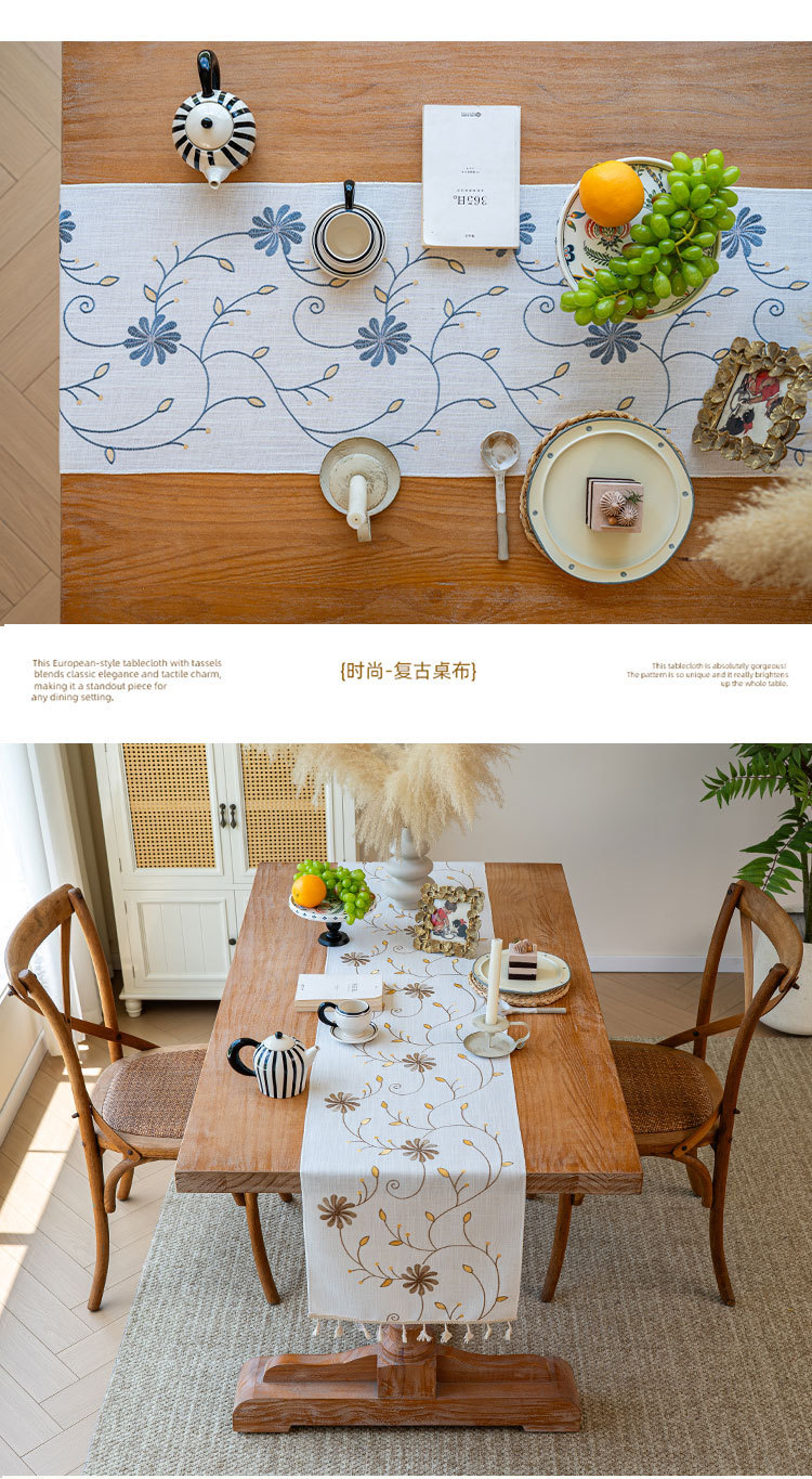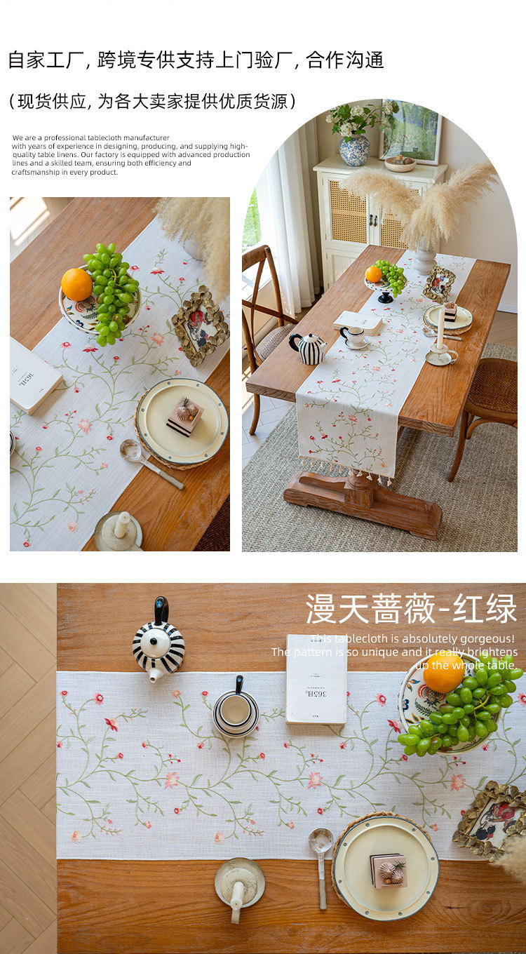 北欧新款桌旗跨境专供植物花卉绣花长条布艺流苏家用茶几桌垫批发