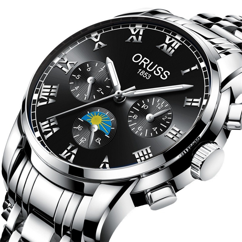 爆款手表男士腕表实心钢带防水双日历商务石英表工厂批发