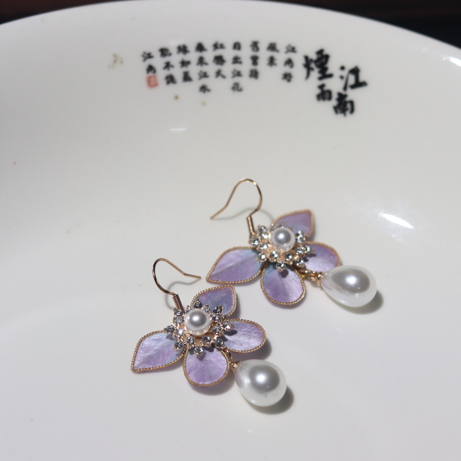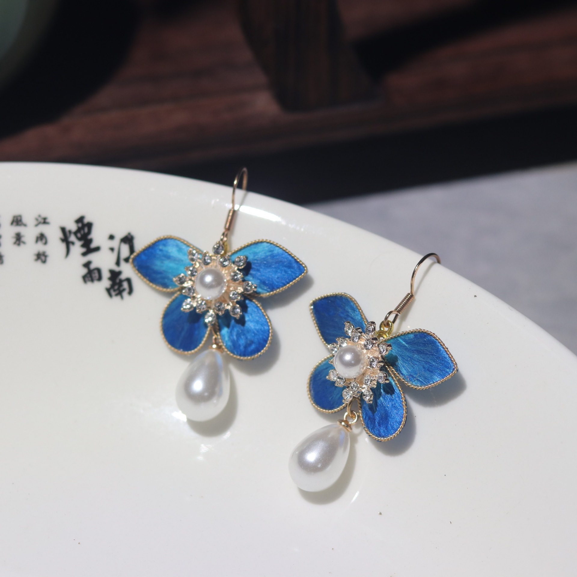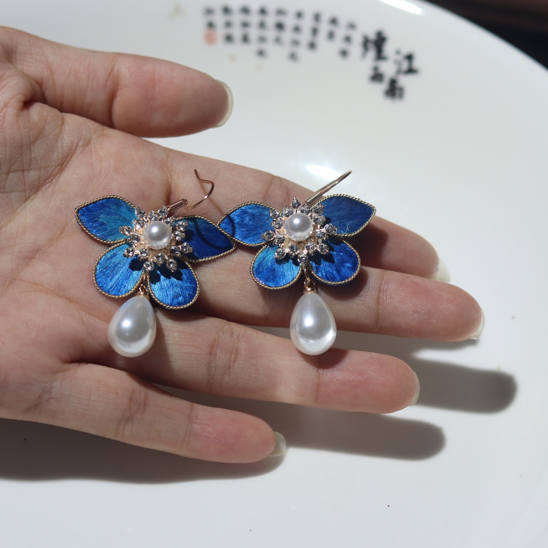 非遗掐丝绒花蚕丝仿点翠蝴蝶珍珠耳环日常旗袍古风汉服耳饰品