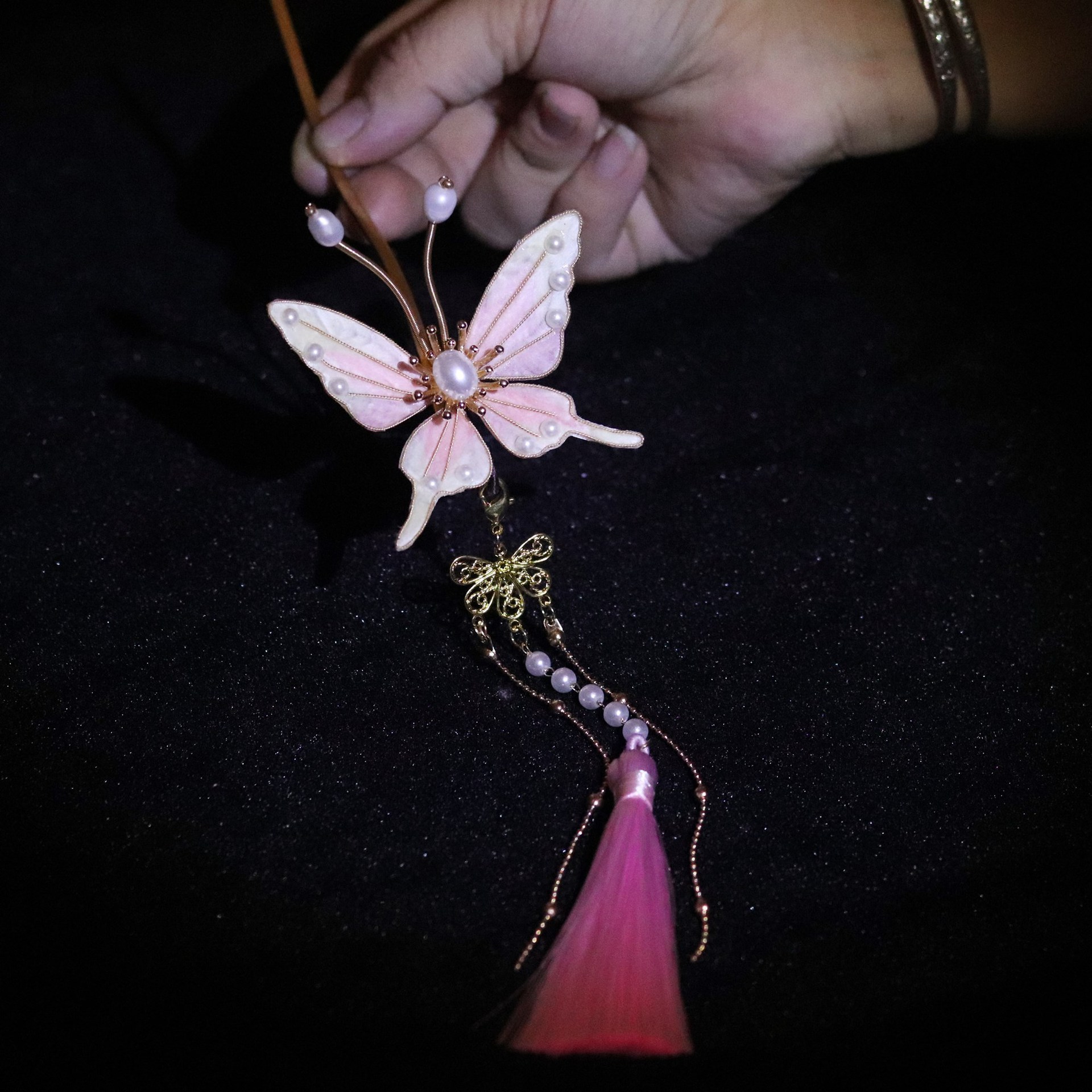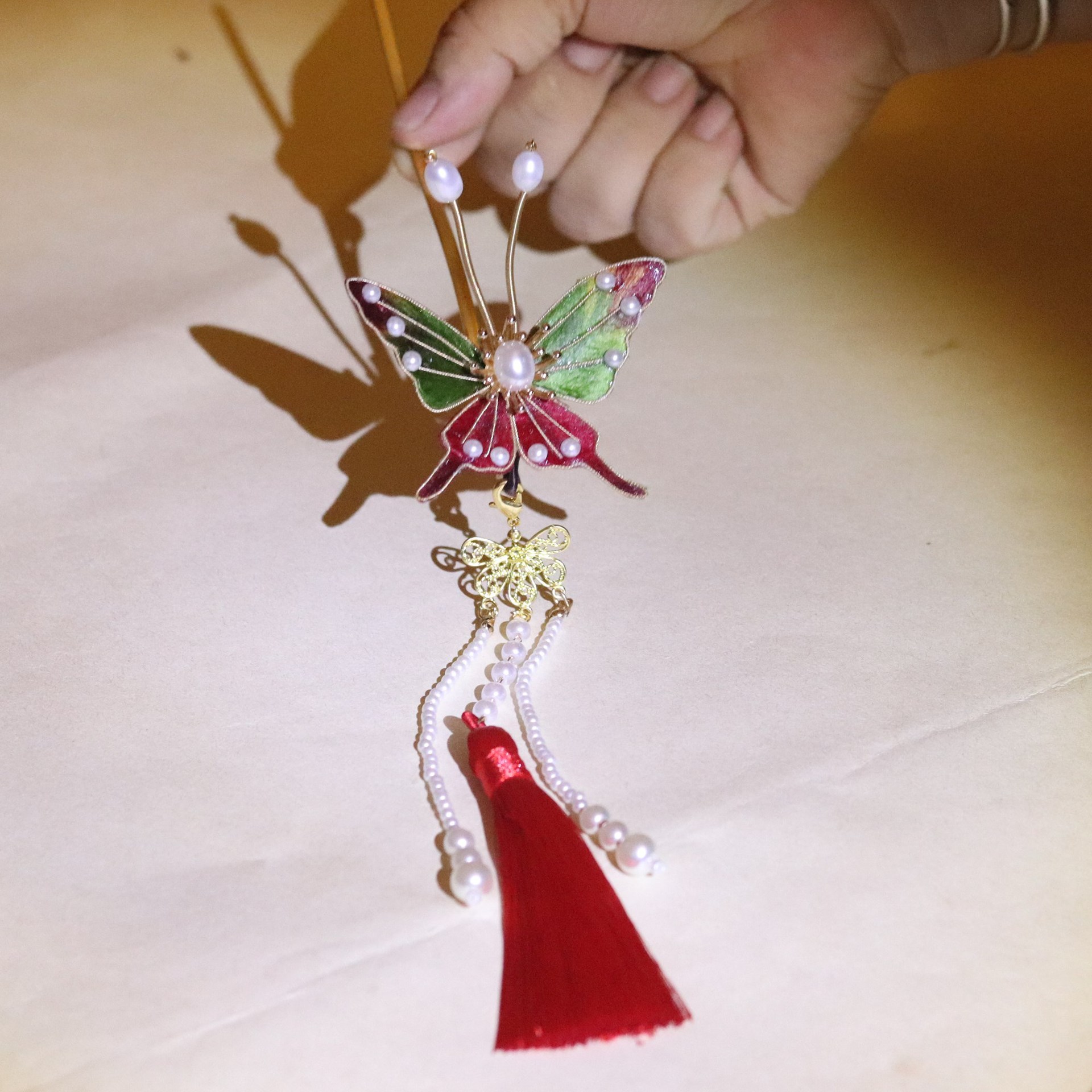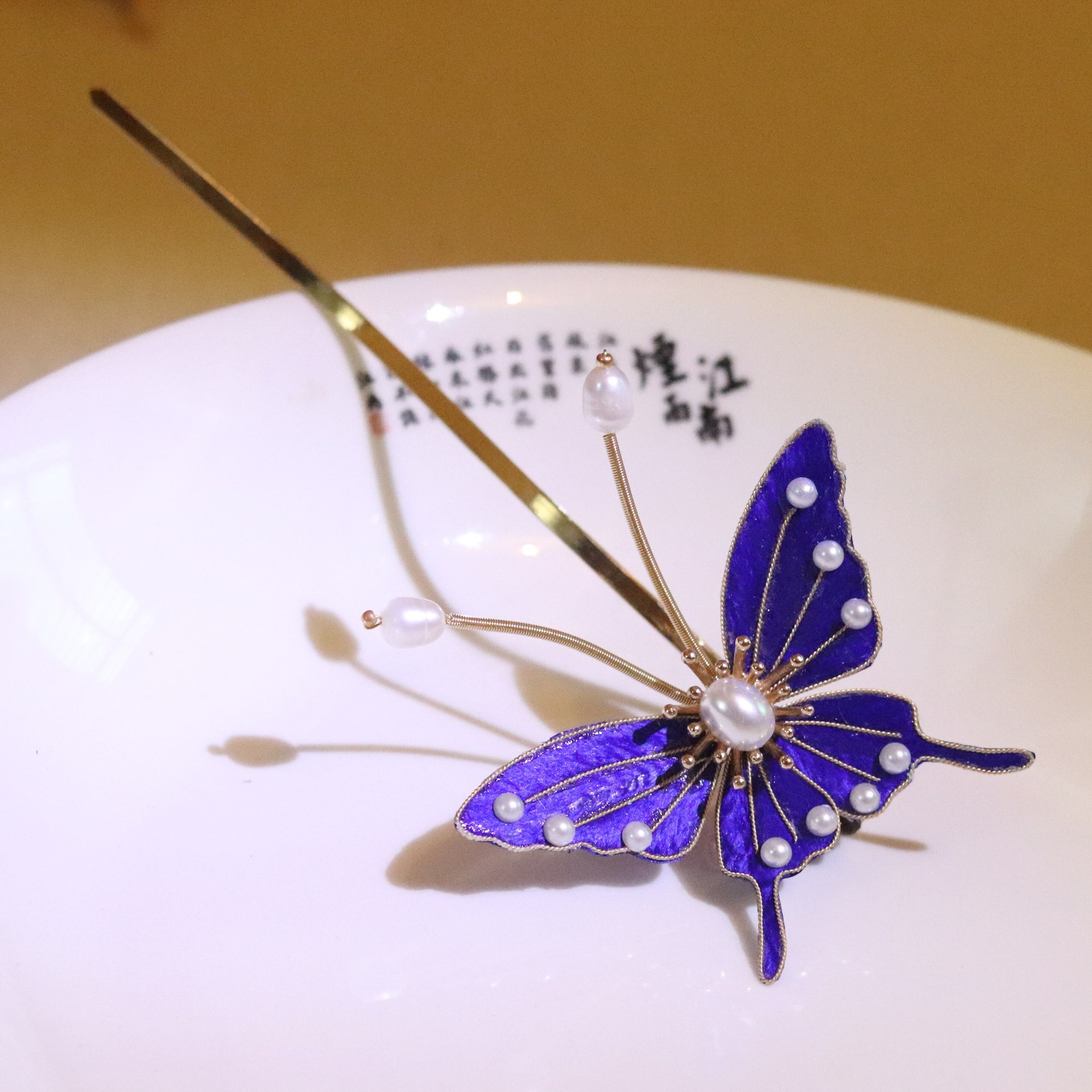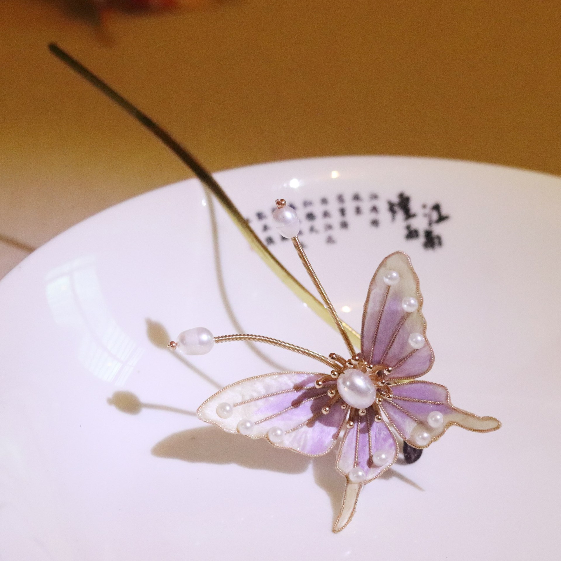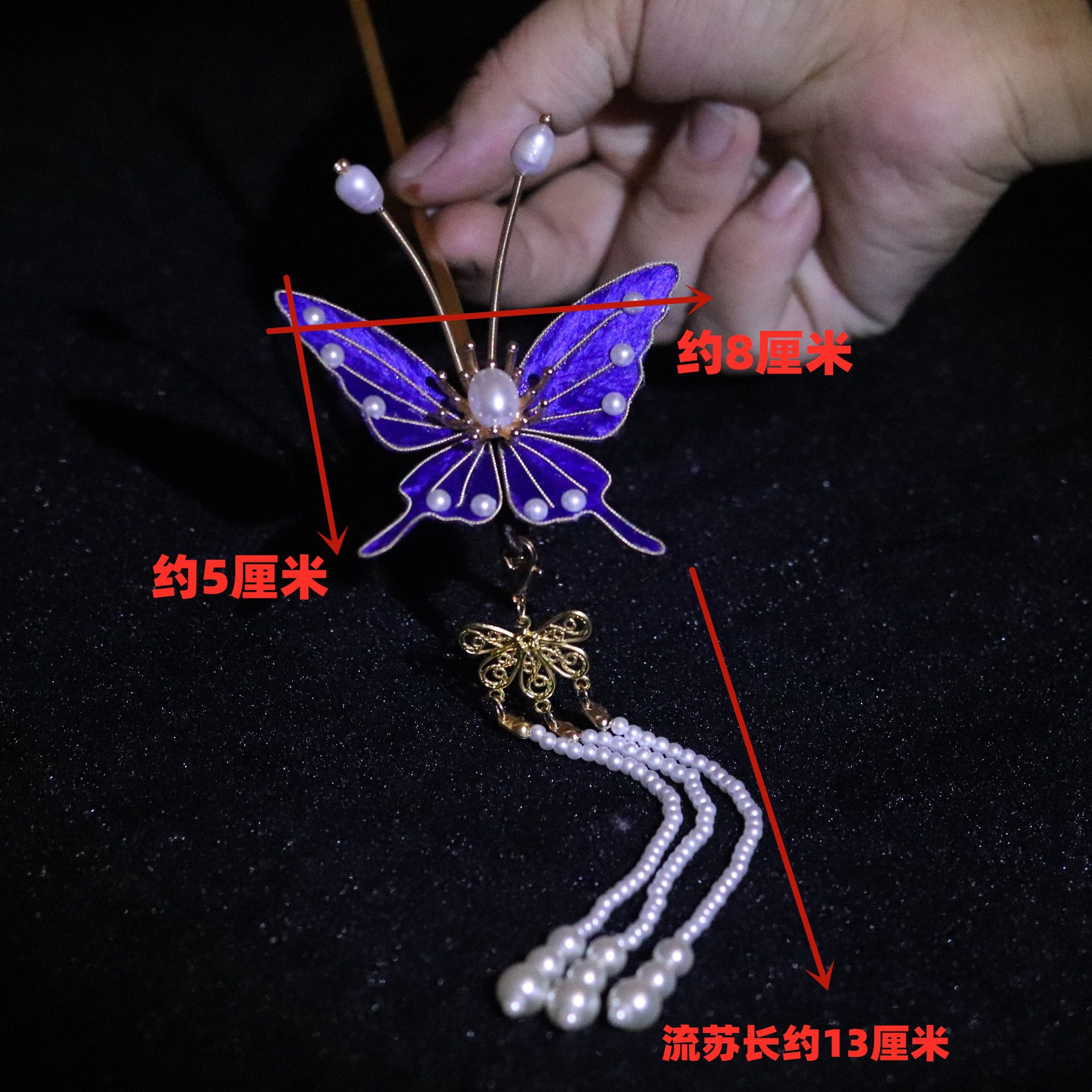 绒花掐丝蝴蝶蚕丝流苏发钗古风汉服配饰步摇简约头饰发簪饰品