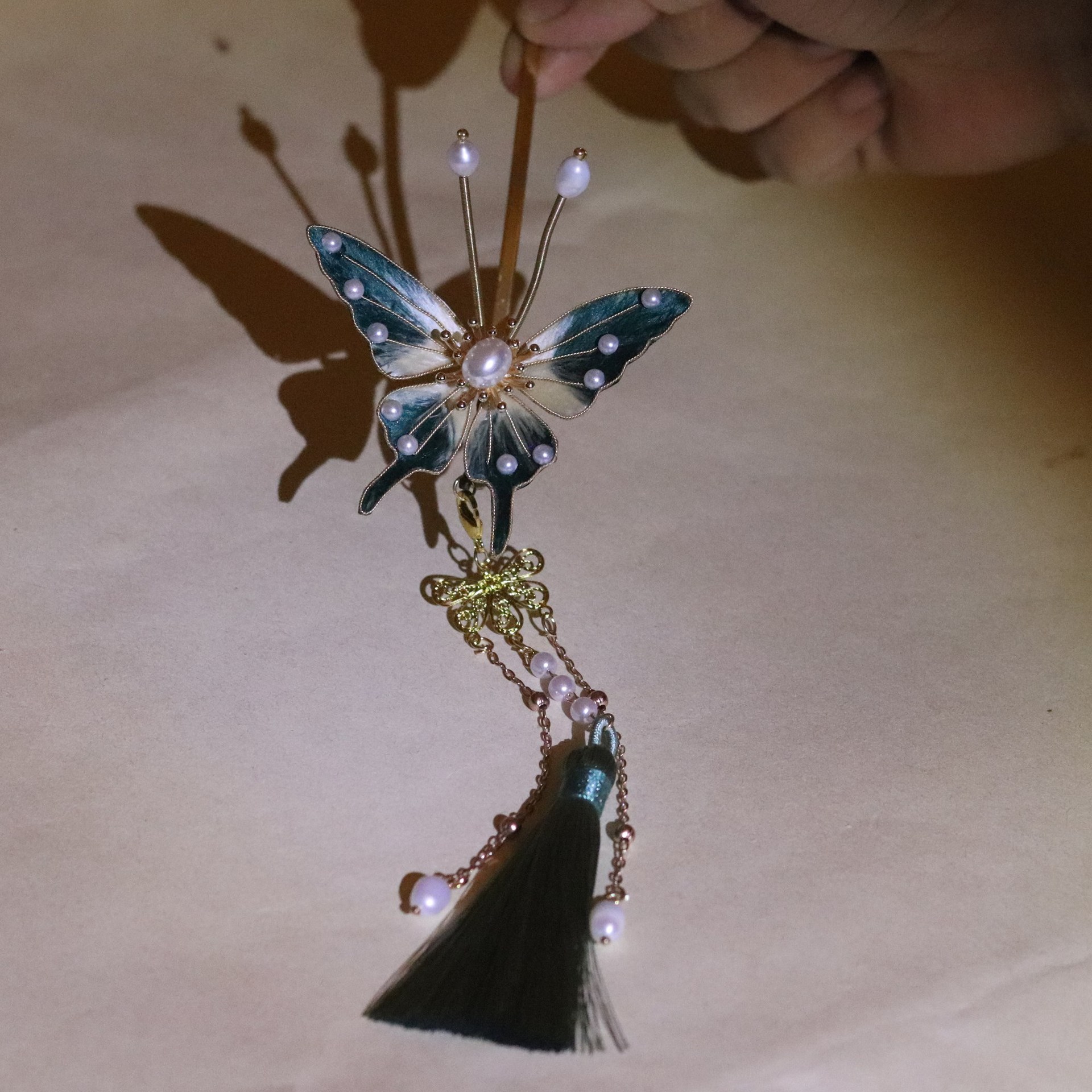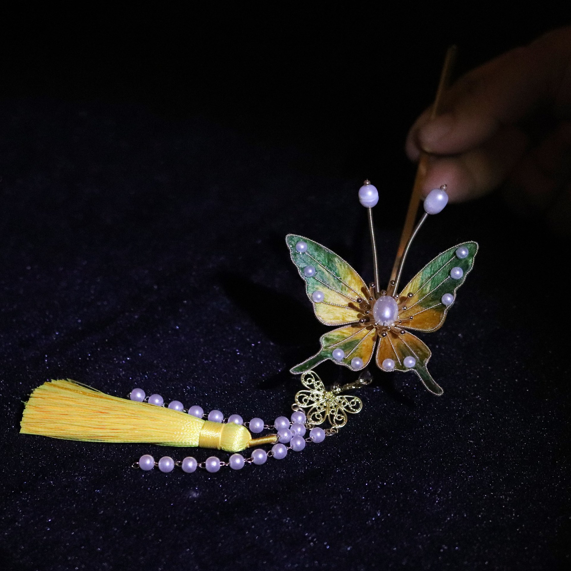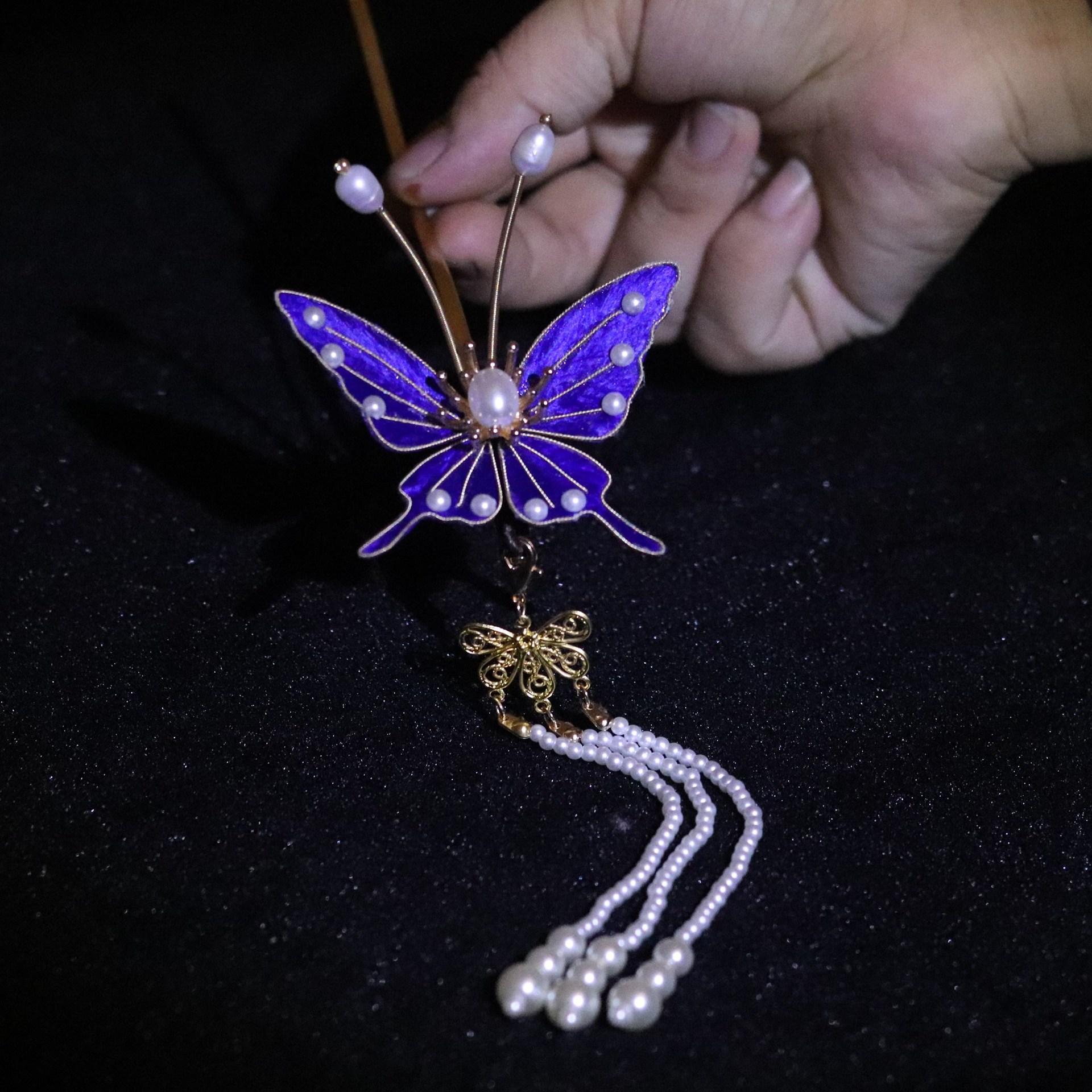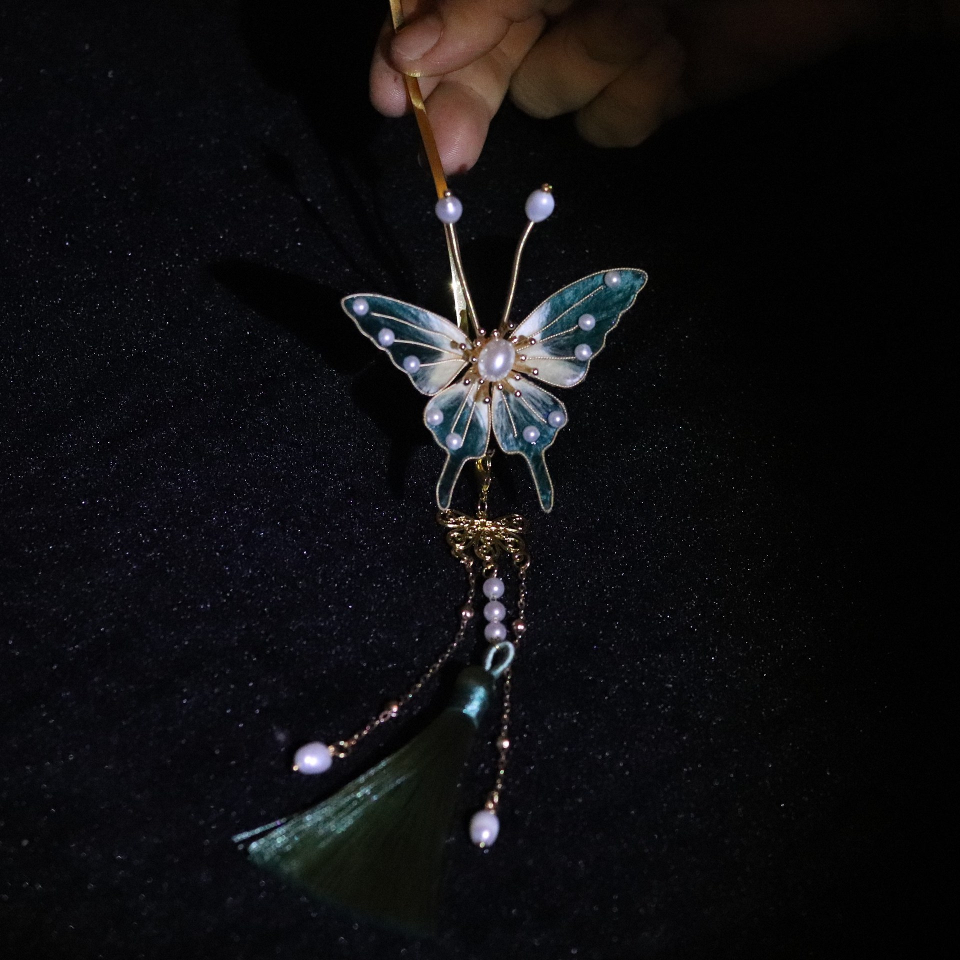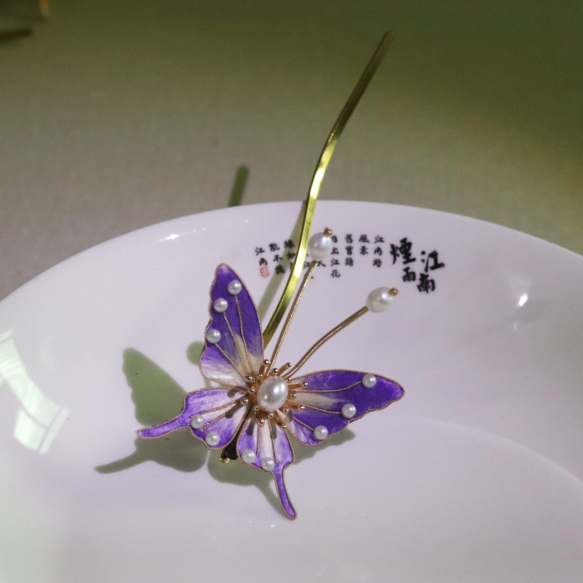 绒花掐丝蝴蝶蚕丝流苏发钗古风汉服配饰步摇简约头饰发簪饰品